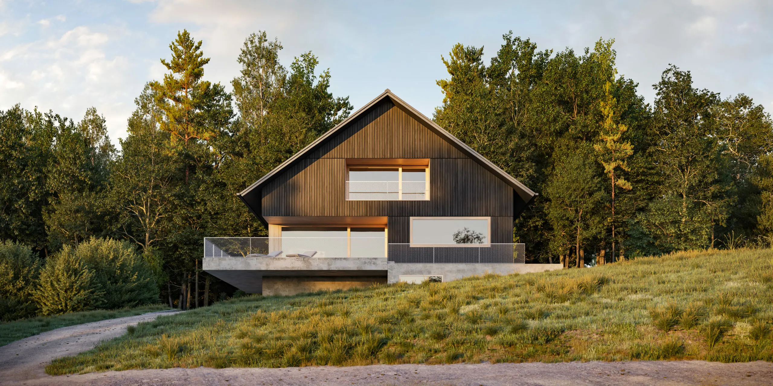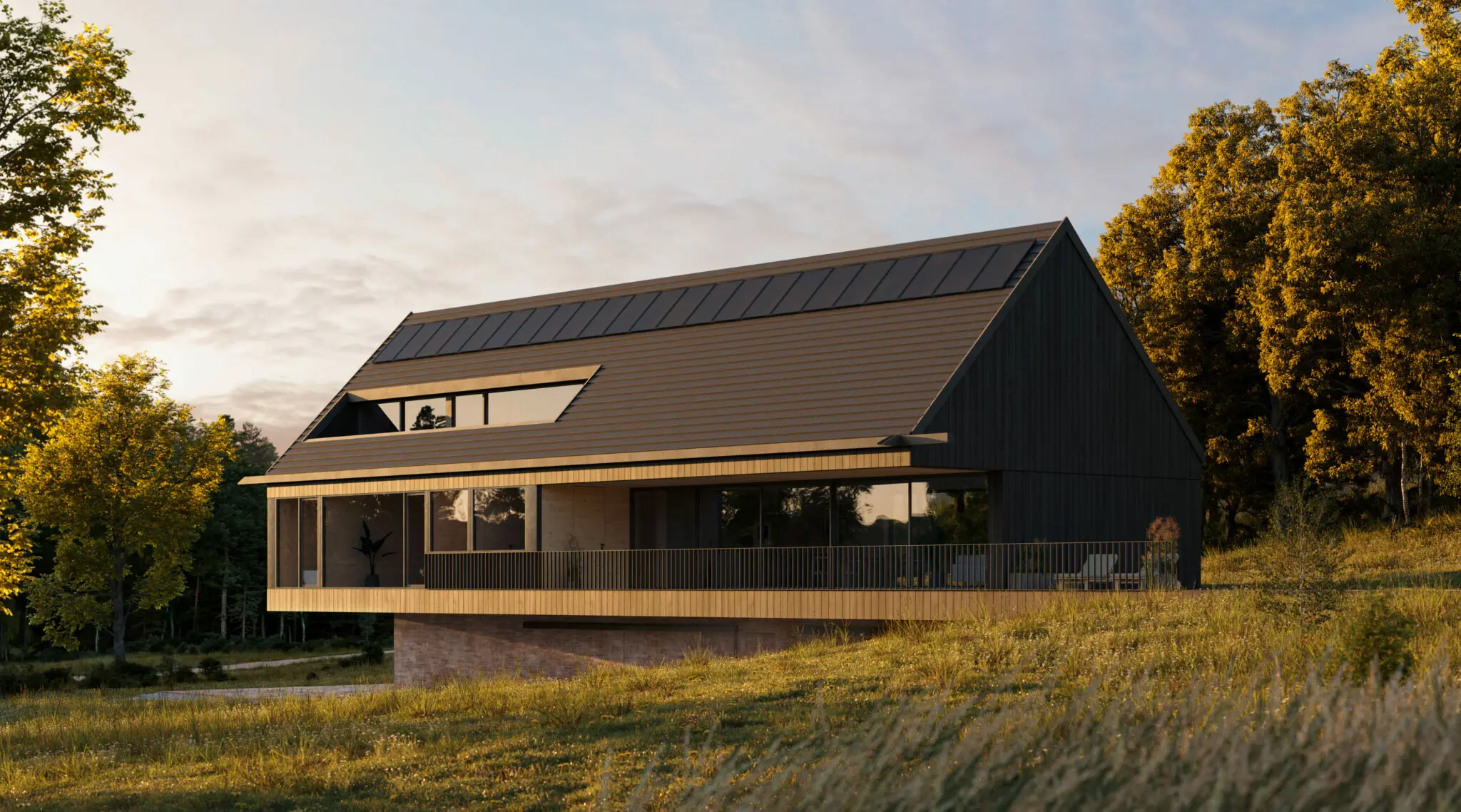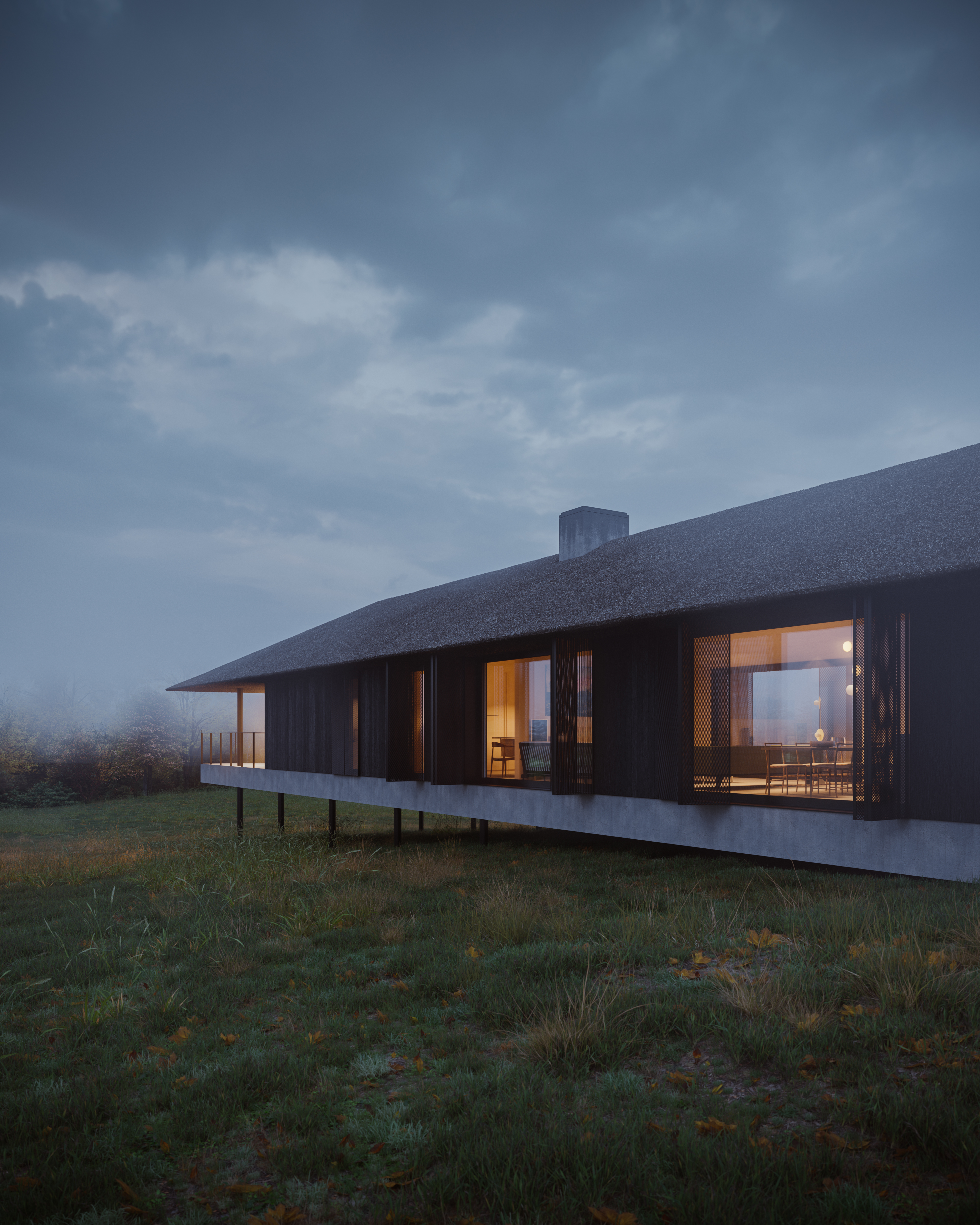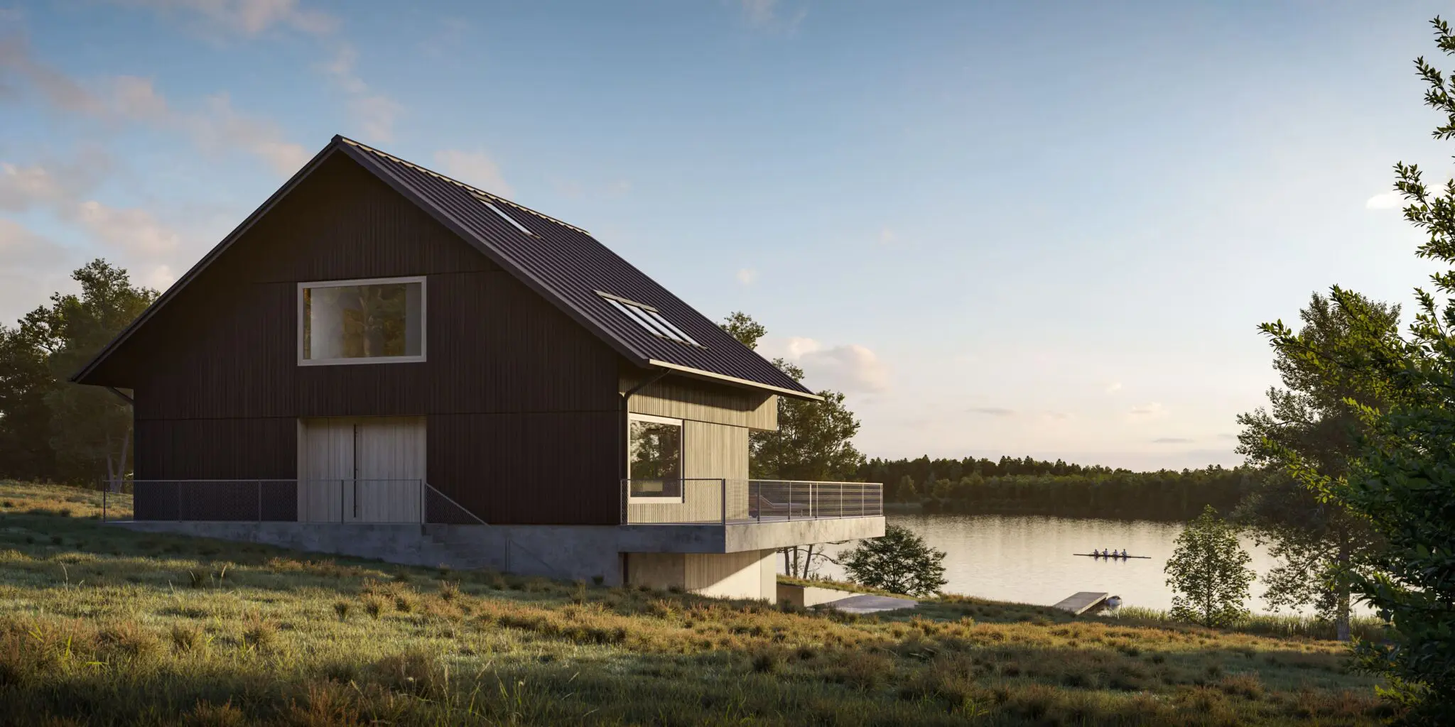 Dom jednorodzinny został zlokalizowany w otoczeniu pól i łąk, z linią horyzontu wykończoną ścianą lasu, co w znaczący sposób wpłynęło na jego formę i układ funkcjonalny. Nowoczesna stodoła wyróżnia się przestronnymi i wysokimi pomieszczeniami, które układają się w logiczne ciągi funkcjonalne, korzystając z pełnego nasłonecznienia oraz codziennej wędrówki słońca. Budynek staje się swoistą sceną dla gry światła i cienia, podkreślając naturalny rytm dnia.