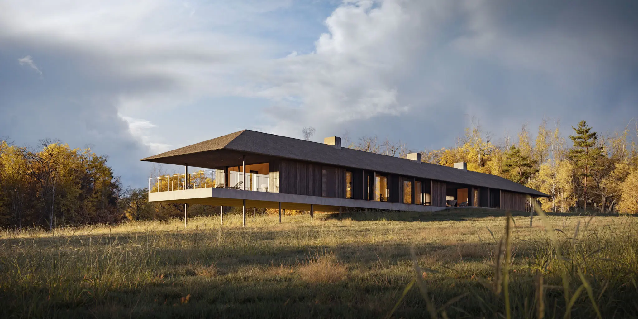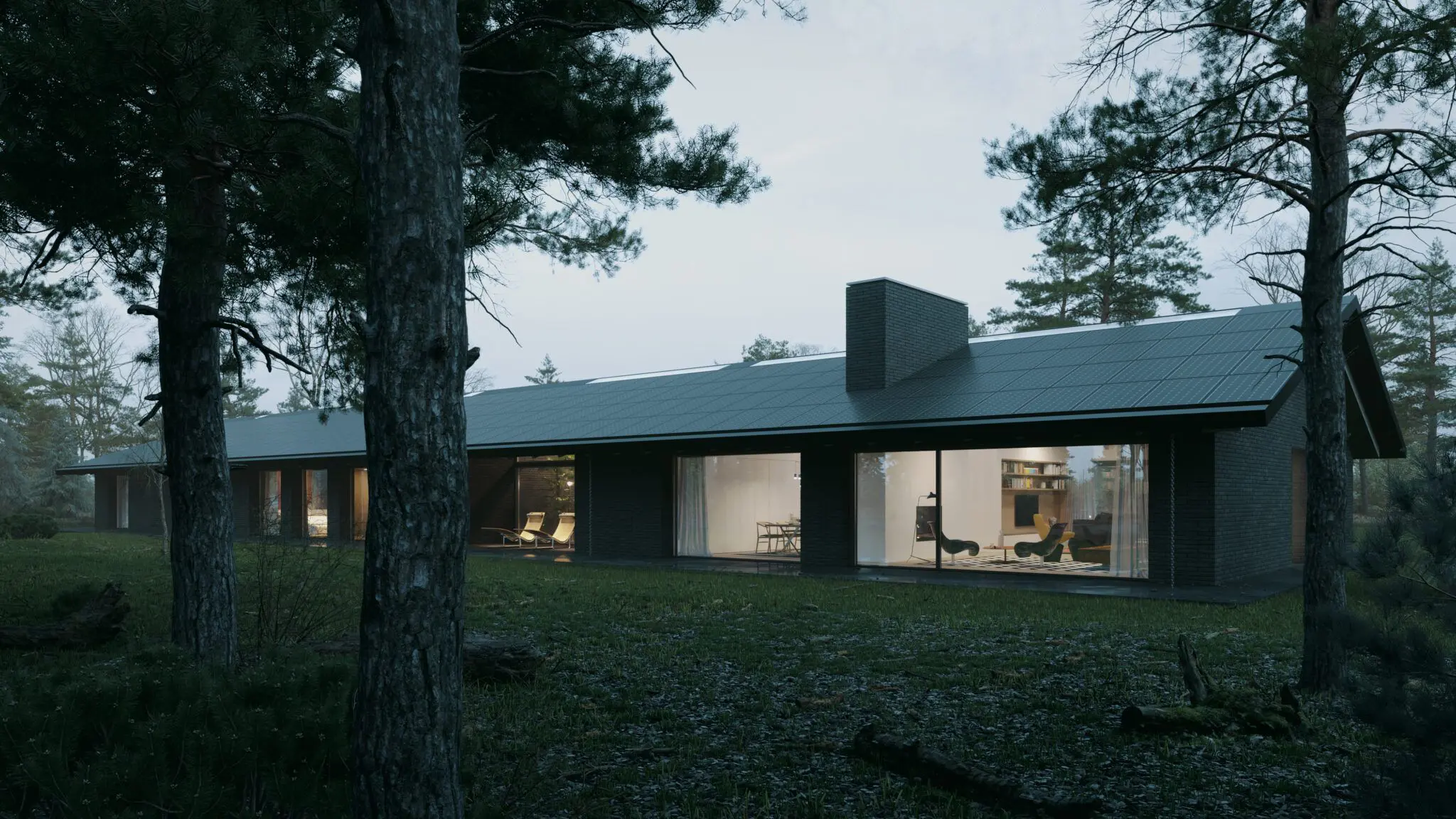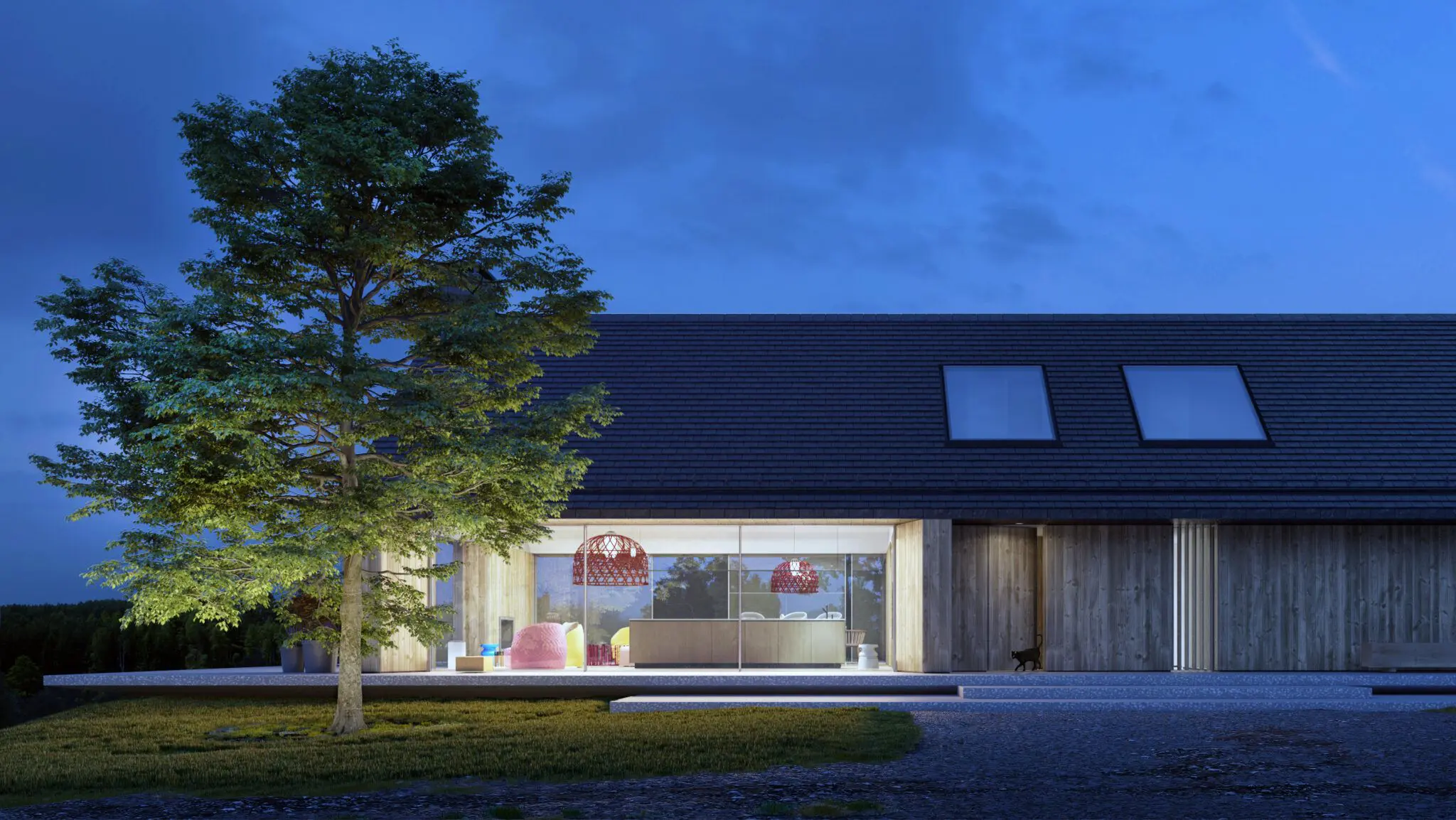 Dom jednorodzinny został zlokalizowany w otoczeniu pól i łąk, z linią horyzontu wykończoną ścianą lasu, co w znaczący sposób wpłynęło na jego formę i układ funkcjonalny. Nowoczesna stodoła wyróżnia się przestronnymi i wysokimi pomieszczeniami, które układają się w logiczne ciągi funkcjonalne, korzystając z pełnego nasłonecznienia oraz codziennej wędrówki słońca. Budynek staje się swoistą sceną dla gry światła i cienia, podkreślając naturalny rytm dnia.