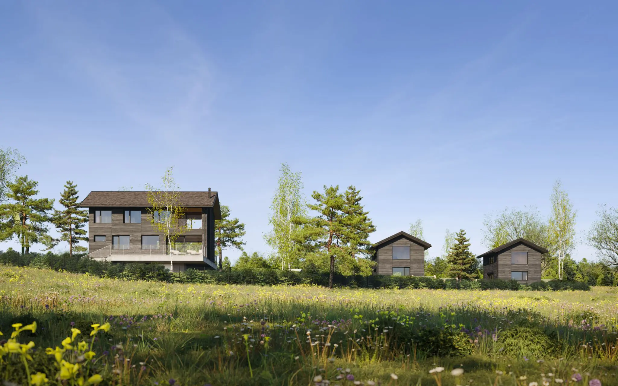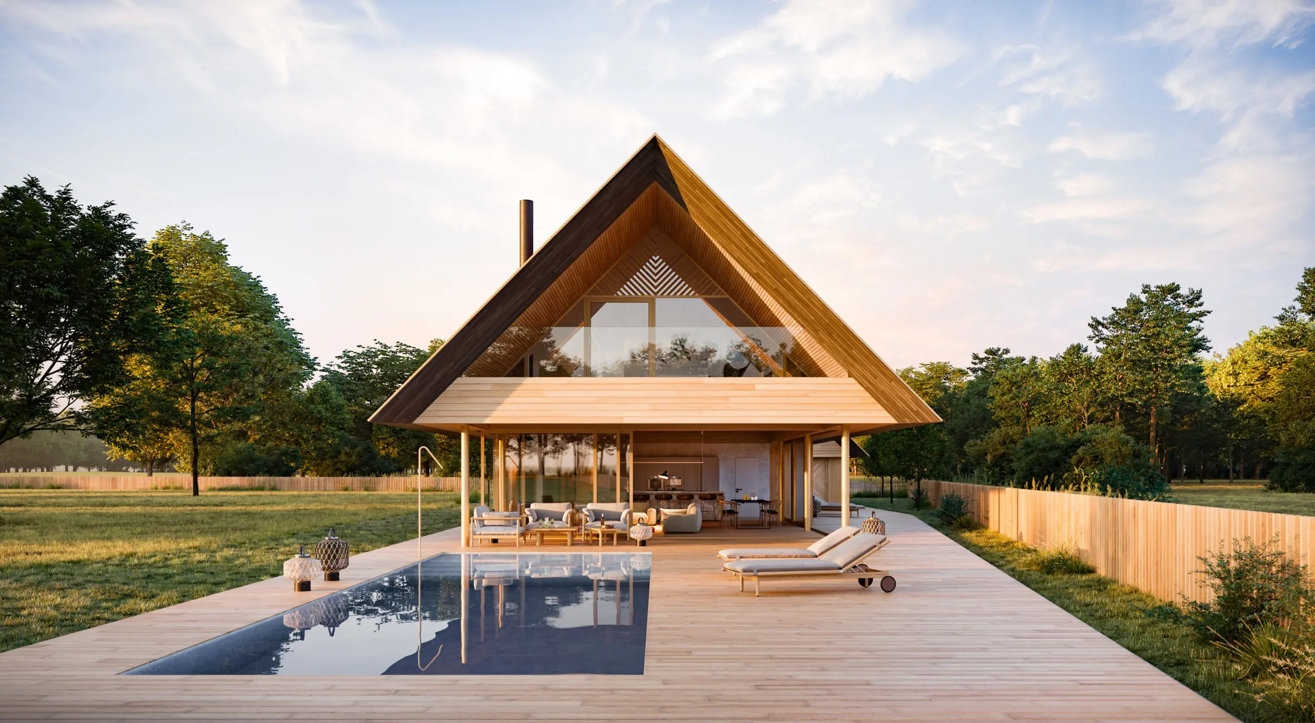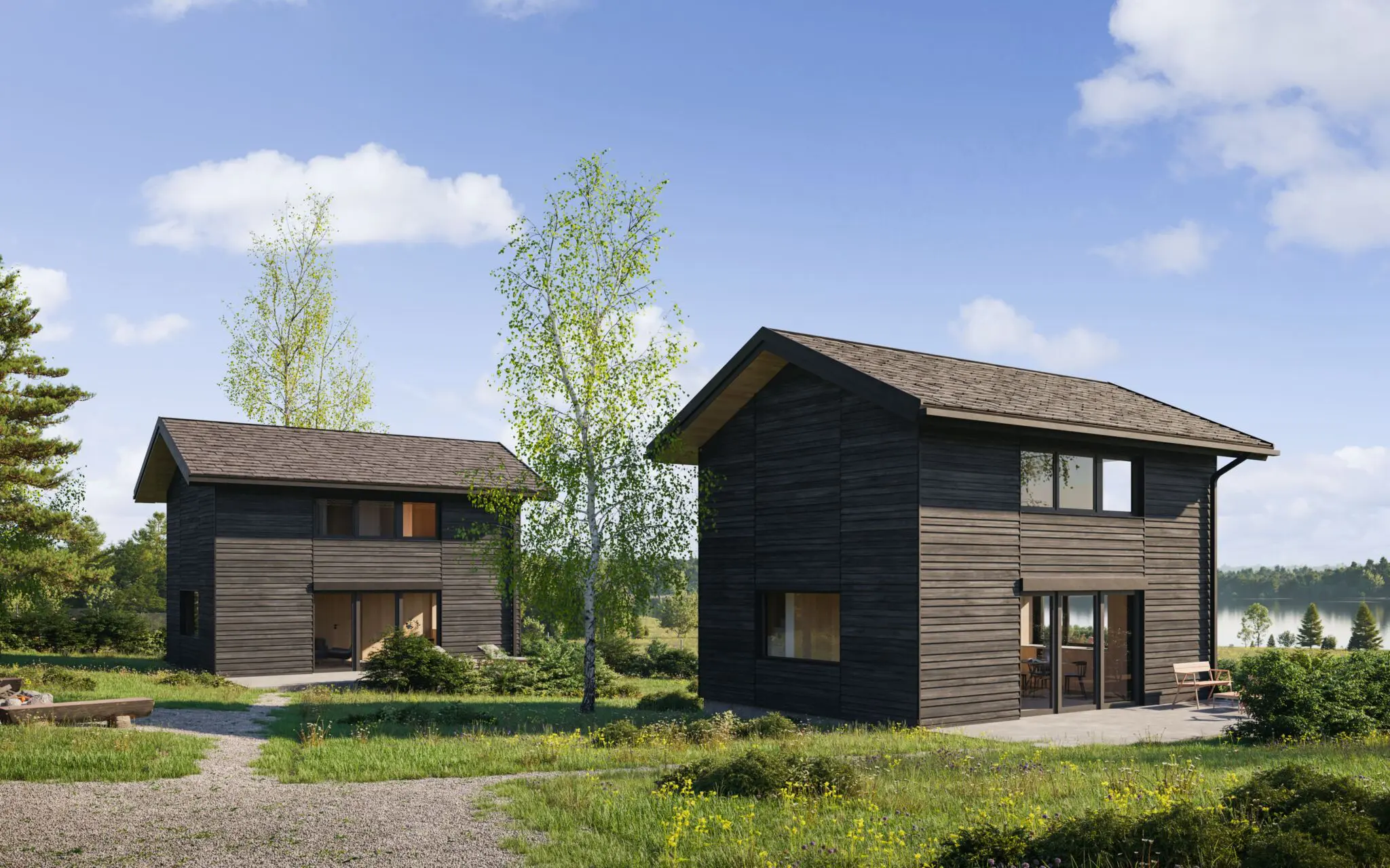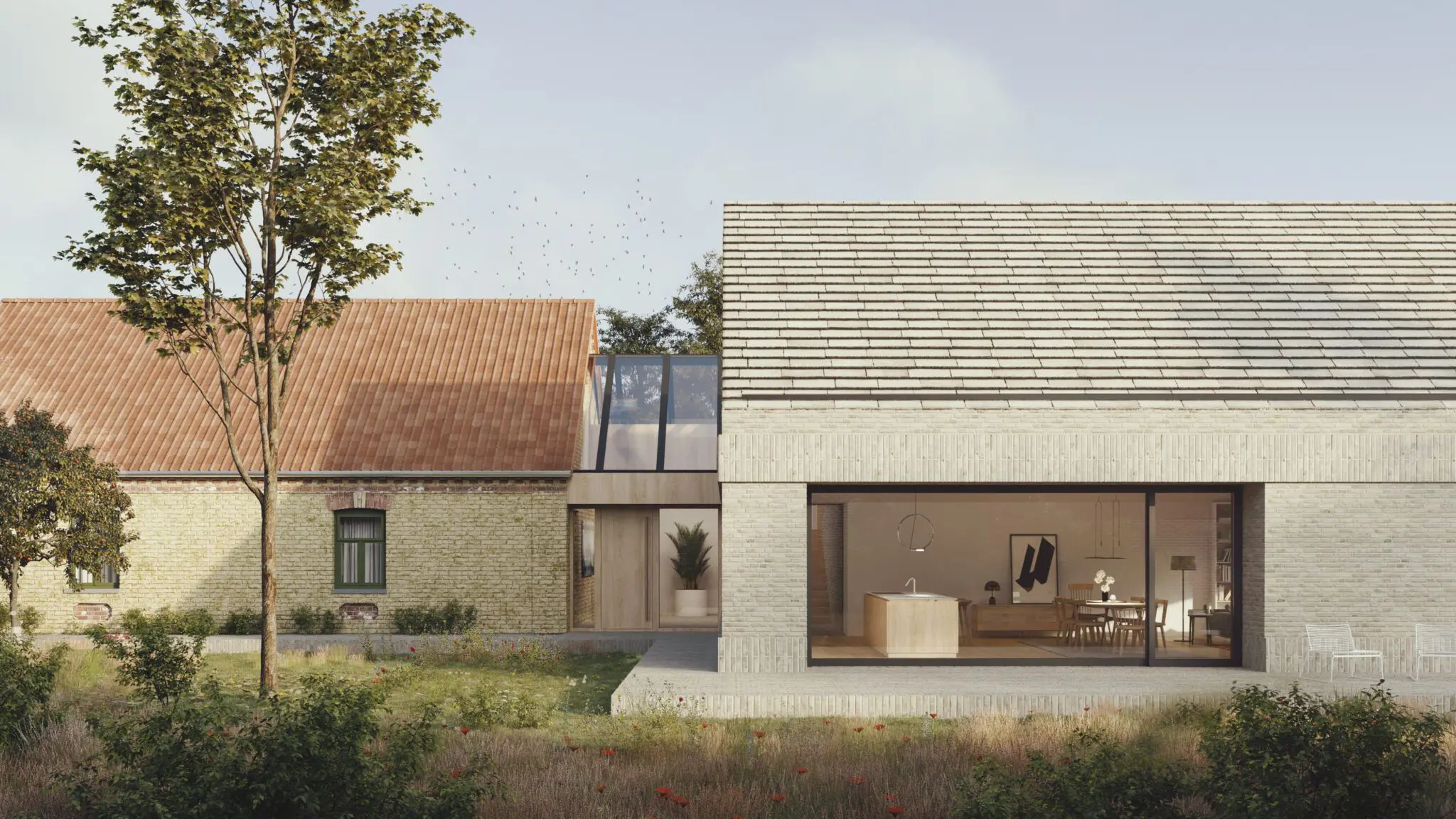 Dom jednorodzinny został zlokalizowany w otoczeniu pól i łąk, z linią horyzontu wykończoną ścianą lasu, co w znaczący sposób wpłynęło na jego formę i układ funkcjonalny. Nowoczesna stodoła wyróżnia się przestronnymi i wysokimi pomieszczeniami, które układają się w logiczne ciągi funkcjonalne, korzystając z pełnego nasłonecznienia oraz codziennej wędrówki słońca. Budynek staje się swoistą sceną dla gry światła i cienia, podkreślając naturalny rytm dnia.