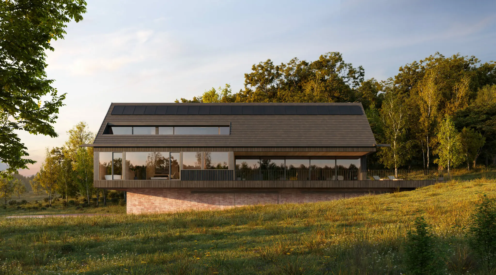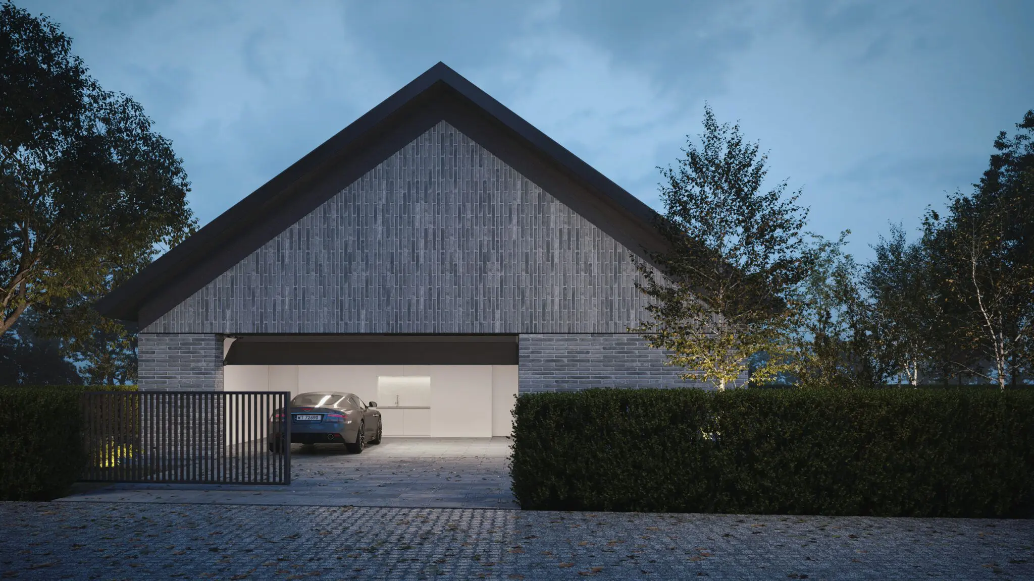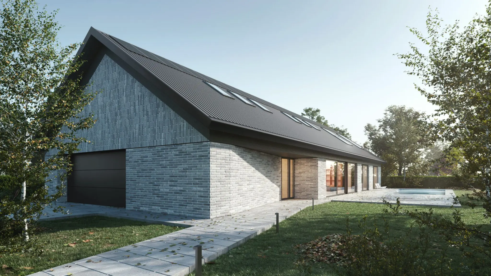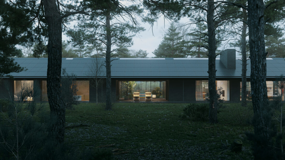 Materiały wykończeniowe i kolorystyka domu harmonizują z otoczeniem, co nadaje mu naturalny i spójny charakter. Elewacja wykonana została z wypalonej piaskowej cegły, a dach pokryto kwadratowymi łuskami z patynowanej blachy tytanowo-cynkowej, co podkreśla elegancki, minimalistyczny wygląd nowoczesnej stodoły. Dom o powierzchni użytkowej 239 m² powstaje w Kujawsko-Pomorskiem i stanowi połączenie funkcjonalności z pełnym wkomponowaniem w naturalny krajobraz.