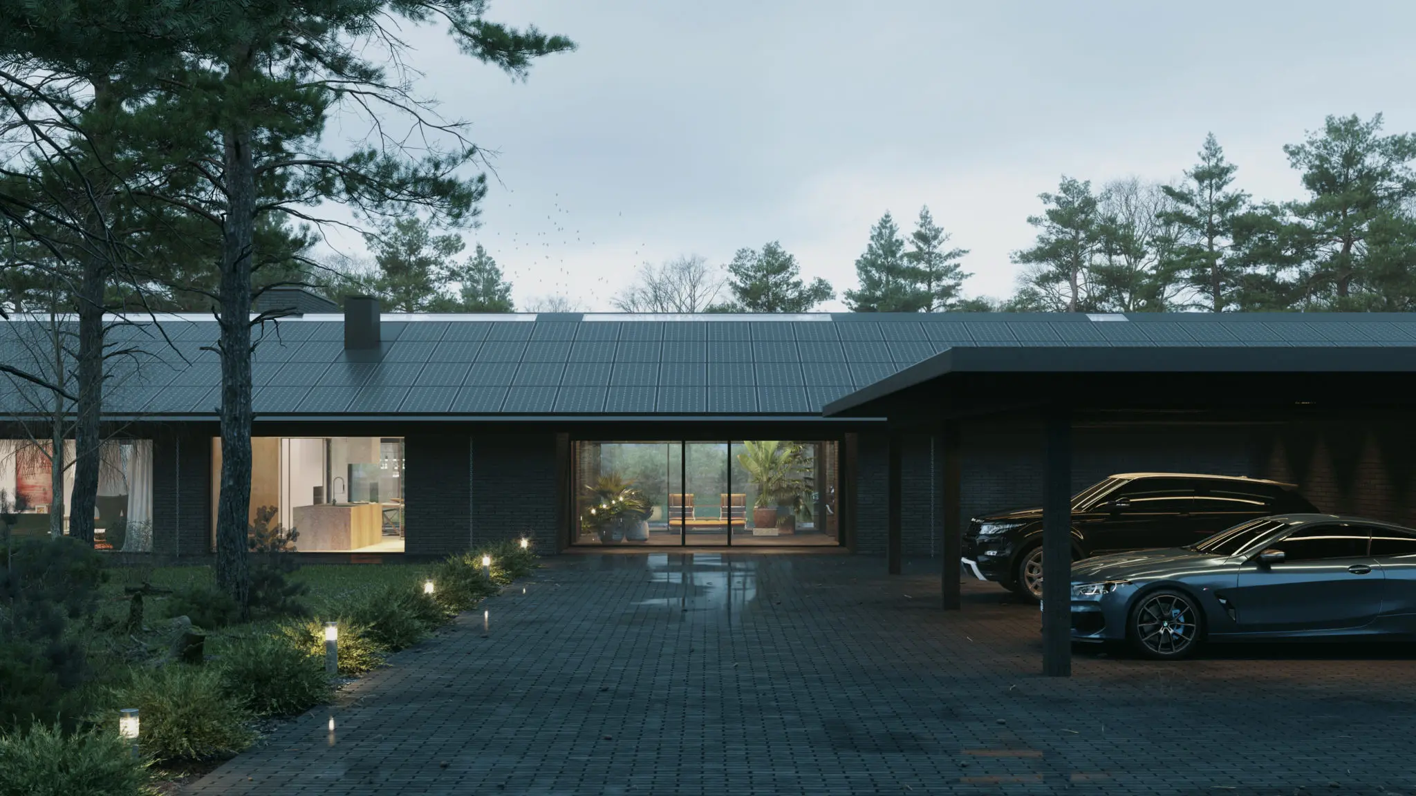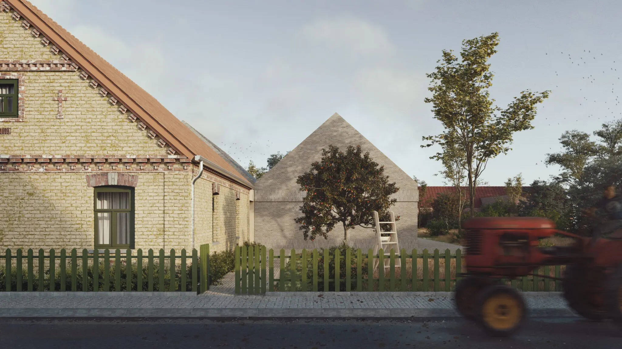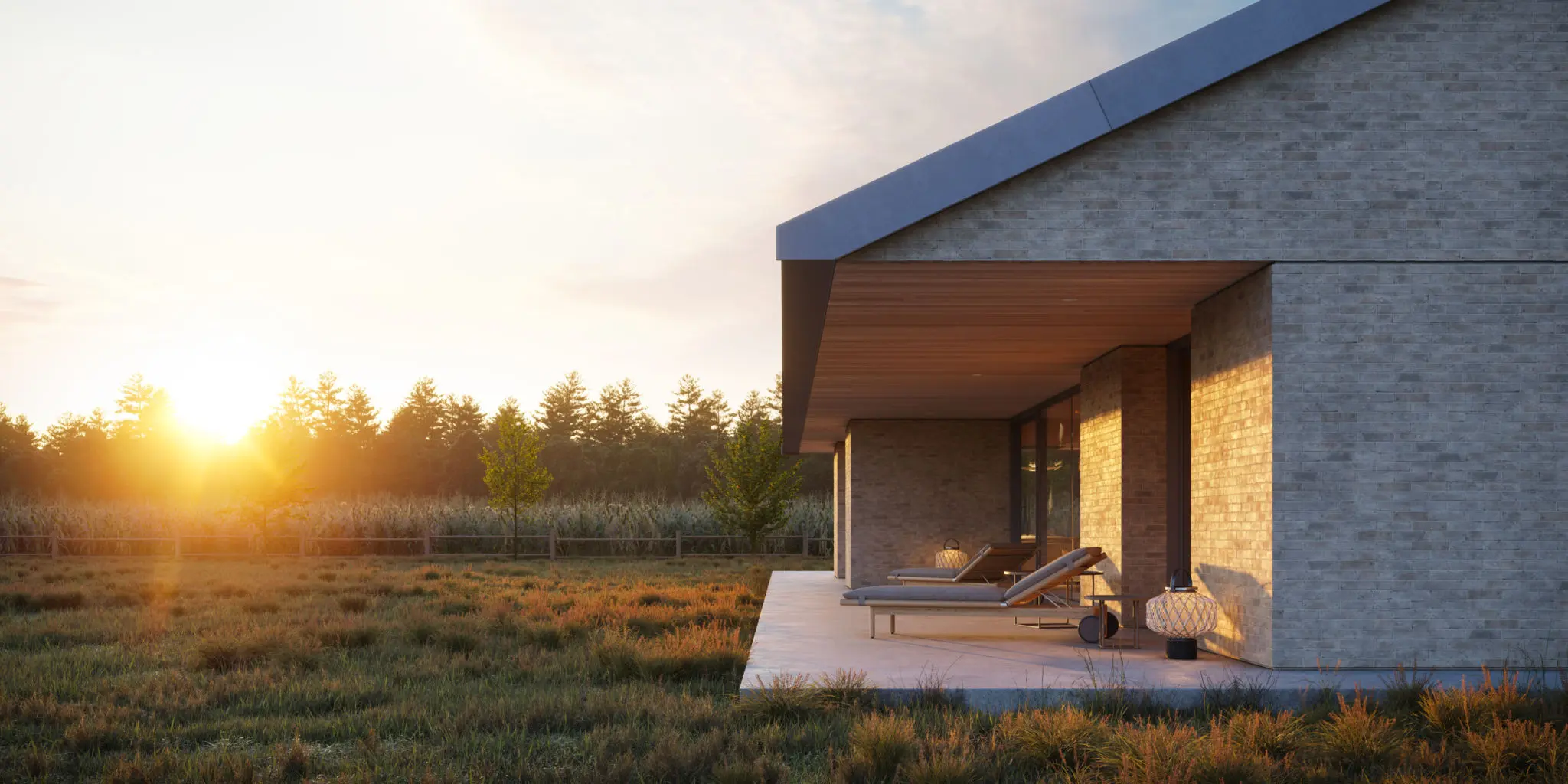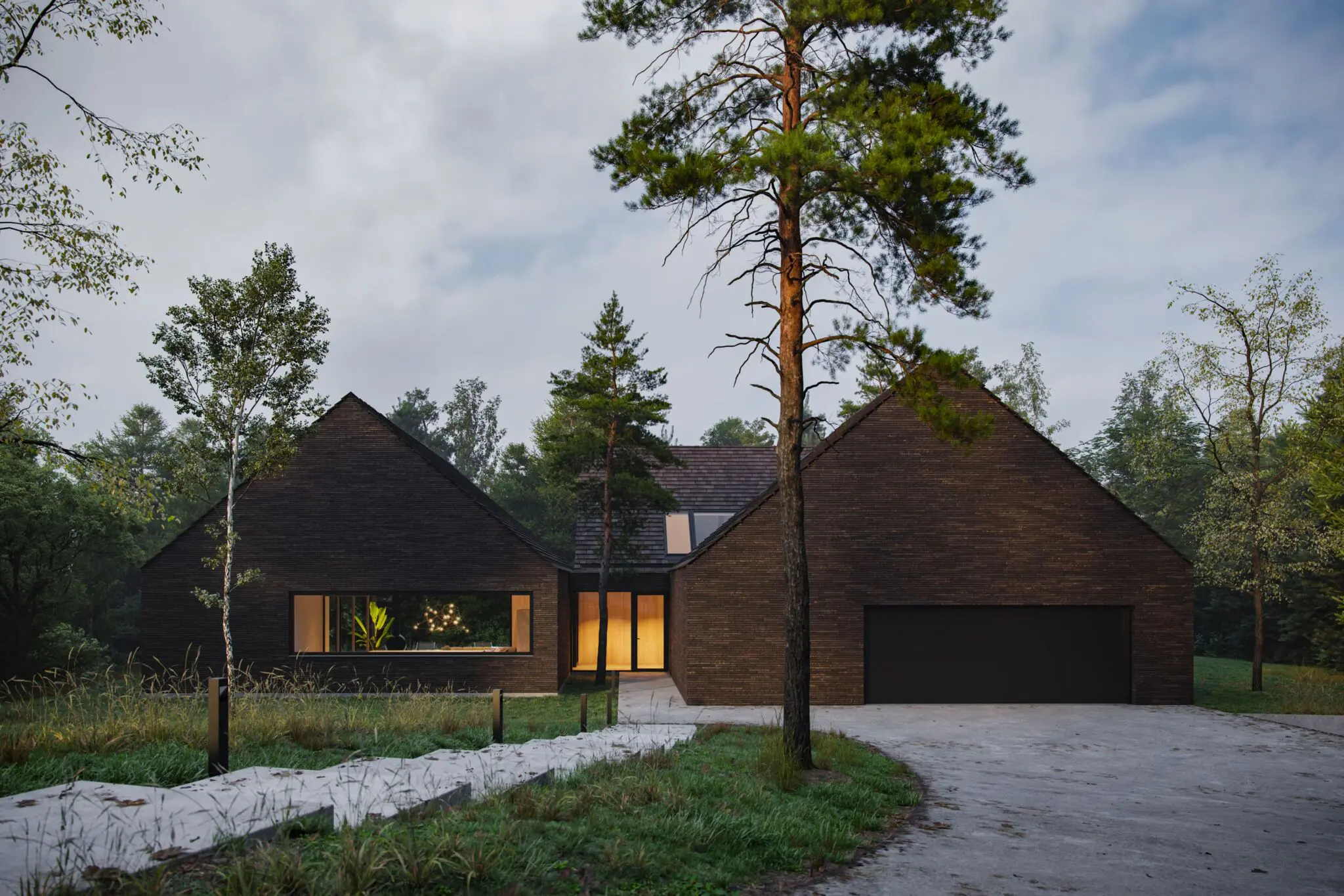 Materiały wykończeniowe i kolorystyka domu harmonizują z otoczeniem, co nadaje mu naturalny i spójny charakter. Elewacja wykonana została z wypalonej piaskowej cegły, a dach pokryto kwadratowymi łuskami z patynowanej blachy tytanowo-cynkowej, co podkreśla elegancki, minimalistyczny wygląd nowoczesnej stodoły. Dom o powierzchni użytkowej 239 m² powstaje w Kujawsko-Pomorskiem i stanowi połączenie funkcjonalności z pełnym wkomponowaniem w naturalny krajobraz.