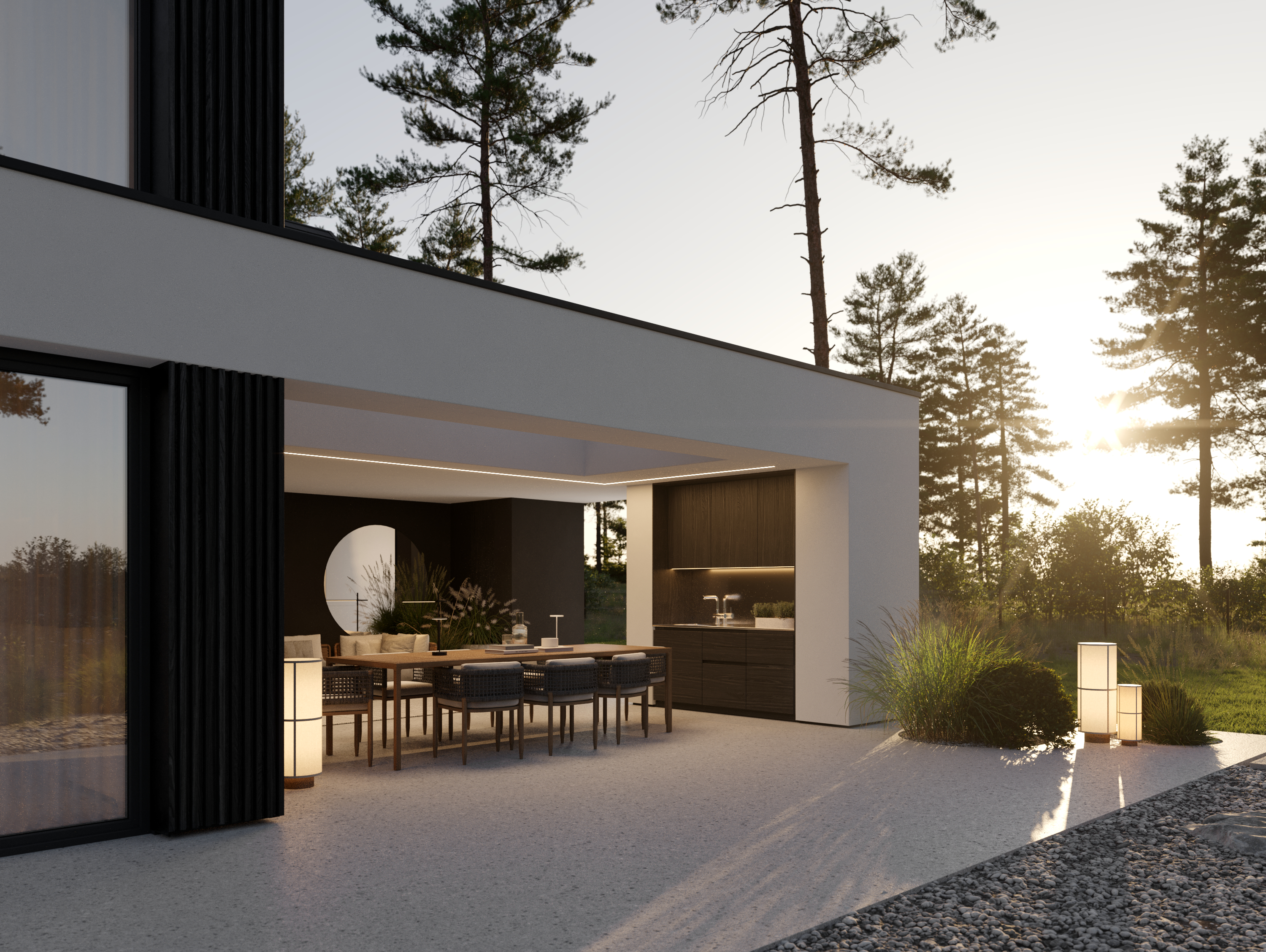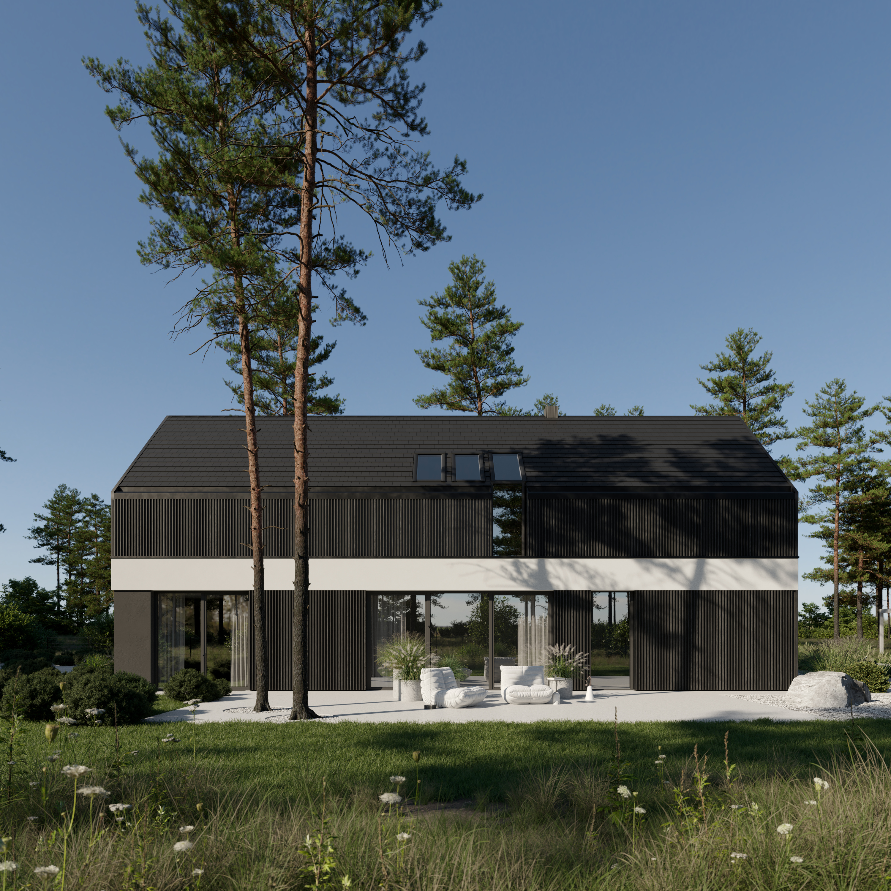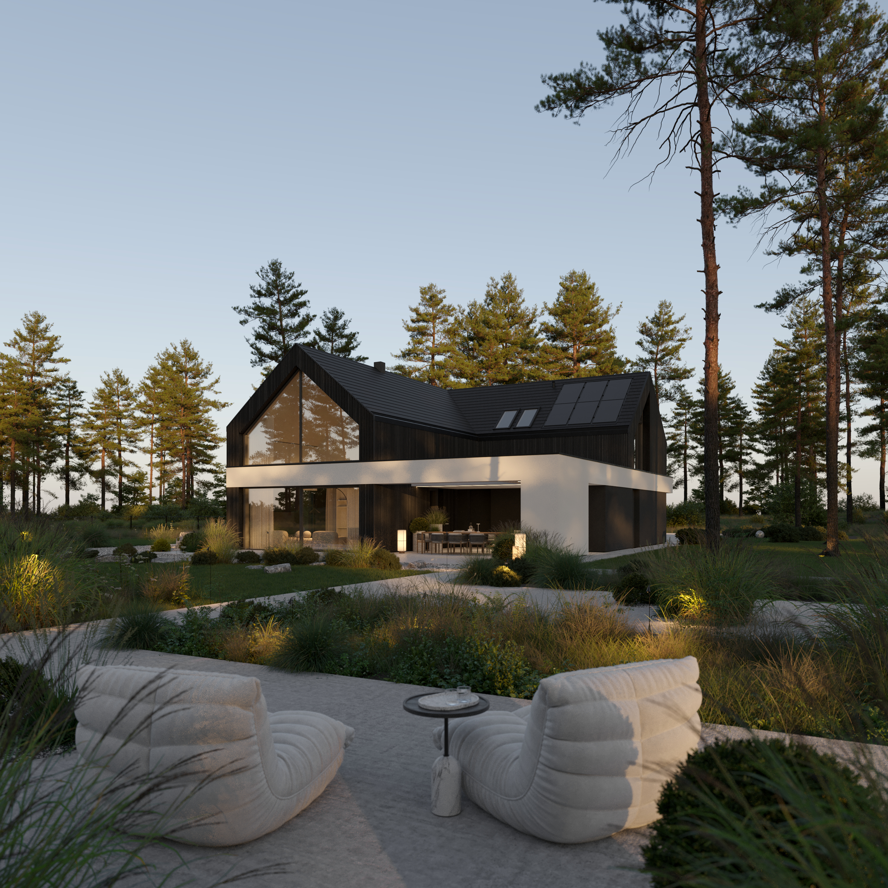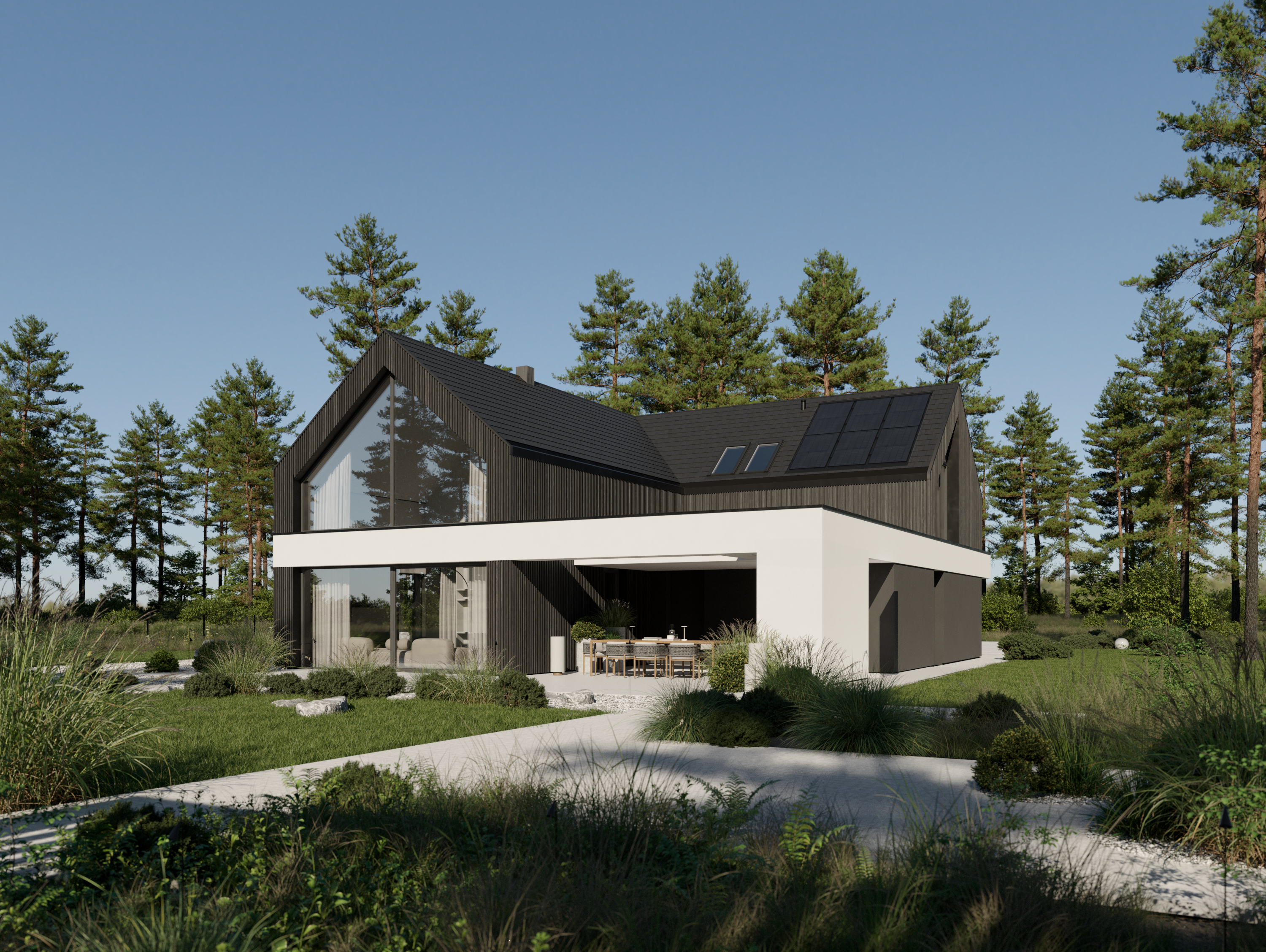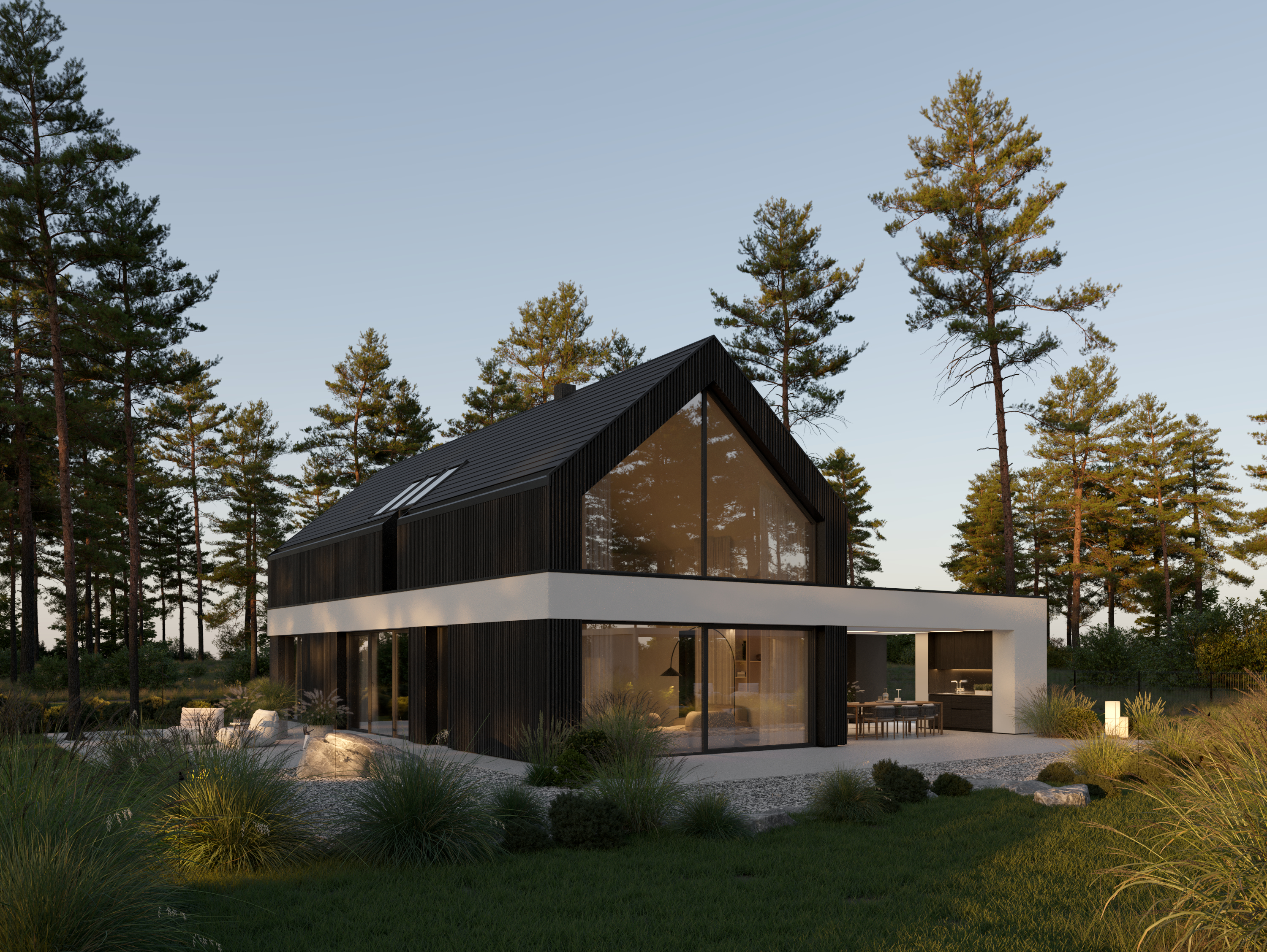 A co znajdziecie we wnętrzu? Przestronną strefę dzienną, w której kuchnia, jadalnia i salon płynnie łączą się w jedną całość. Delikatnie oddzieliliśmy salon ścianką z kominkiem, tworząc kameralny klimat bez utraty otwartej przestrzeni. Ogromne przeszklenie sięgające aż po sam szczyt dachu wpuszcza mnóstwo naturalnego światła i otwiera dom na ogród. A skoro o ogrodzie mowa…z salonu wyjdziecie na dwa tarasy. Jeden, częściowo zadaszony, stanie się idealnym miejscem na rodzinne obiady i wieczory z przyjaciółmi. Drugi, pod chmurką – świetnie sprawdzi się na poranną kawę lub relaks w pełnym słońcu.