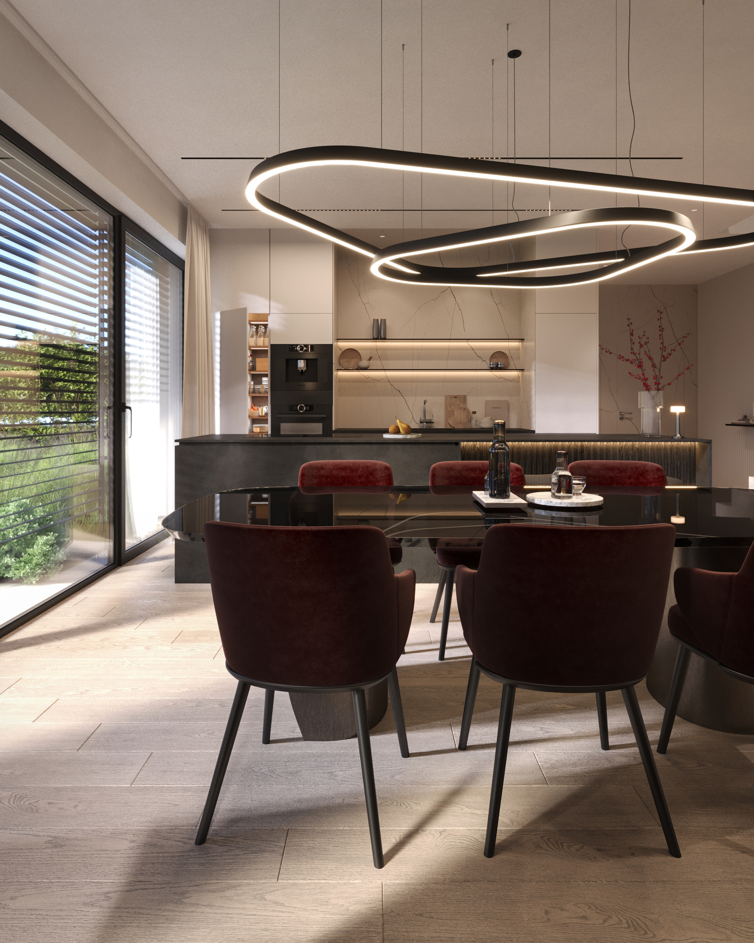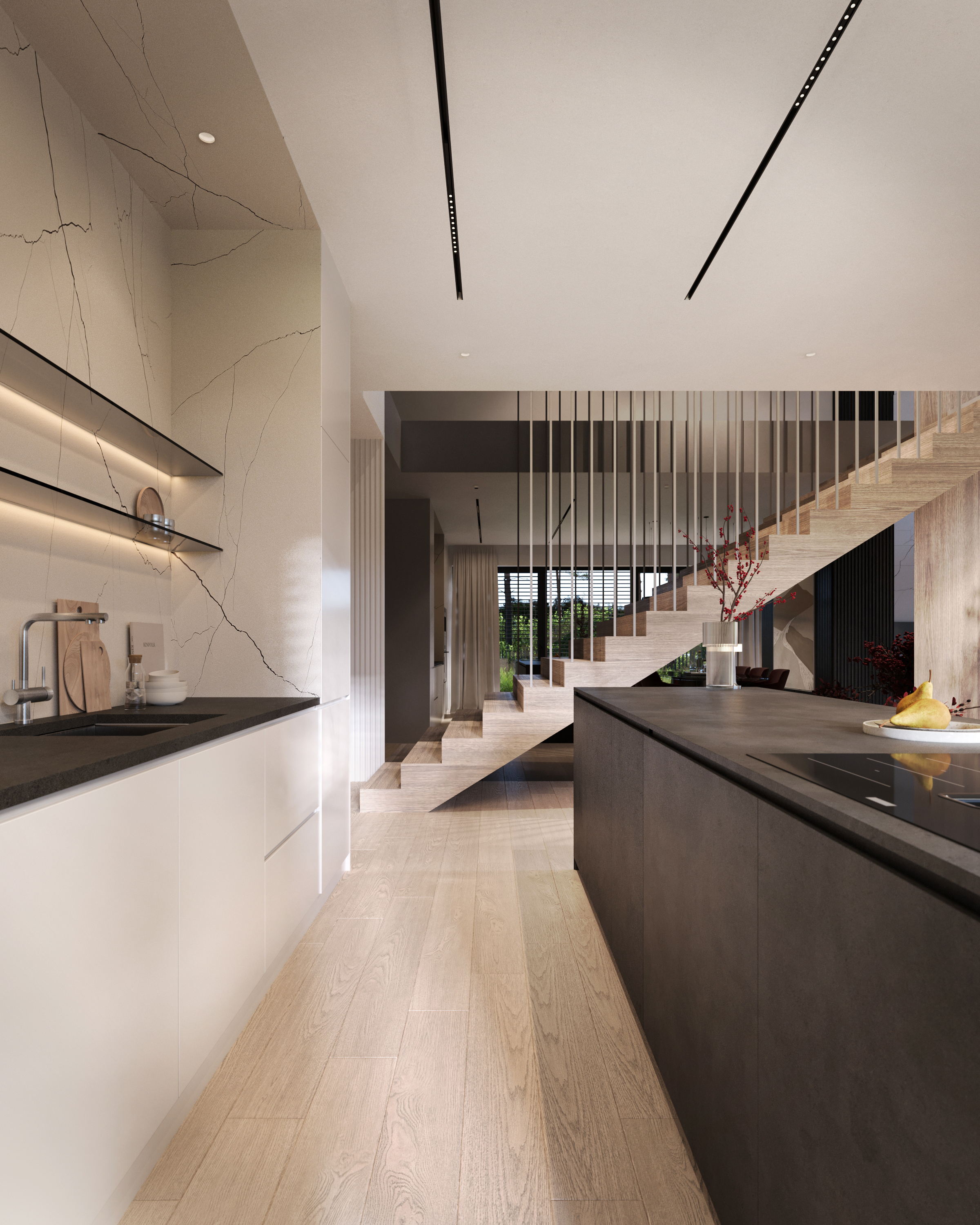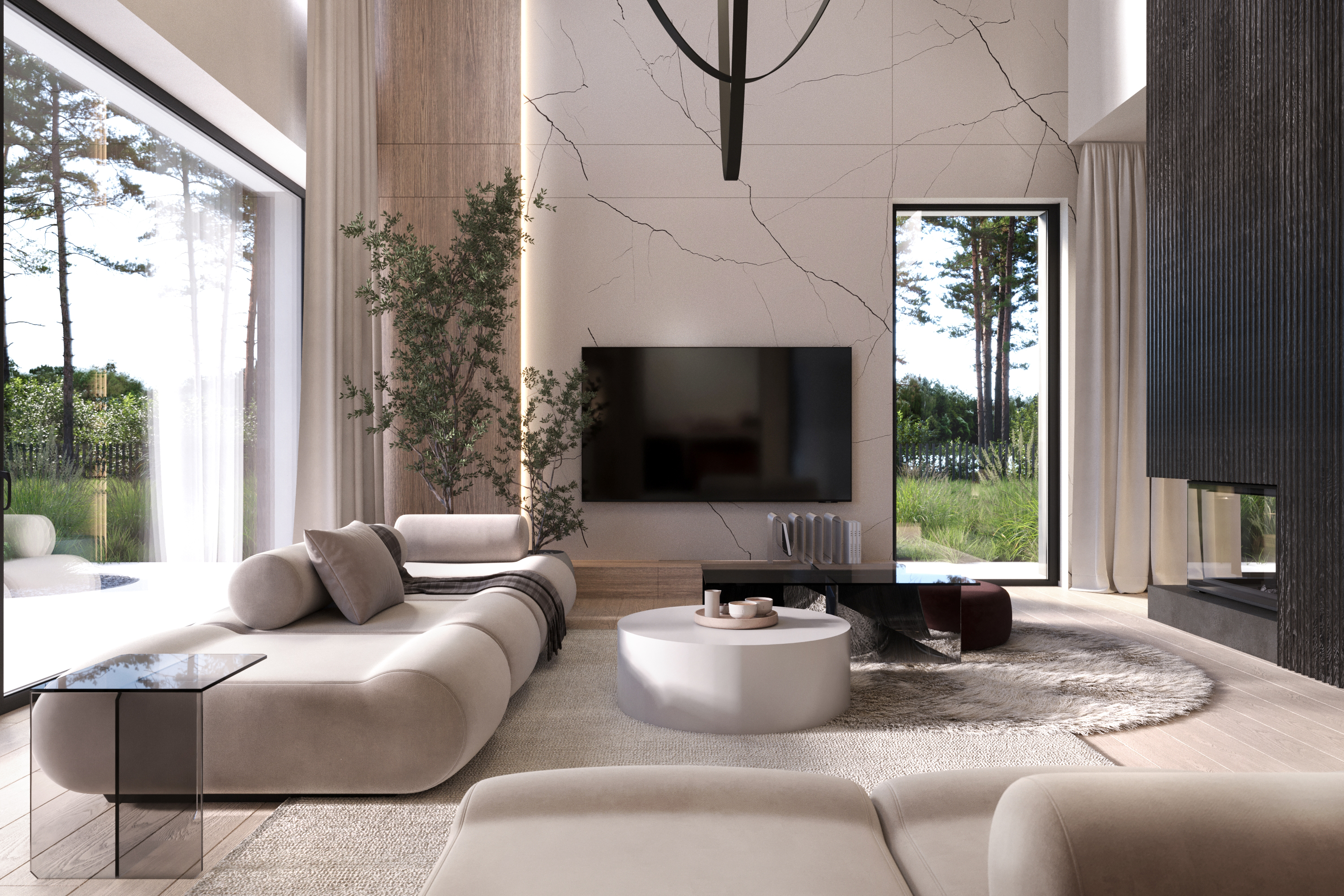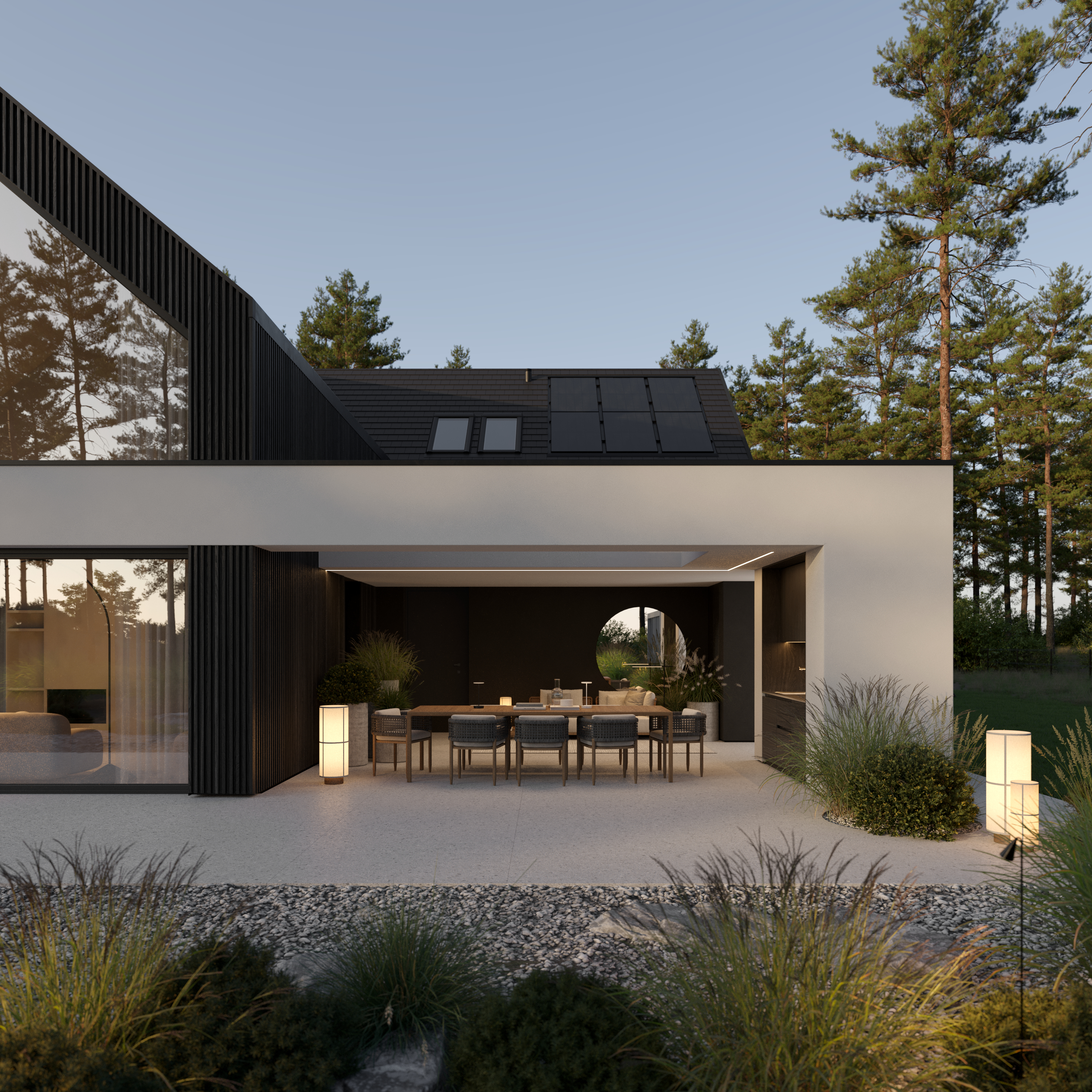 A co znajdziecie we wnętrzu? Przestronną strefę dzienną, w której kuchnia, jadalnia i salon płynnie łączą się w jedną całość. Delikatnie oddzieliliśmy salon ścianką z kominkiem, tworząc kameralny klimat bez utraty otwartej przestrzeni. Ogromne przeszklenie sięgające aż po sam szczyt dachu wpuszcza mnóstwo naturalnego światła i otwiera dom na ogród. A skoro o ogrodzie mowa…z salonu wyjdziecie na dwa tarasy. Jeden, częściowo zadaszony, stanie się idealnym miejscem na rodzinne obiady i wieczory z przyjaciółmi. Drugi, pod chmurką – świetnie sprawdzi się na poranną kawę lub relaks w pełnym słońcu.