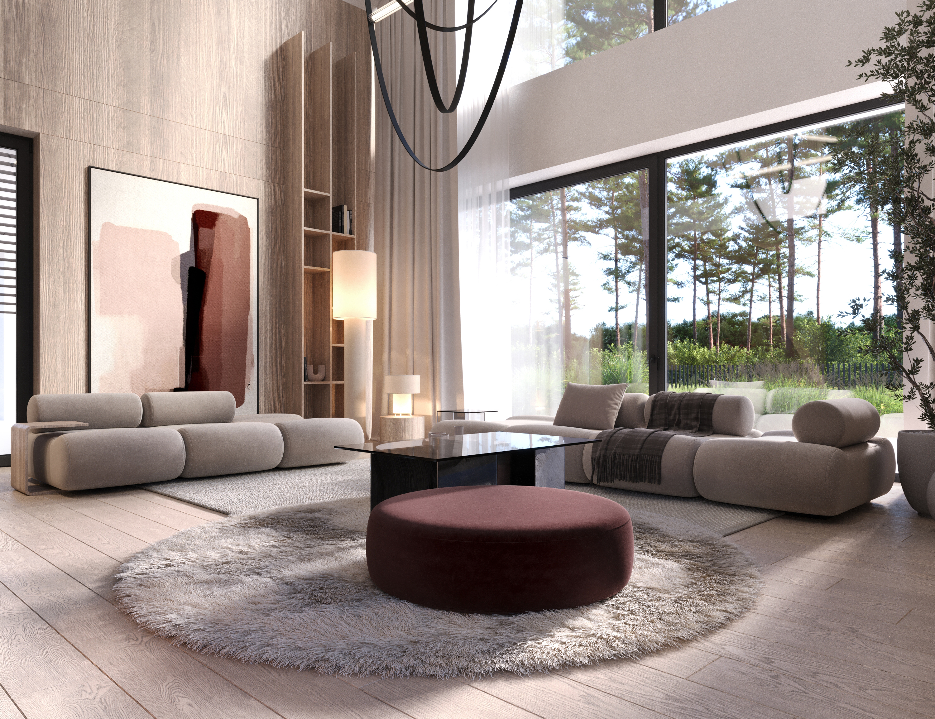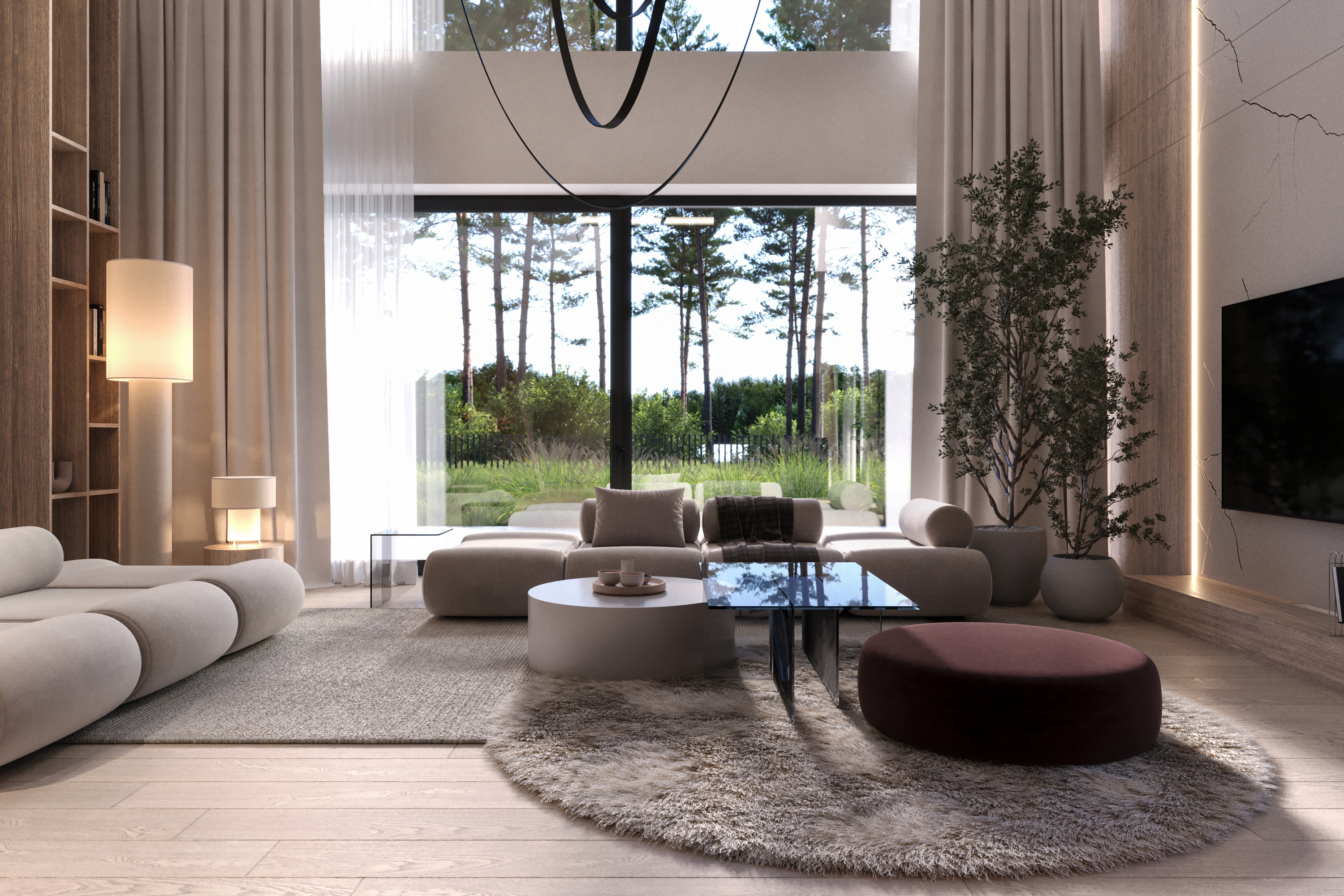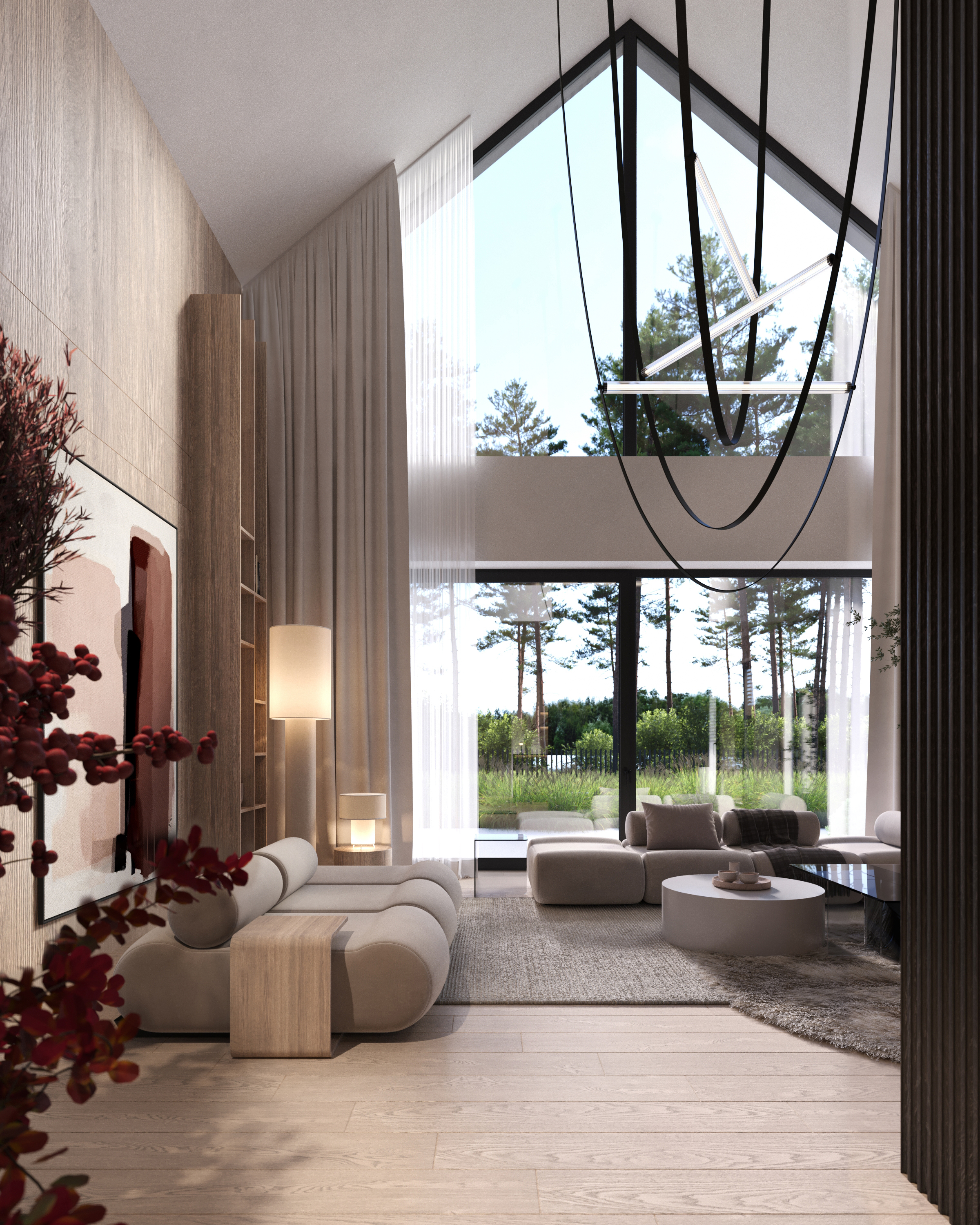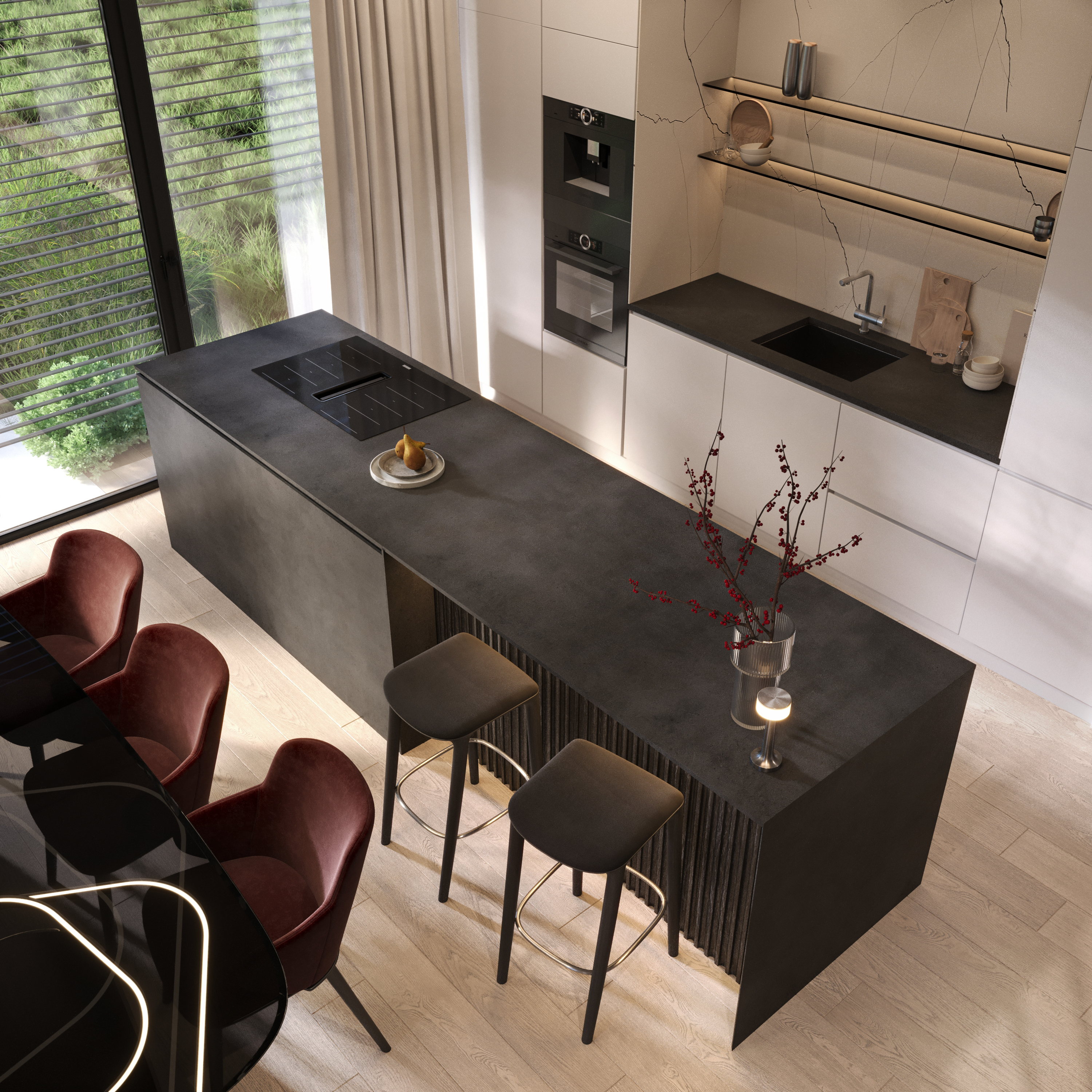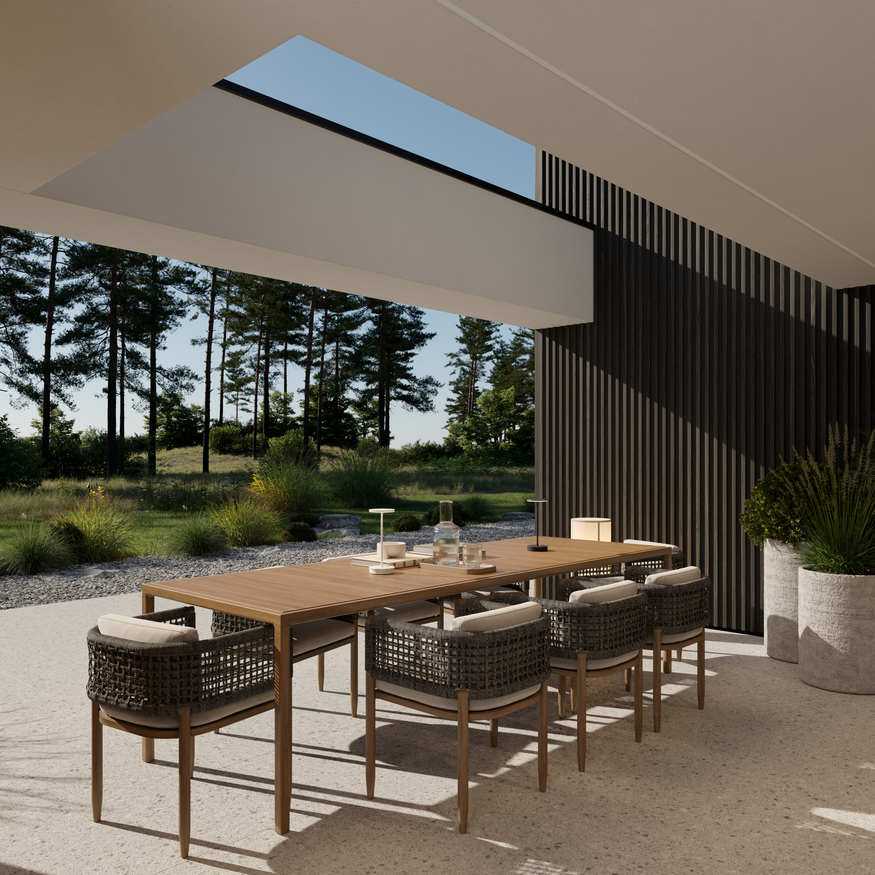 A co znajdziecie we wnętrzu? Przestronną strefę dzienną, w której kuchnia, jadalnia i salon płynnie łączą się w jedną całość. Delikatnie oddzieliliśmy salon ścianką z kominkiem, tworząc kameralny klimat bez utraty otwartej przestrzeni. Ogromne przeszklenie sięgające aż po sam szczyt dachu wpuszcza mnóstwo naturalnego światła i otwiera dom na ogród. A skoro o ogrodzie mowa…z salonu wyjdziecie na dwa tarasy. Jeden, częściowo zadaszony, stanie się idealnym miejscem na rodzinne obiady i wieczory z przyjaciółmi. Drugi, pod chmurką – świetnie sprawdzi się na poranną kawę lub relaks w pełnym słońcu.
