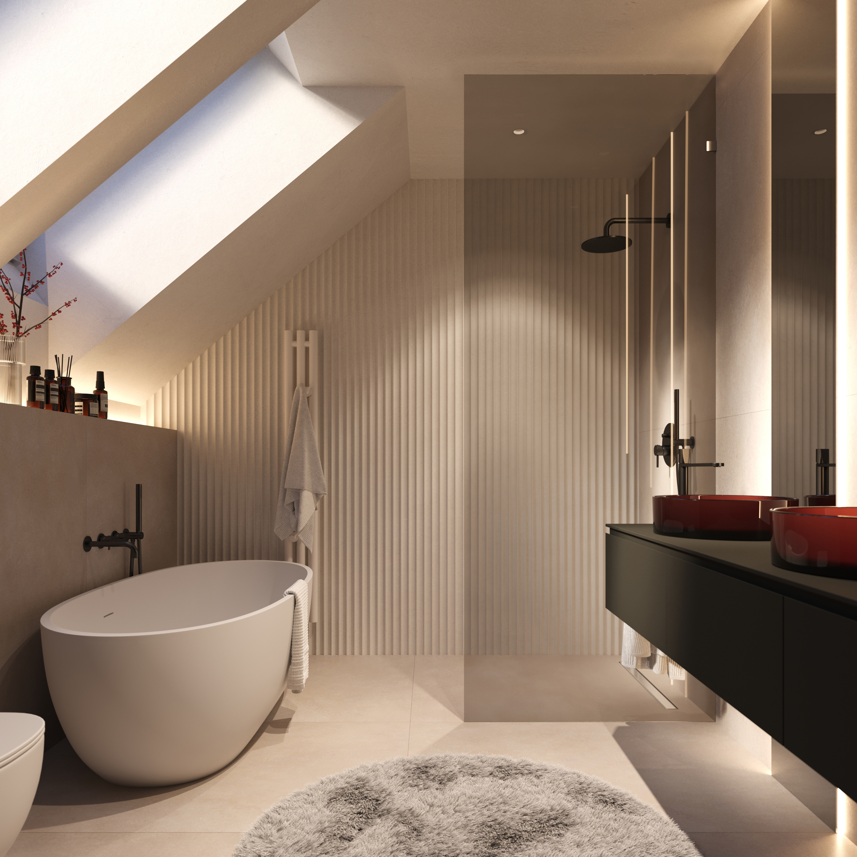 Poddasze to strefa prywatności i komfortu. Master bedroom z własną łazienką i garderobą, dwa dodatkowe pokoje, druga łazienka oraz praktyczna pralnia – wszystko zaprojektowaliśmy tak, by każdy domownik miał swoją przestrzeń do odpoczynku i chwili tylko dla siebie.