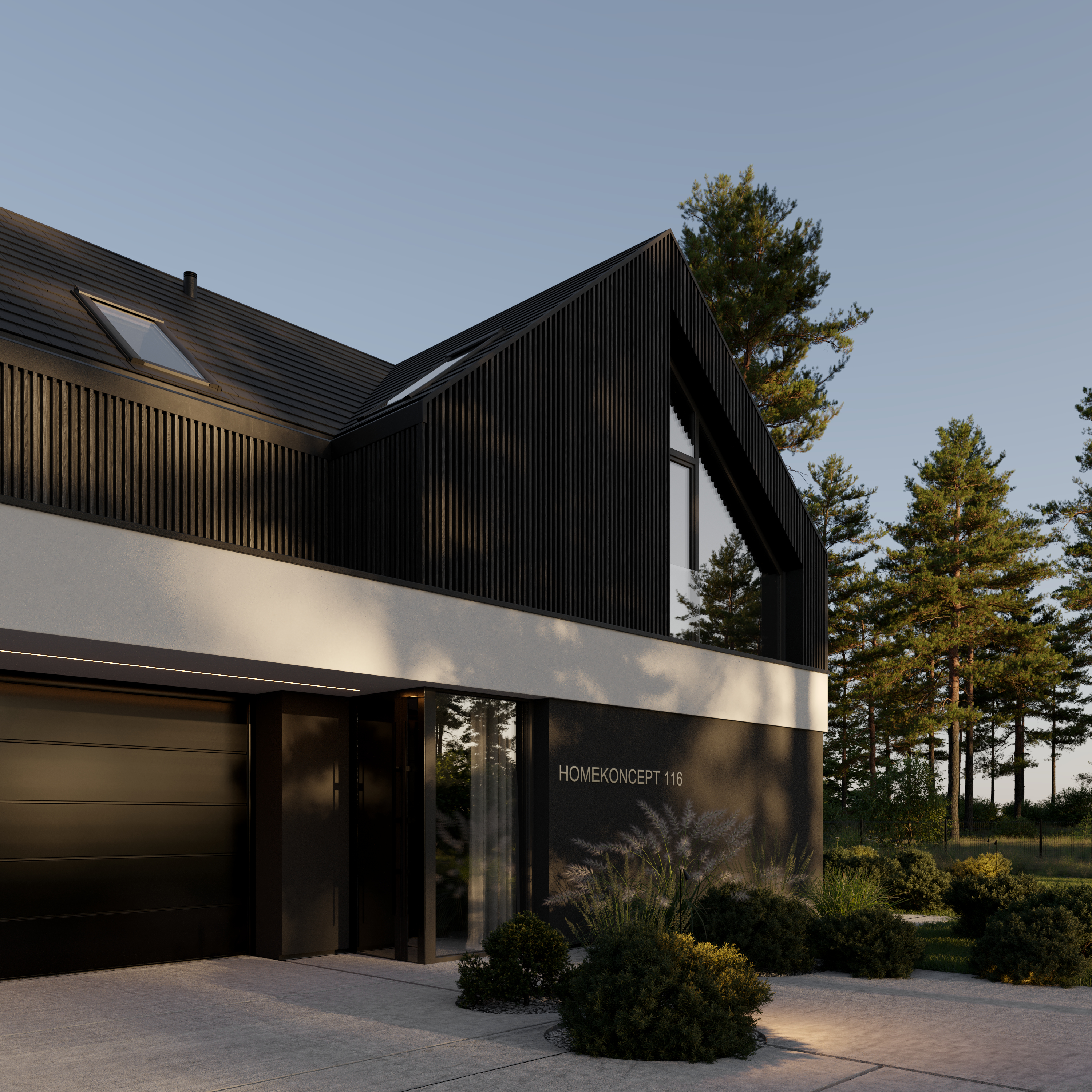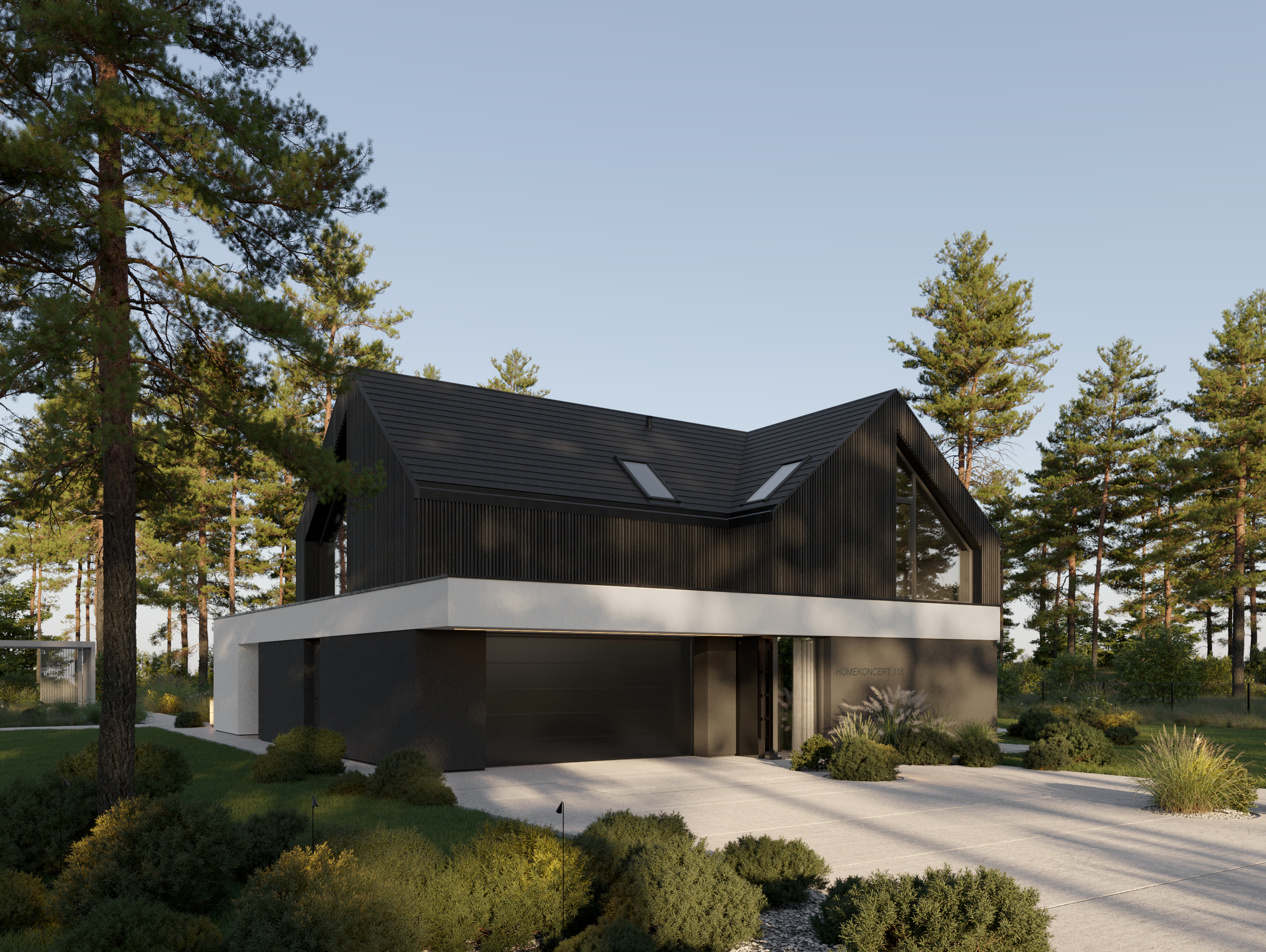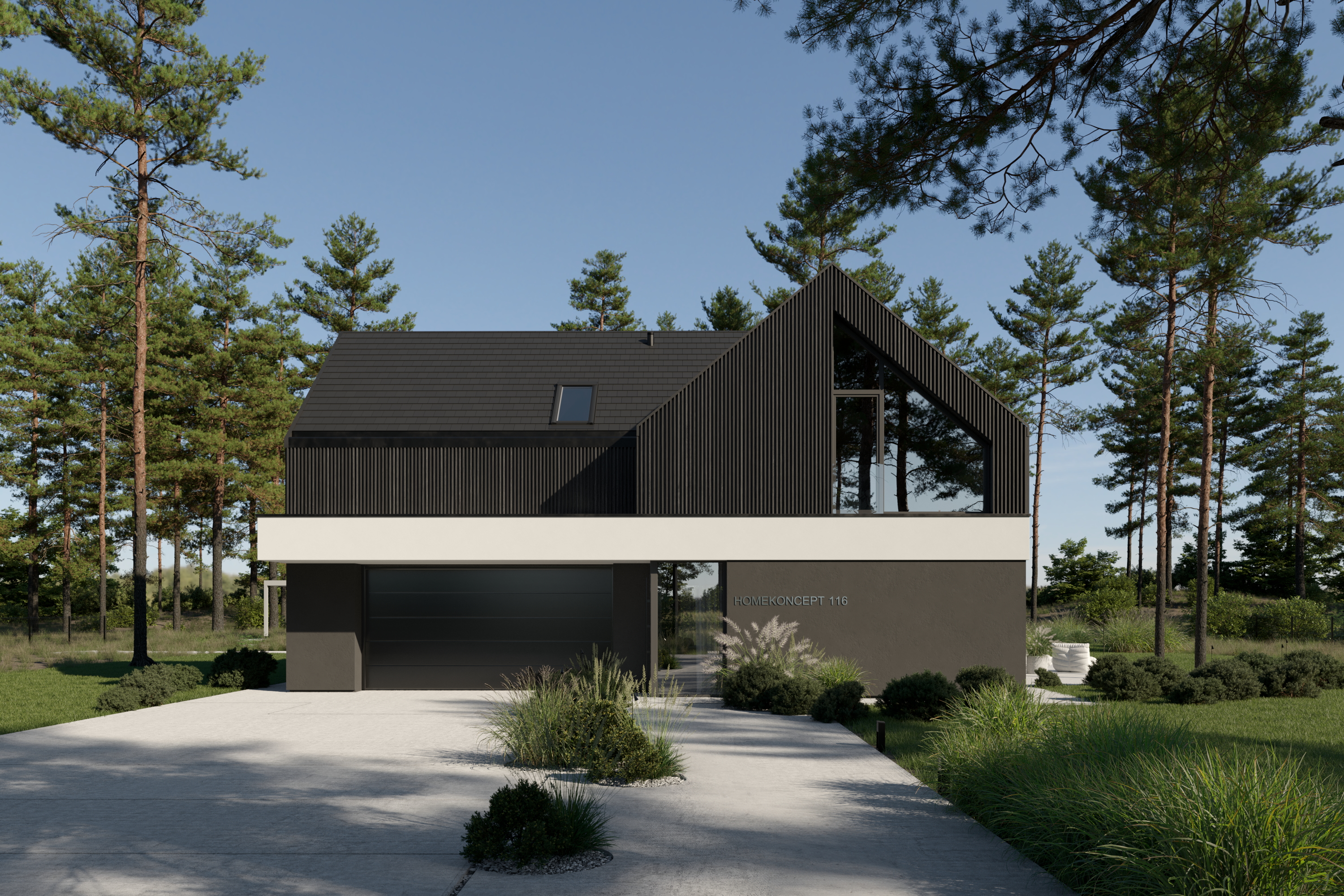 HOMEKONCEPT 116 już od pierwszego spojrzenia zachwyca swoją elegancją. Nowoczesna elewacja łączy ciemne drewno, subtelne akcenty z ciemnego tynku silikonowego i kontrastującą biel belki obejmującej bryłę budynku. Duże przeszklenia nadają bryle lekkości i płynnie łączą wnętrze z otoczeniem.