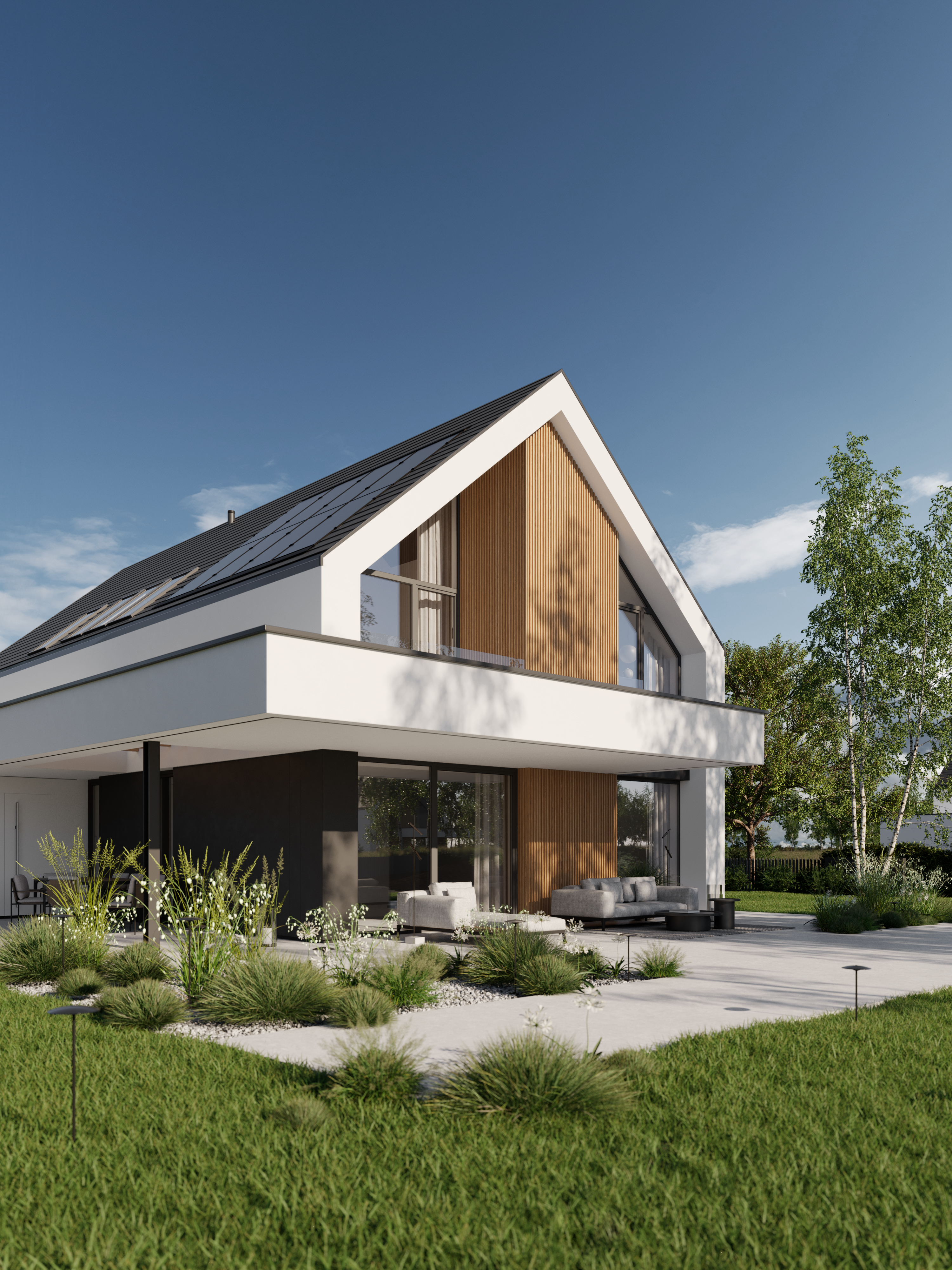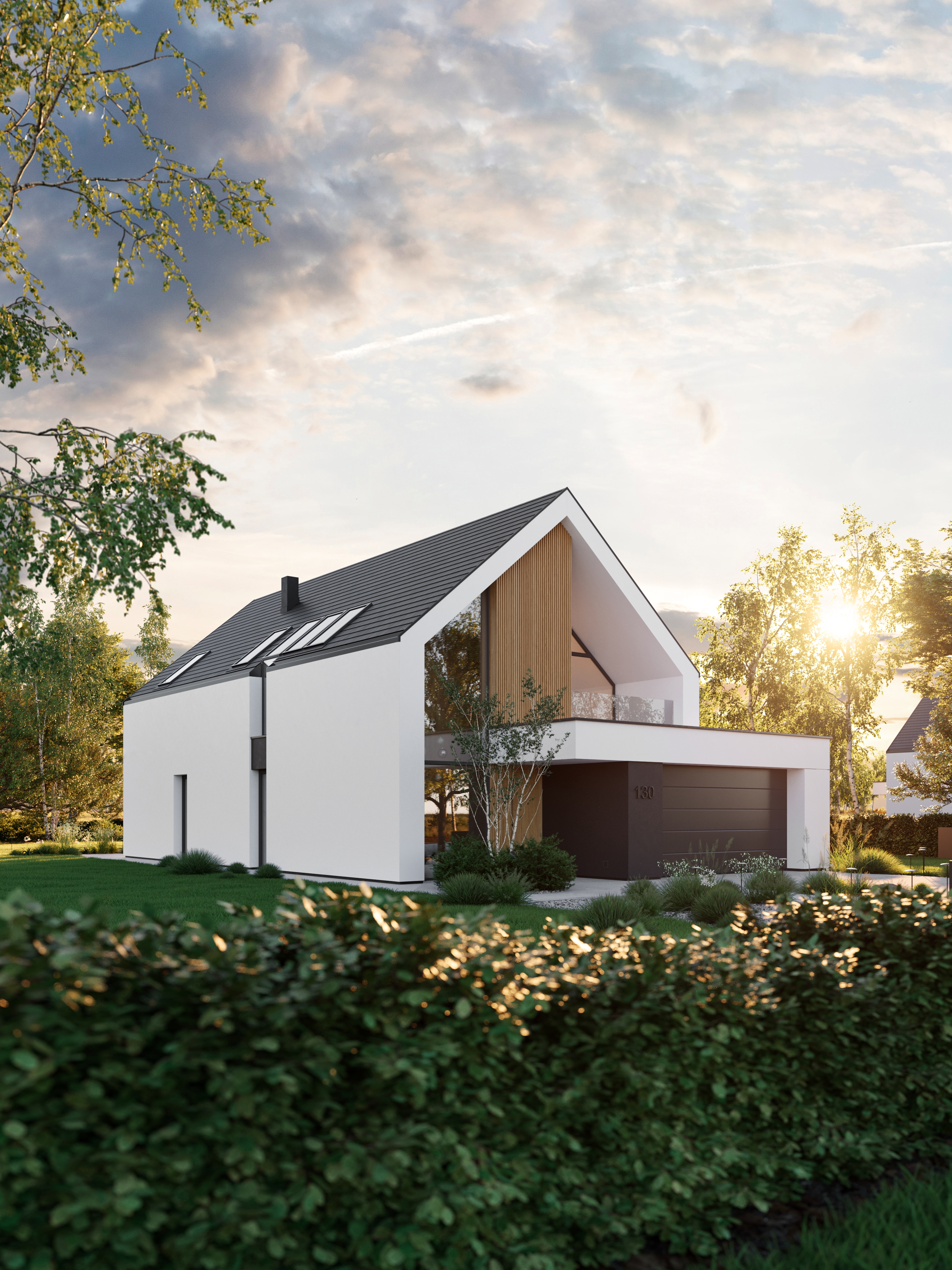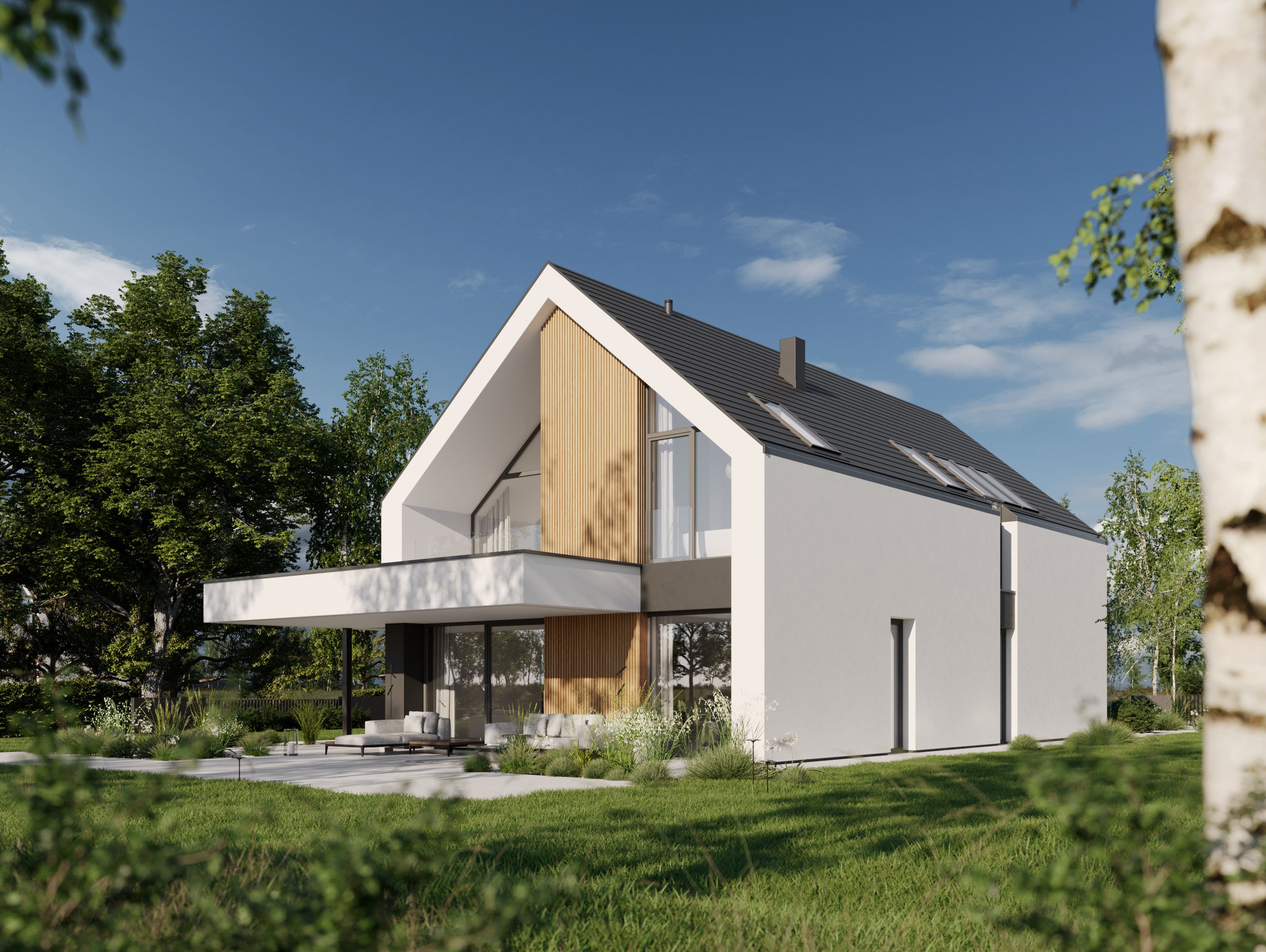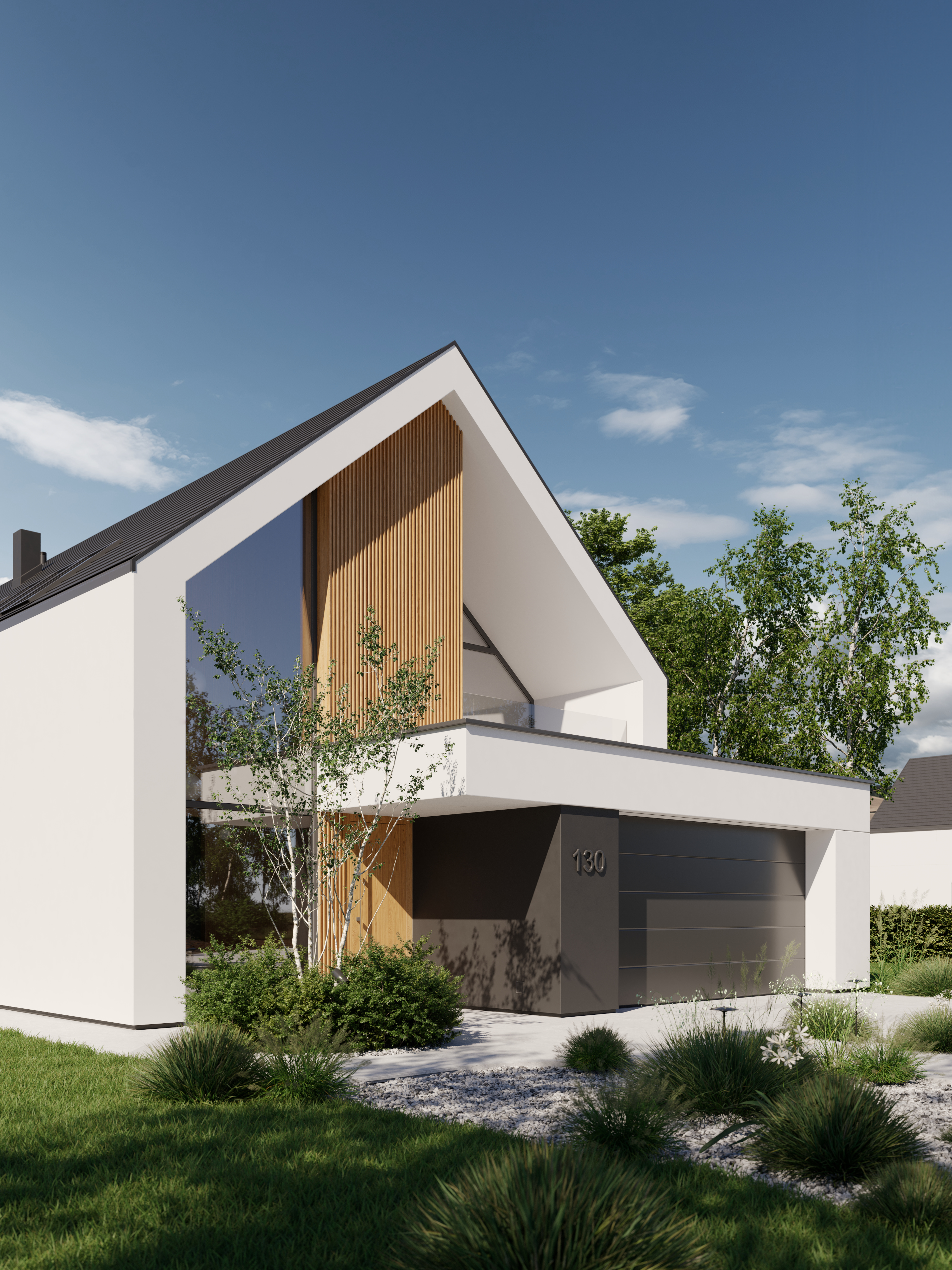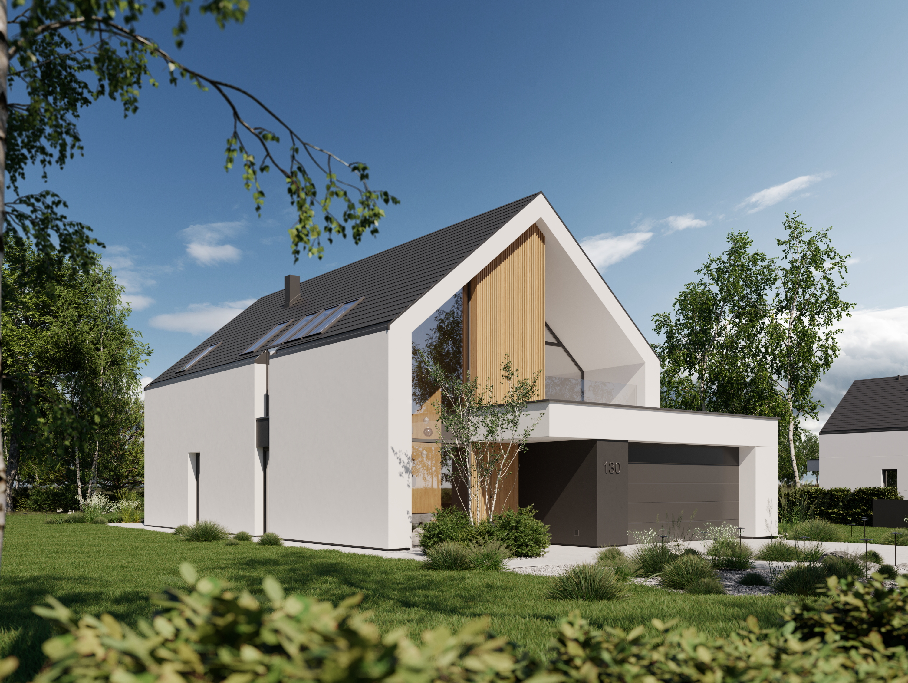 Zachwyca reprezentacyjną strefą wejściową z wysokim na dwie kondygnacje, przeszklonym wiatrołapem. To przestrzeń pełna światła, która już od progu ujmuje swoją elegancją. Cała bryła budynku składa się z dwóch przenikających się form: nowoczesnej stodoły z dwuspadowym dachem oraz wkomponowanego prostopadłościanu. Elewacja łączy biel z ciepłym drewnem i ciemnymi akcentami, nadając całości nowoczesny charakter. Belkowanie nad wejściem i tarasem podkreśla spójność wizualną domu, a także pełni praktyczną funkcję zadaszenia.