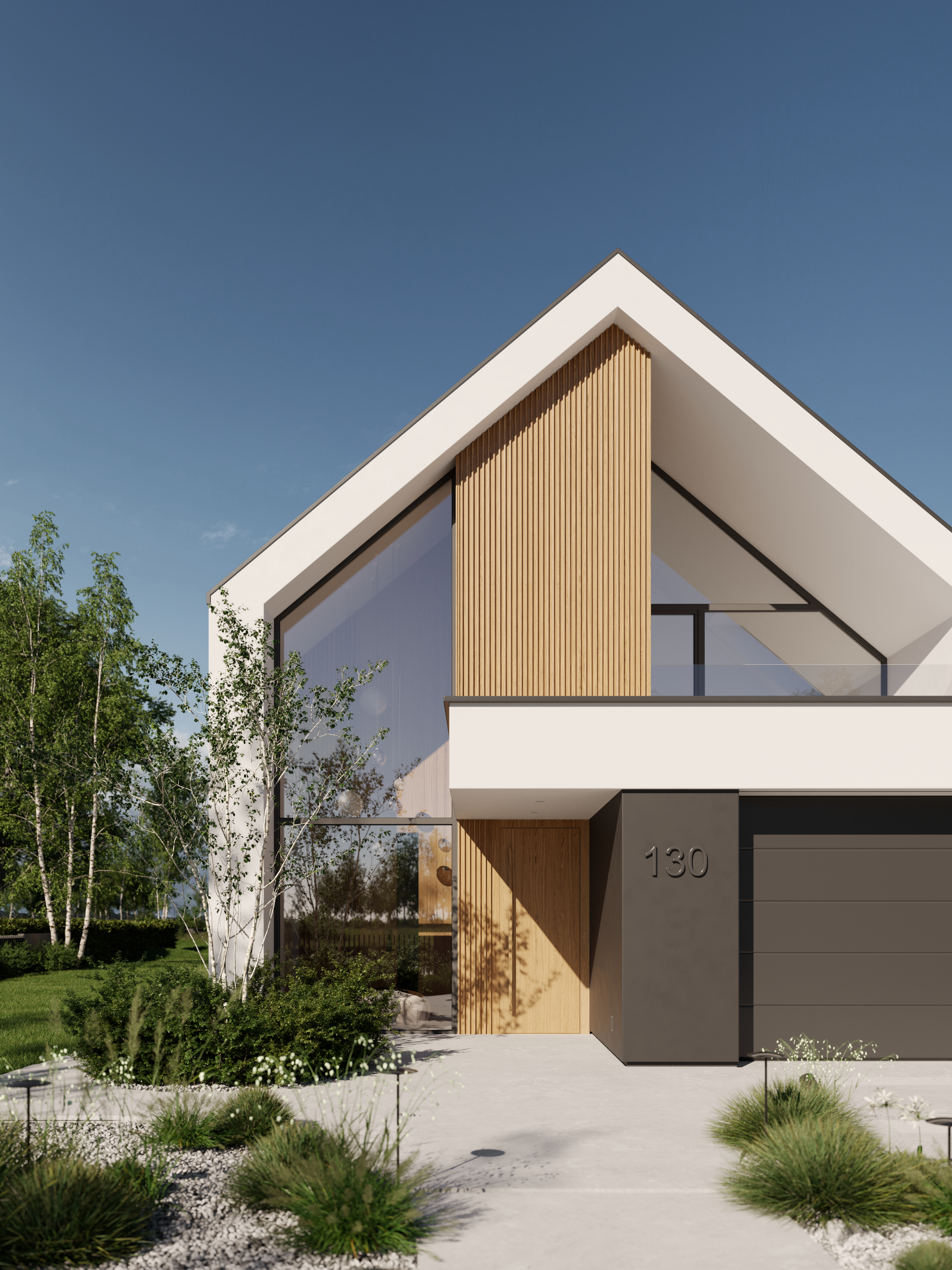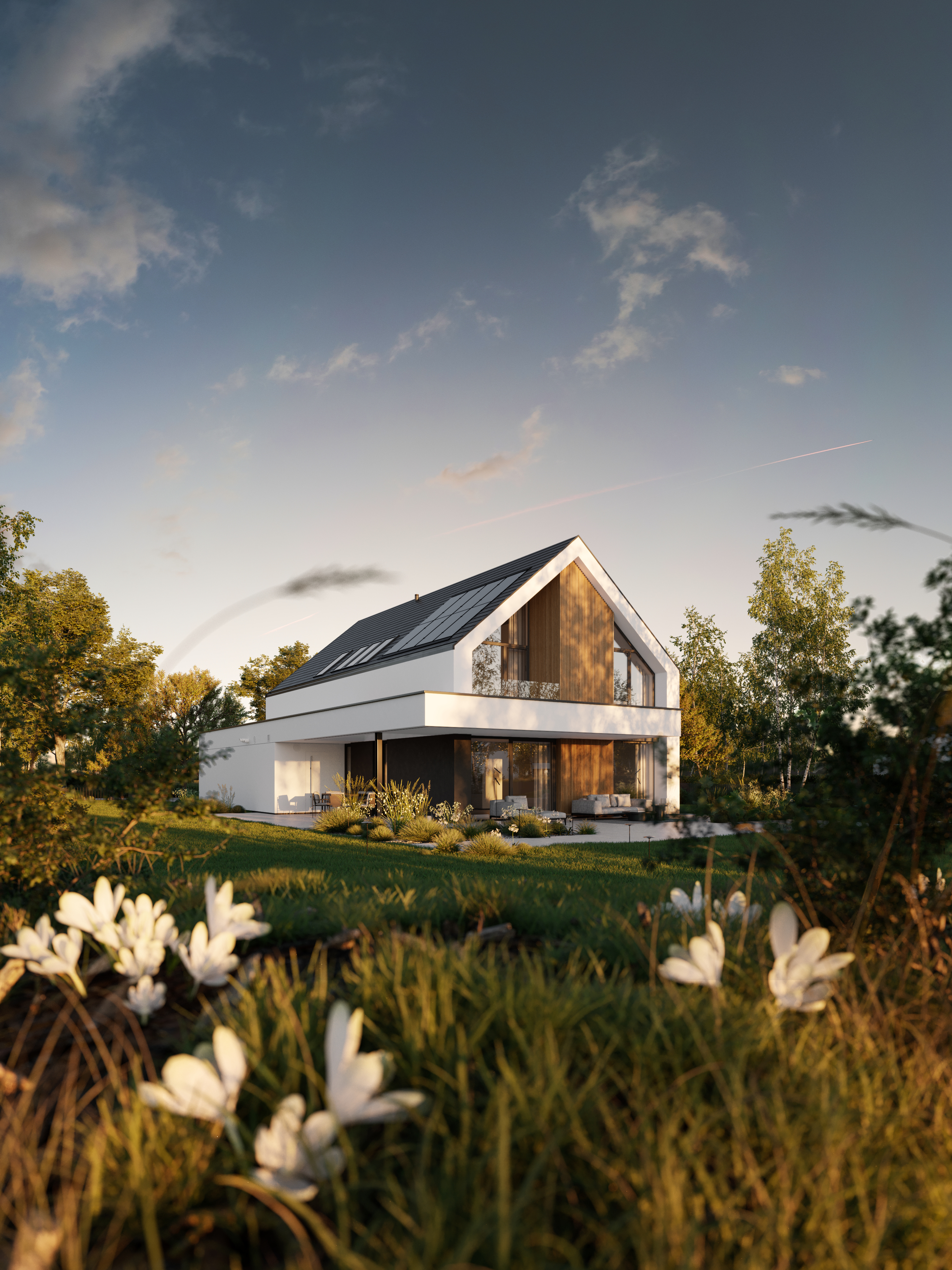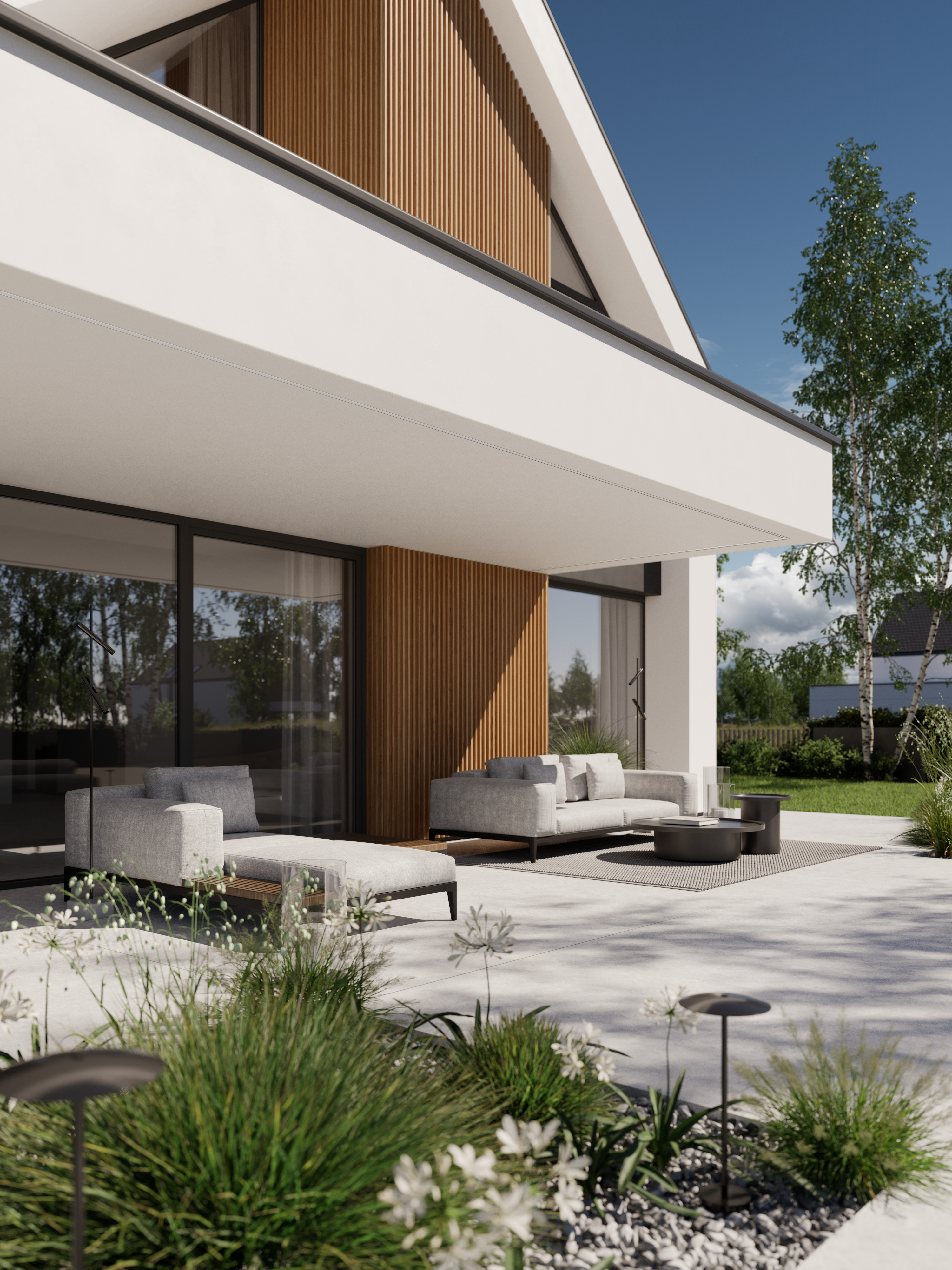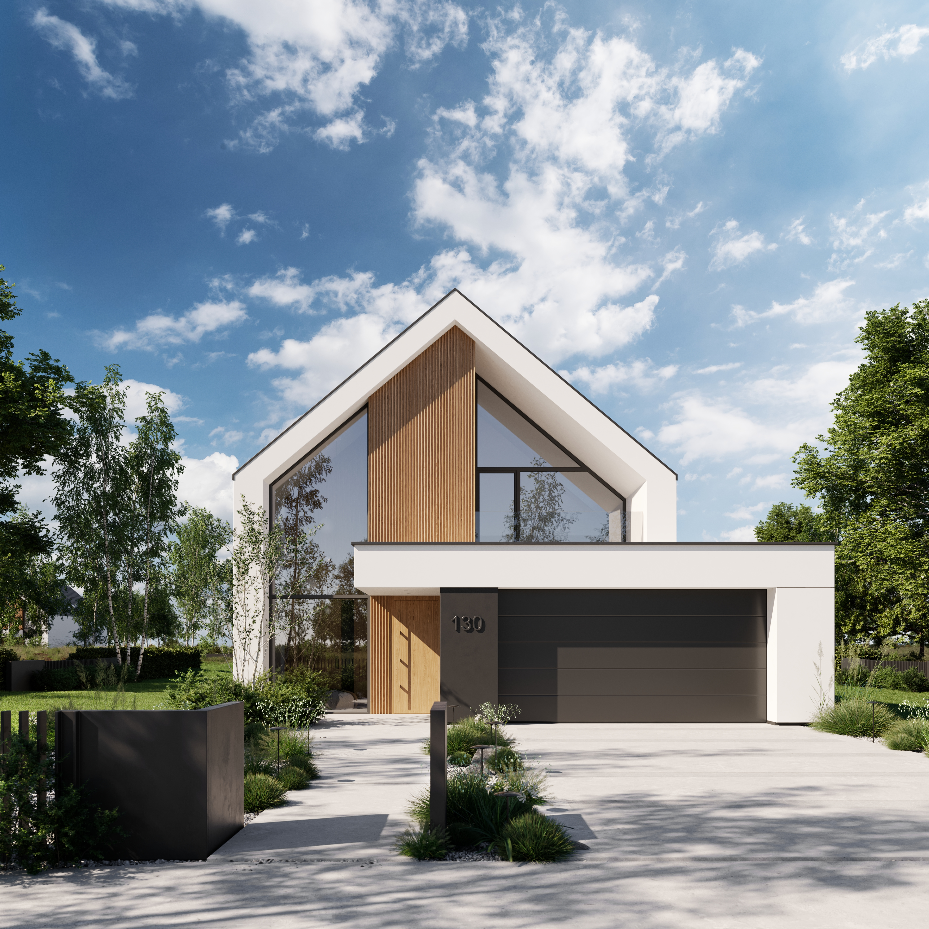 Zachwyca reprezentacyjną strefą wejściową z wysokim na dwie kondygnacje, przeszklonym wiatrołapem. To przestrzeń pełna światła, która już od progu ujmuje swoją elegancją. Cała bryła budynku składa się z dwóch przenikających się form: nowoczesnej stodoły z dwuspadowym dachem oraz wkomponowanego prostopadłościanu. Elewacja łączy biel z ciepłym drewnem i ciemnymi akcentami, nadając całości nowoczesny charakter. Belkowanie nad wejściem i tarasem podkreśla spójność wizualną domu, a także pełni praktyczną funkcję zadaszenia.