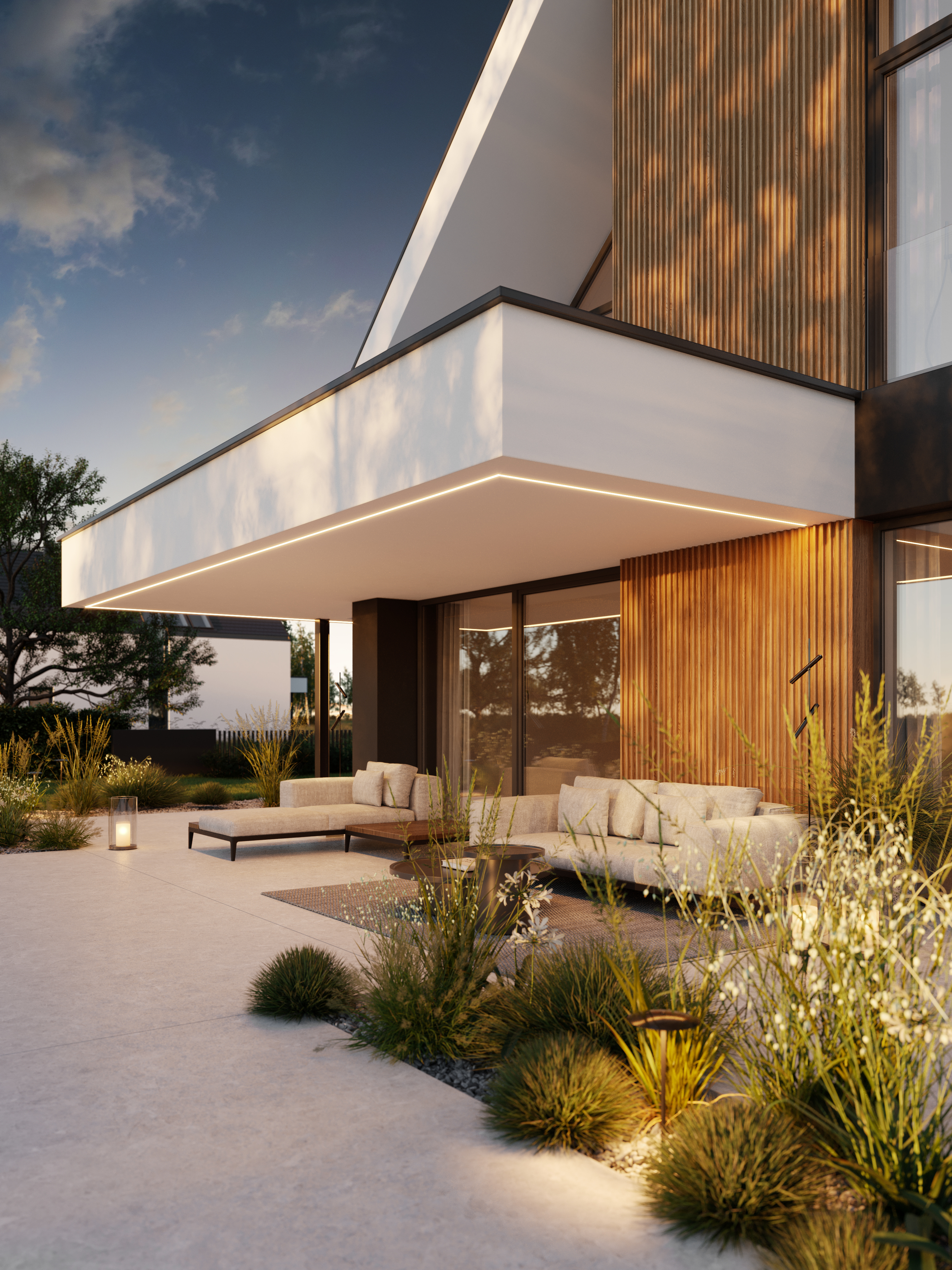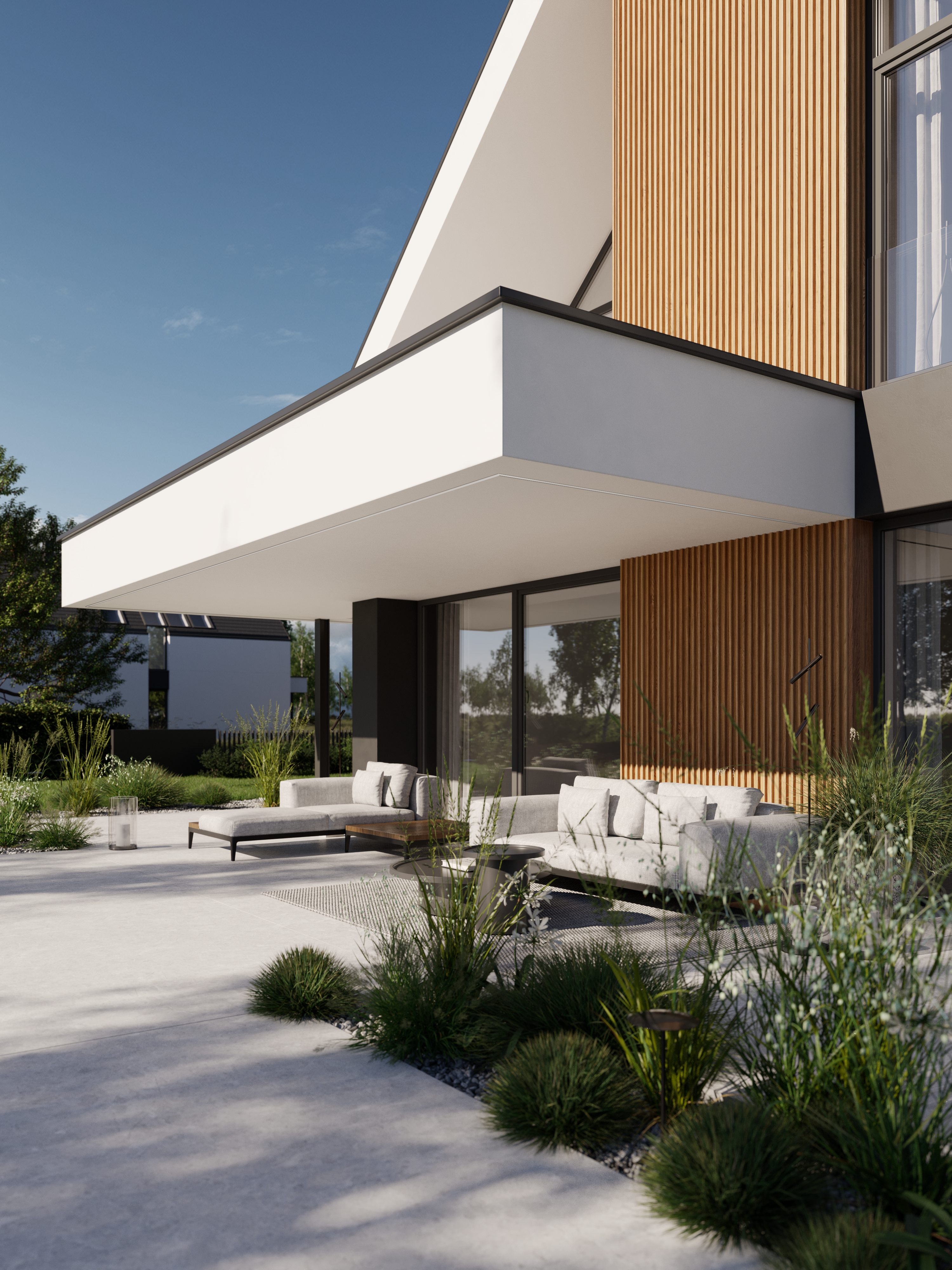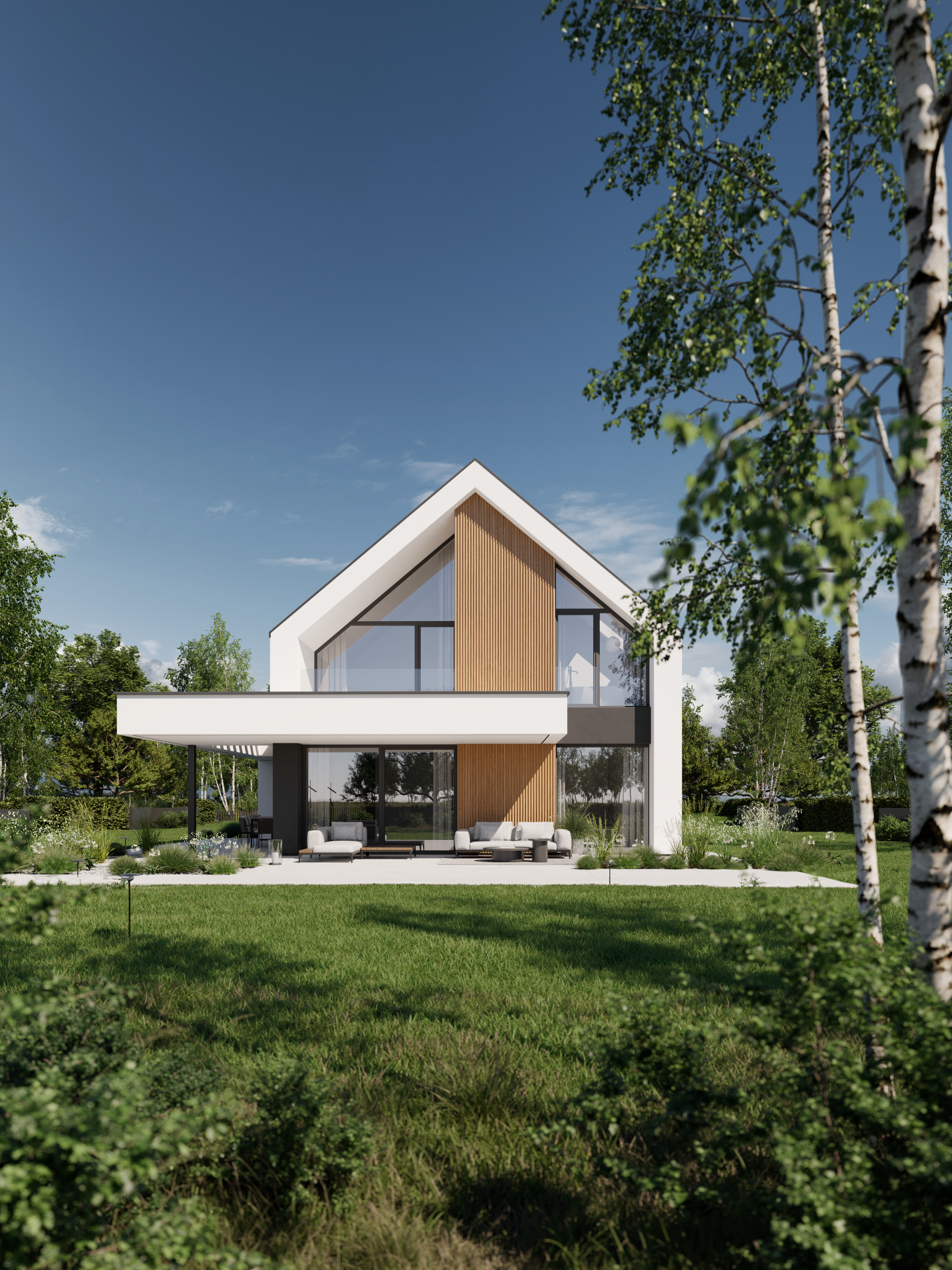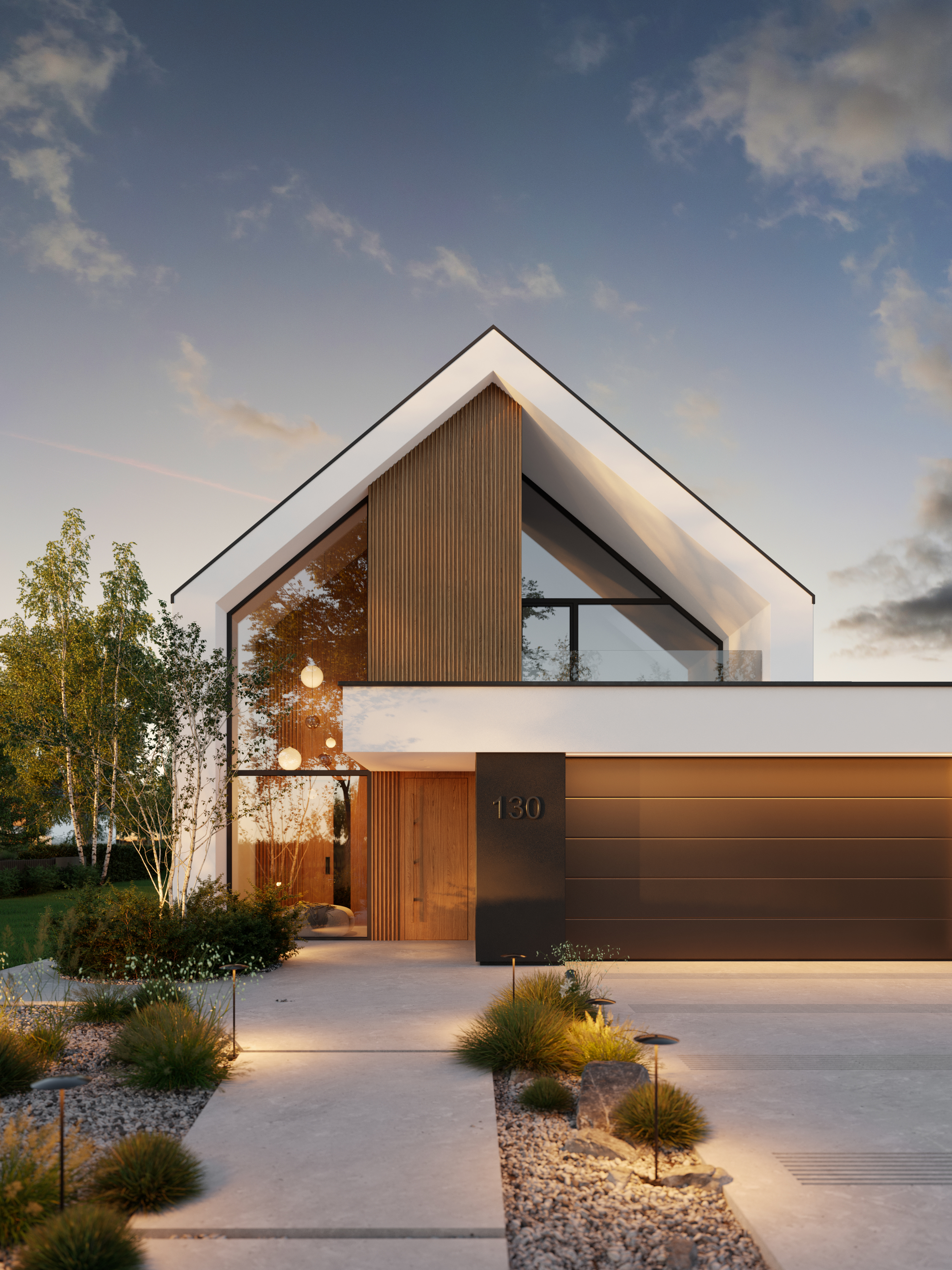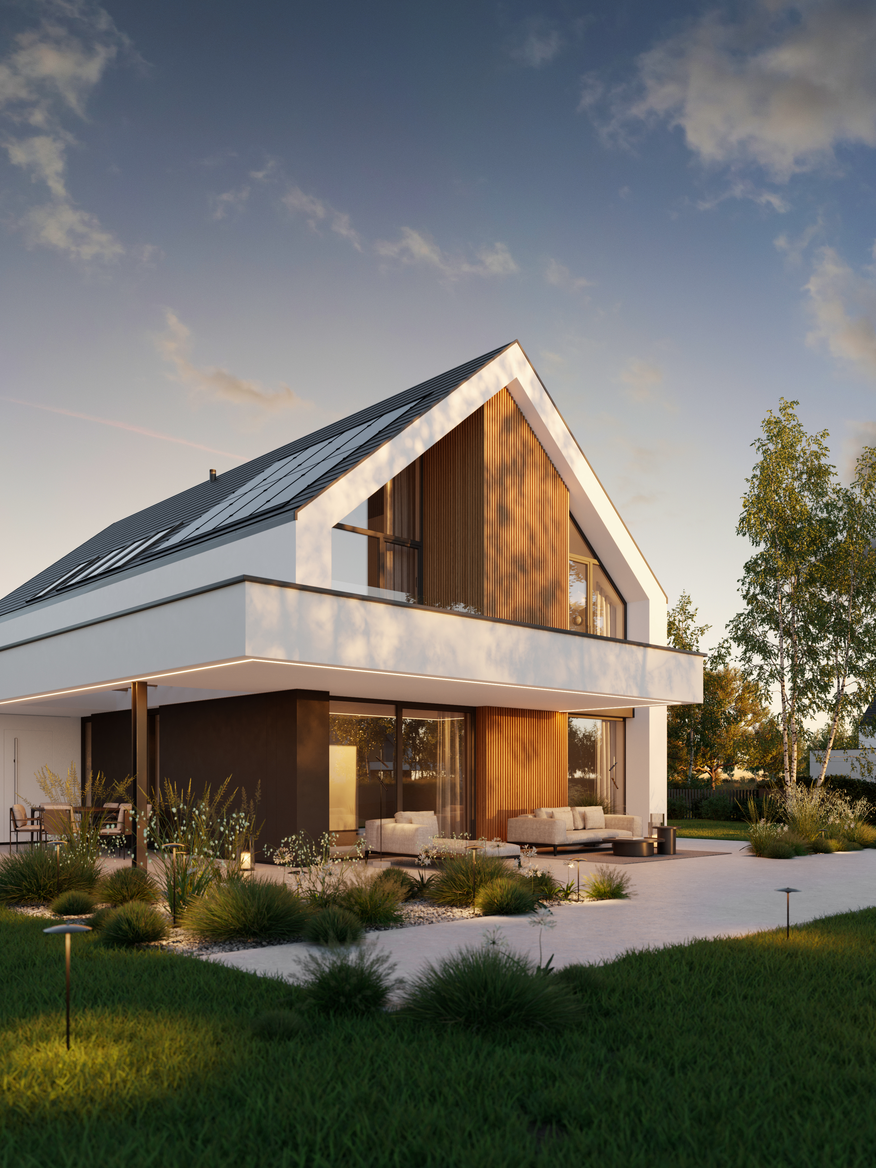 Zachwyca reprezentacyjną strefą wejściową z wysokim na dwie kondygnacje, przeszklonym wiatrołapem. To przestrzeń pełna światła, która już od progu ujmuje swoją elegancją. Cała bryła budynku składa się z dwóch przenikających się form: nowoczesnej stodoły z dwuspadowym dachem oraz wkomponowanego prostopadłościanu. Elewacja łączy biel z ciepłym drewnem i ciemnymi akcentami, nadając całości nowoczesny charakter. Belkowanie nad wejściem i tarasem podkreśla spójność wizualną domu, a także pełni praktyczną funkcję zadaszenia.