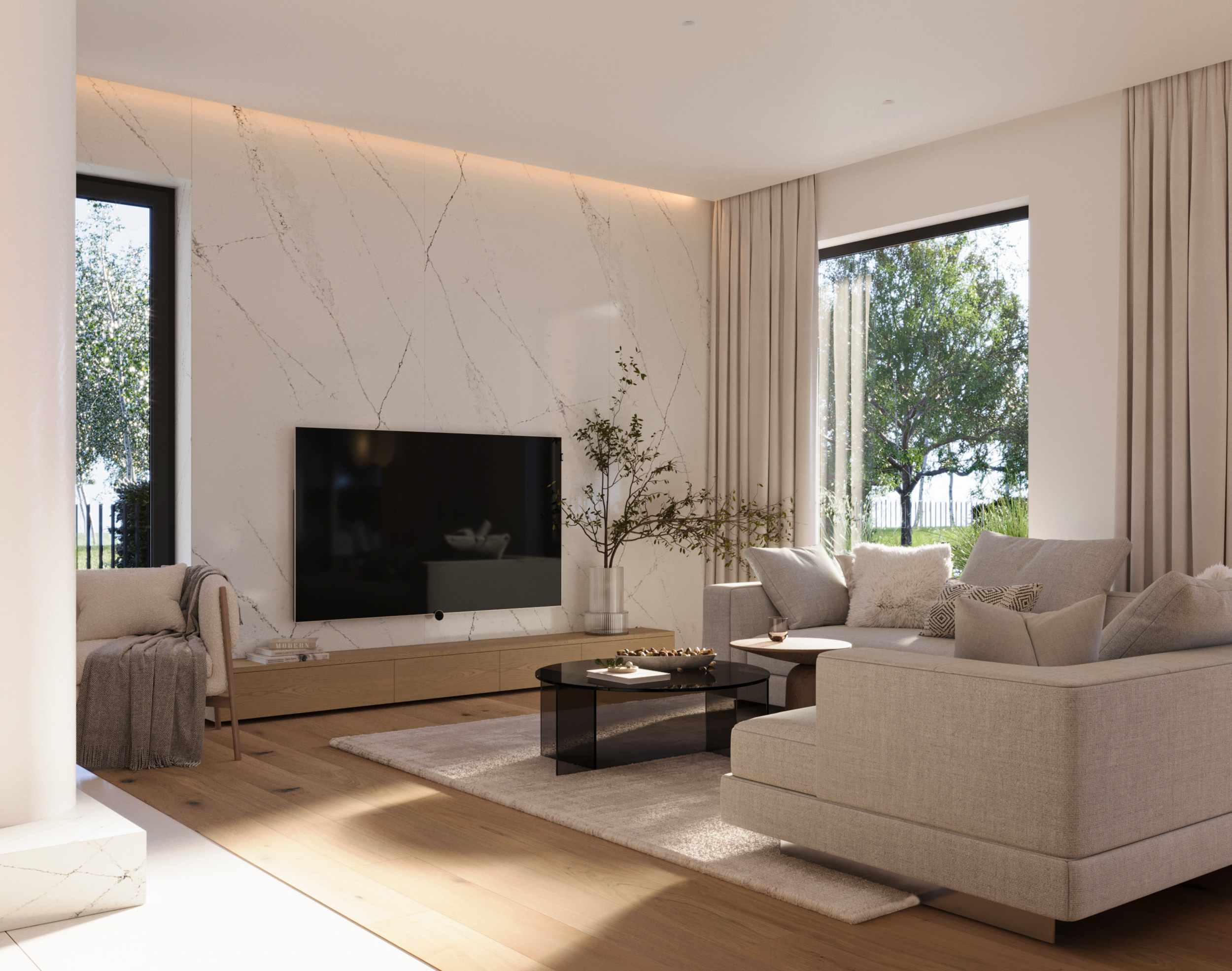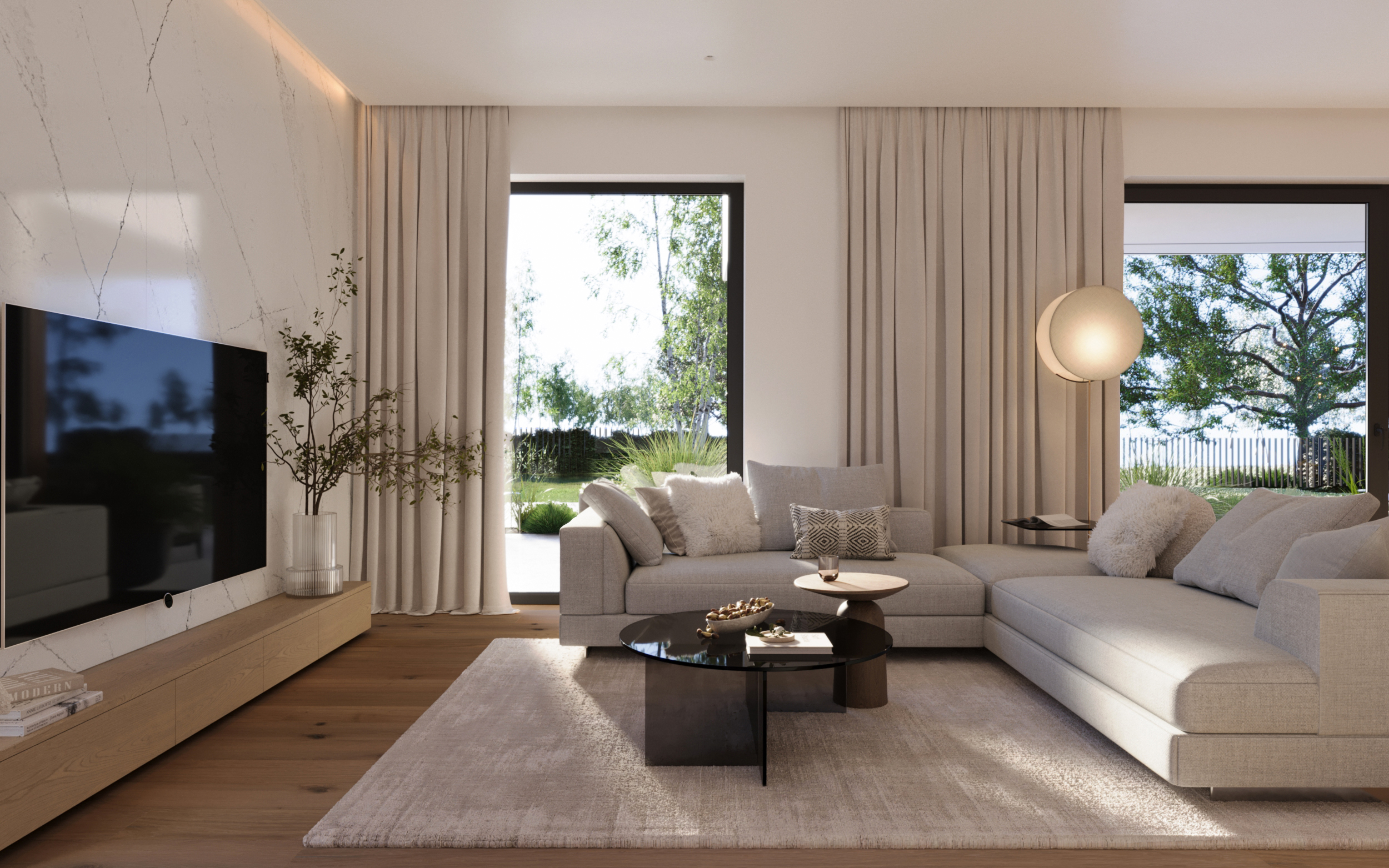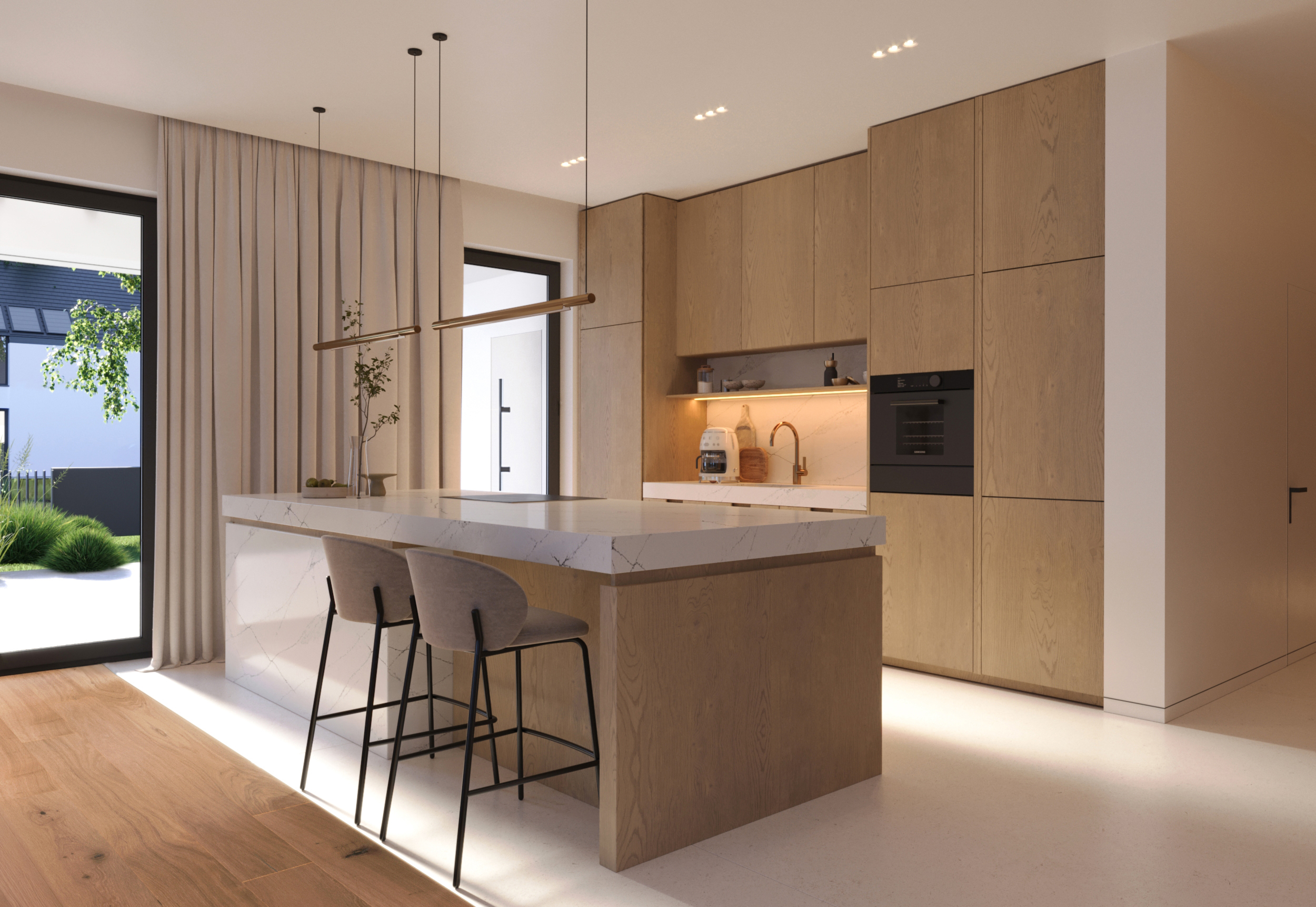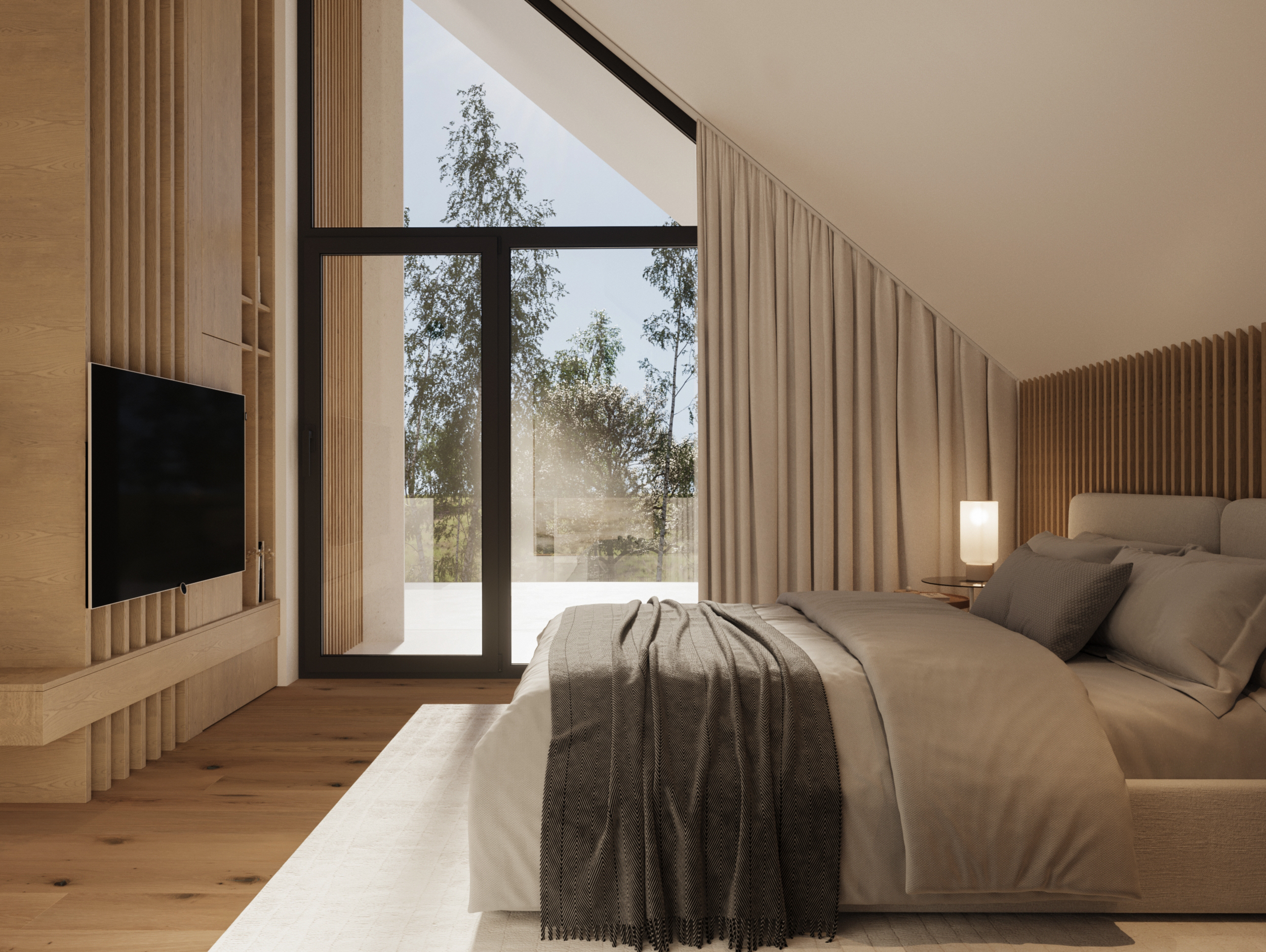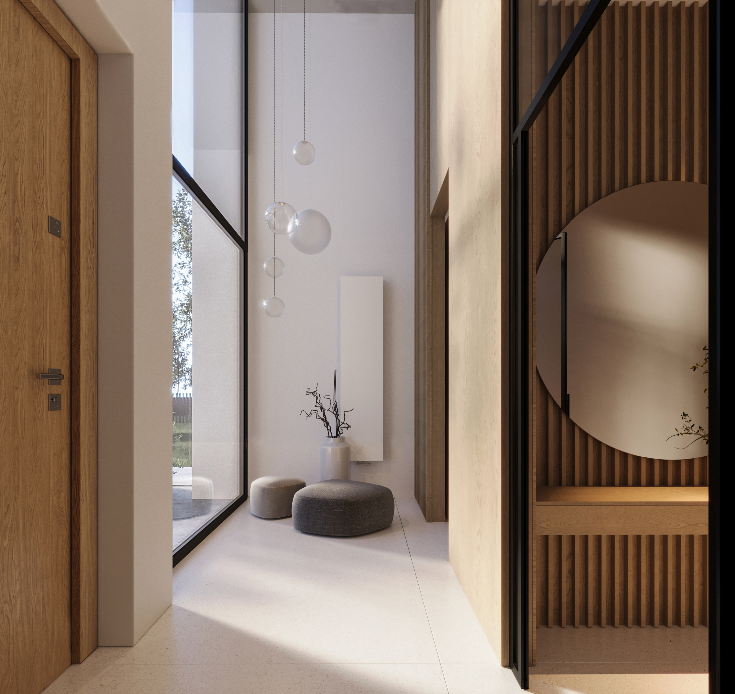 Zachwyca reprezentacyjną strefą wejściową z wysokim na dwie kondygnacje, przeszklonym wiatrołapem. To przestrzeń pełna światła, która już od progu ujmuje swoją elegancją. Cała bryła budynku składa się z dwóch przenikających się form: nowoczesnej stodoły z dwuspadowym dachem oraz wkomponowanego prostopadłościanu. Elewacja łączy biel z ciepłym drewnem i ciemnymi akcentami, nadając całości nowoczesny charakter. Belkowanie nad wejściem i tarasem podkreśla spójność wizualną domu, a także pełni praktyczną funkcję zadaszenia.