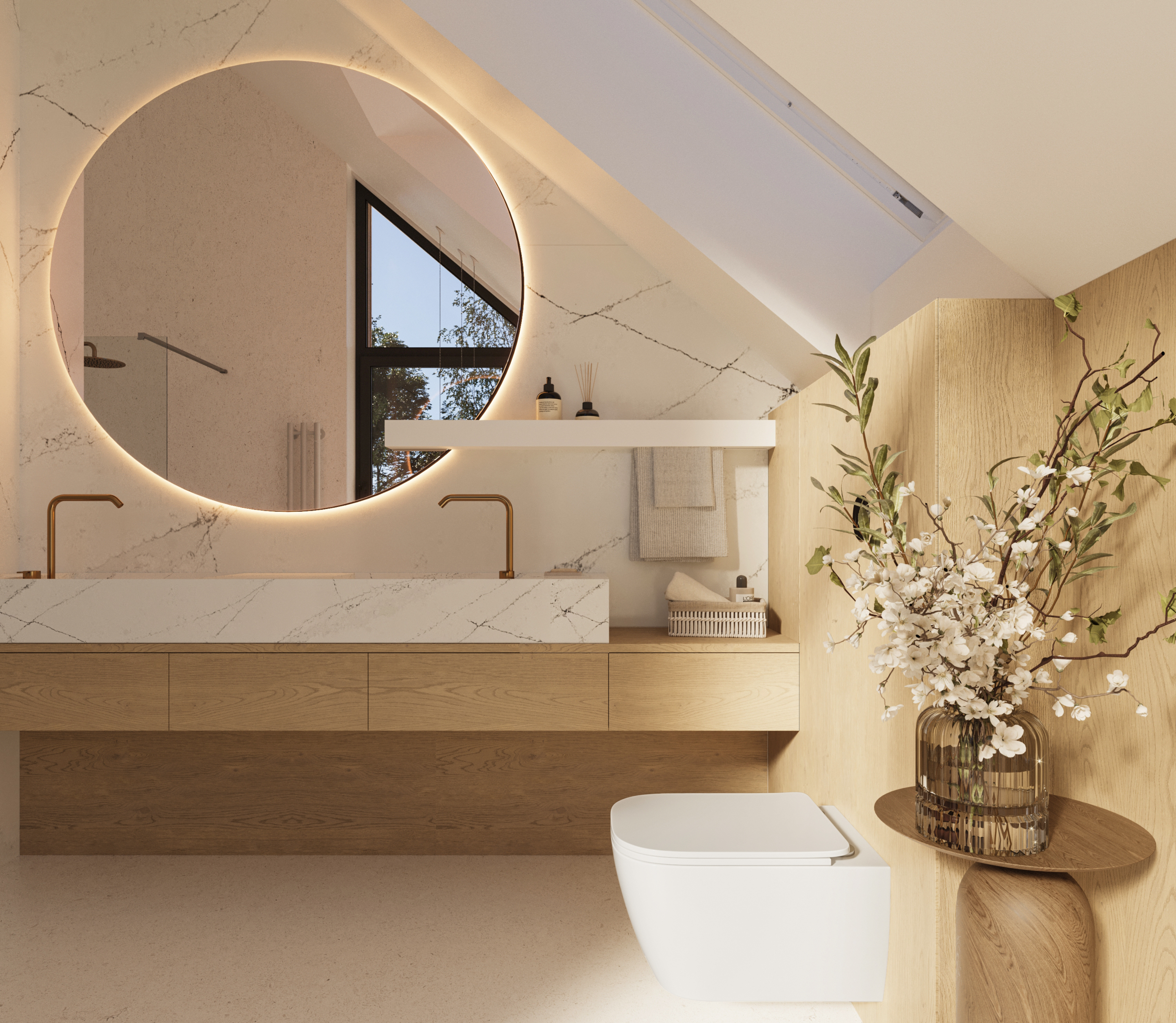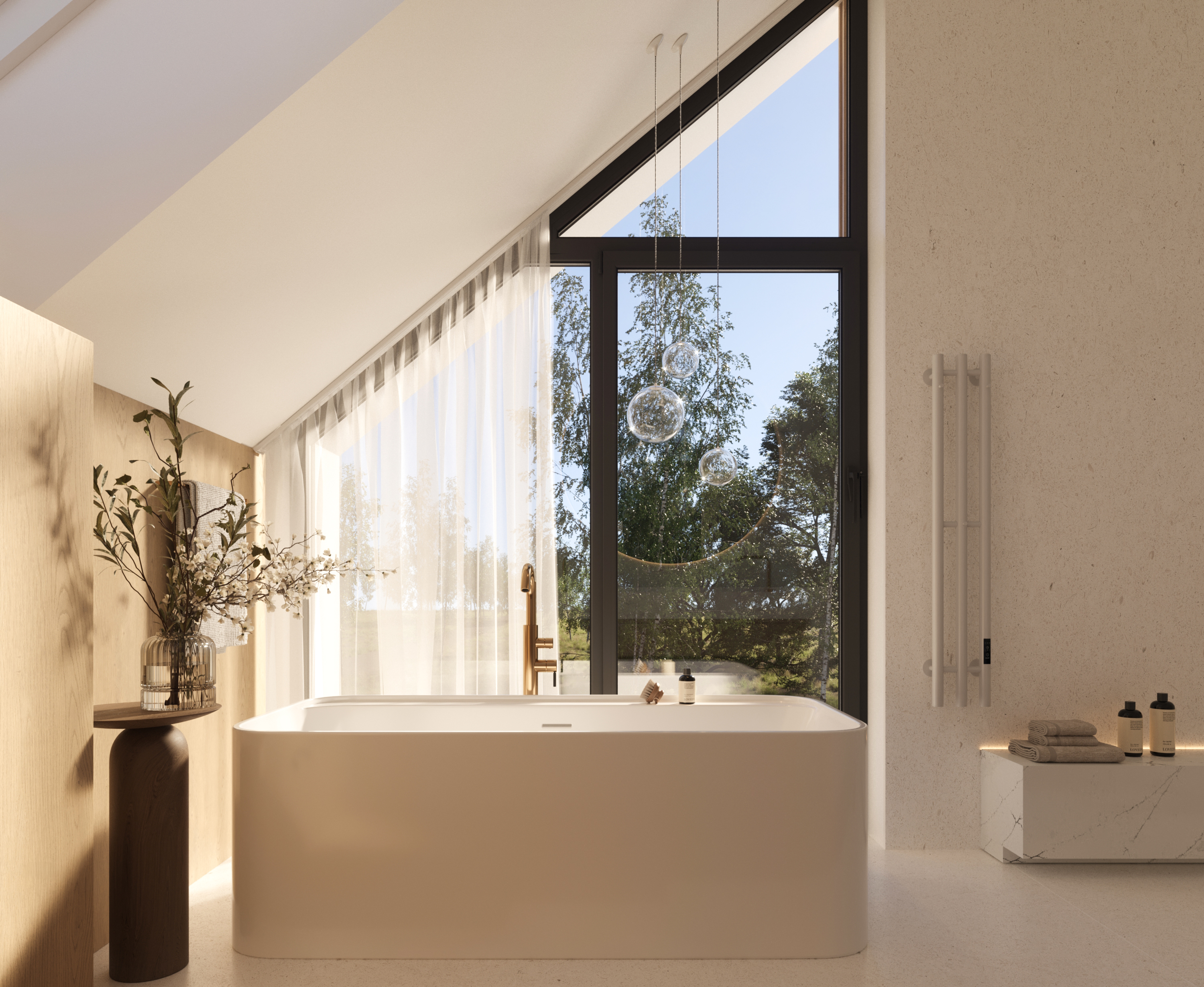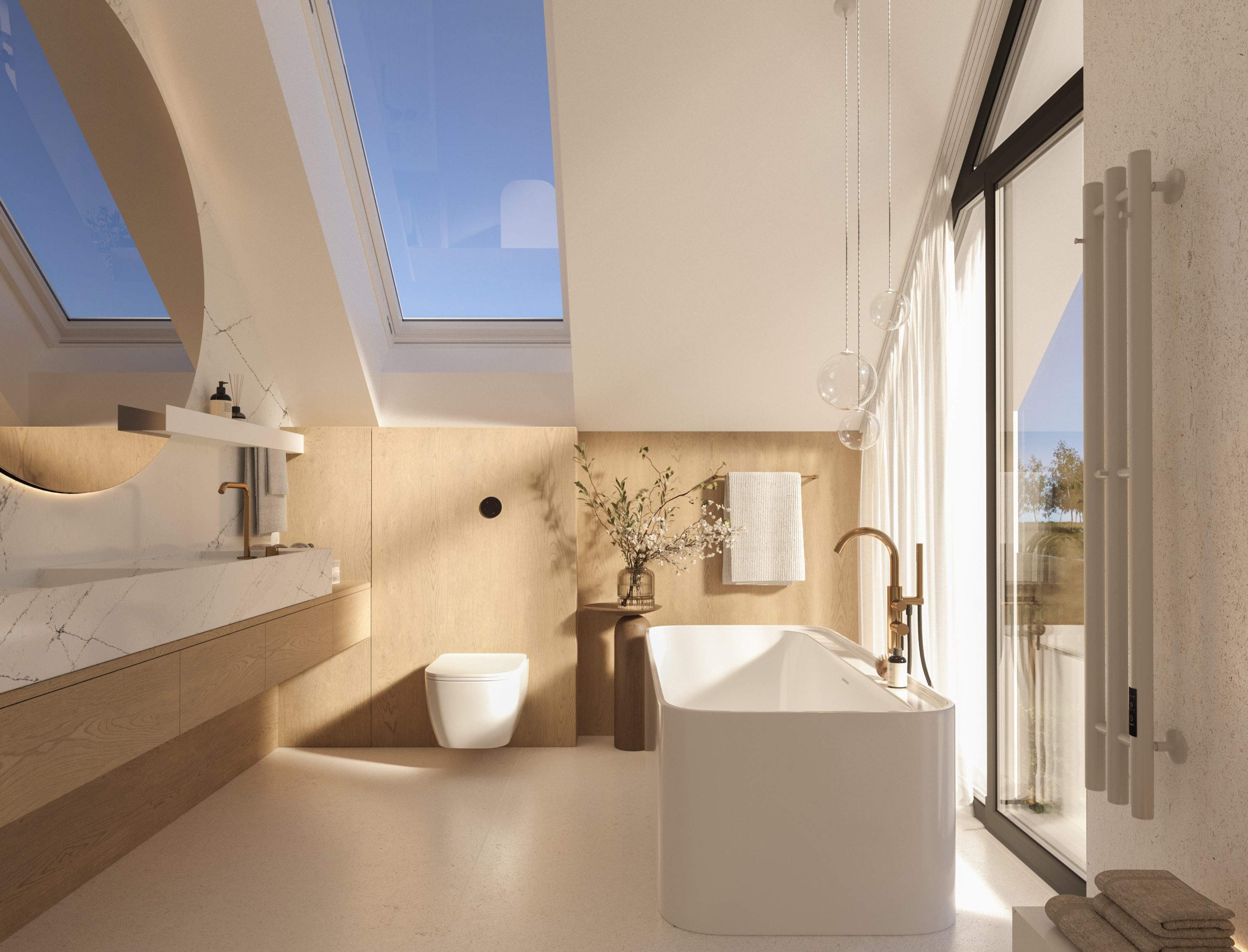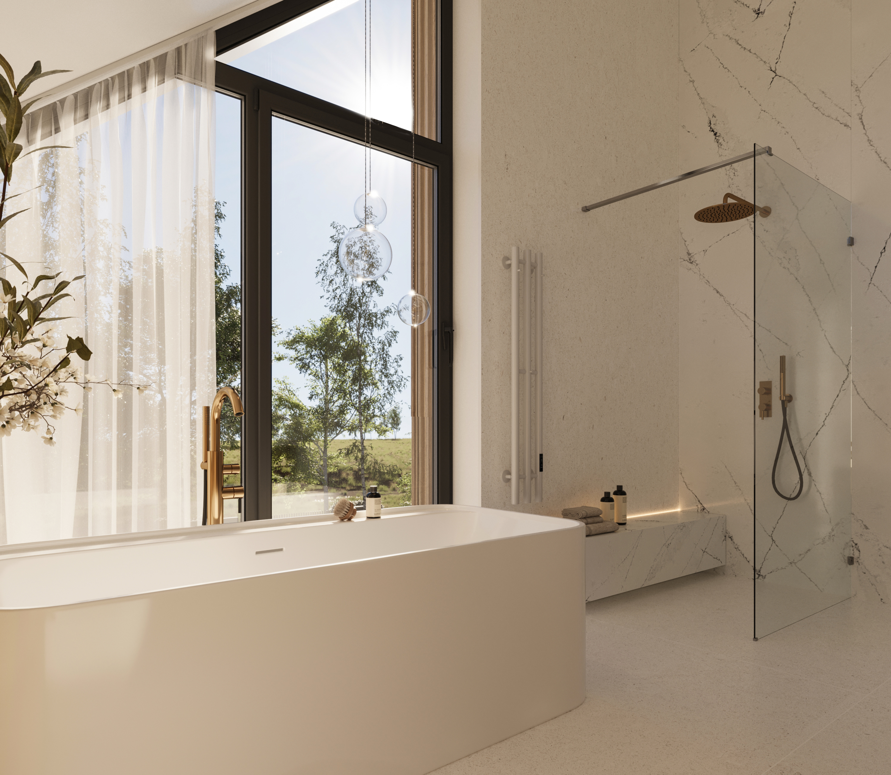 Łazienka przy master bedroom - przeszklenie od podłogi do sufitu zapewni niezapomniane wrażenia miłośnikom kąpieli z widokiem.