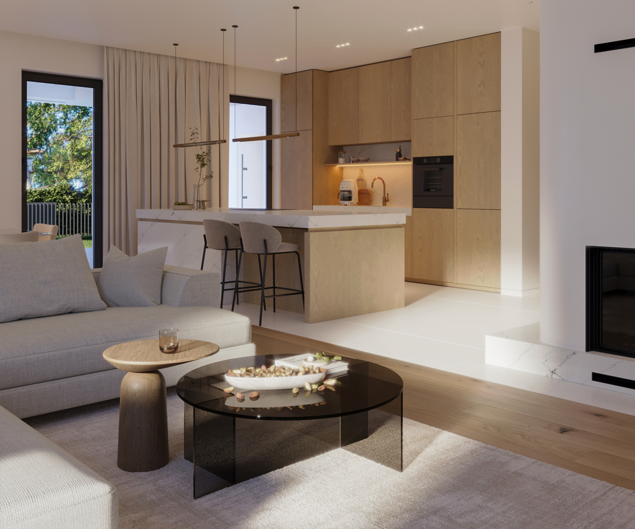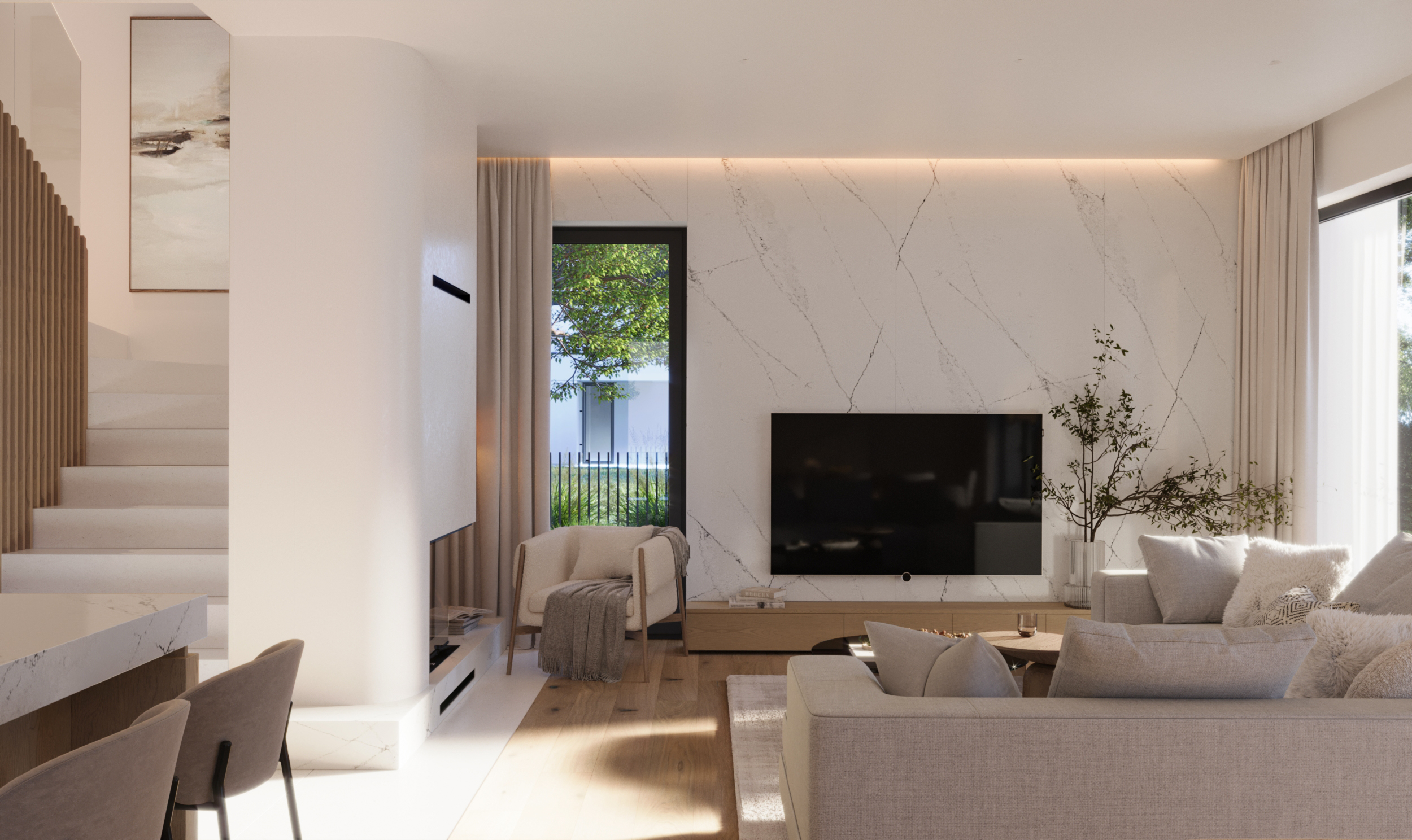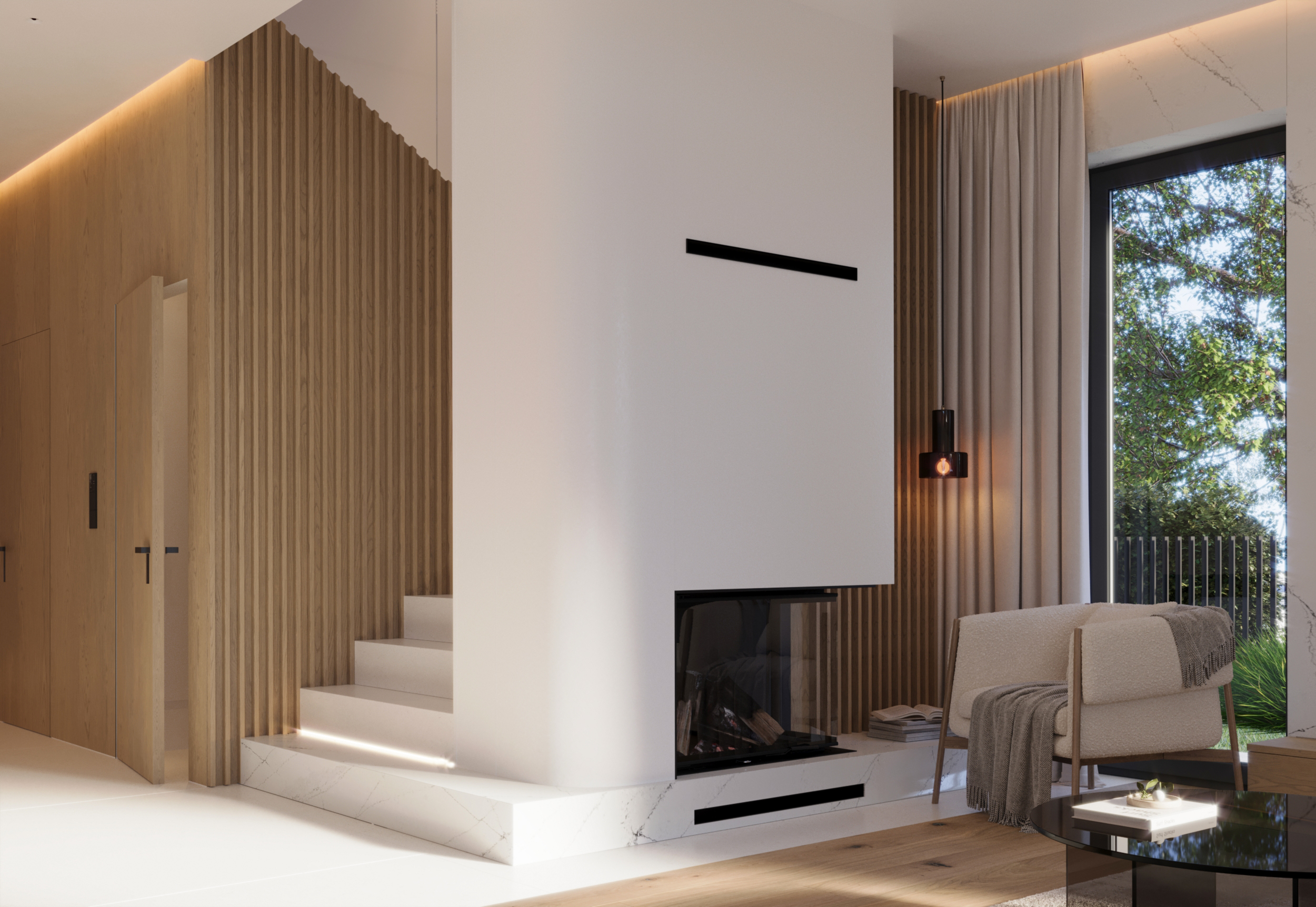 Ściana kominkowa w salonie - ciekawie połączona z pierwszym stopniem schodów, estetyka w połączeniu z otwarciem optycznym przestrzeni.