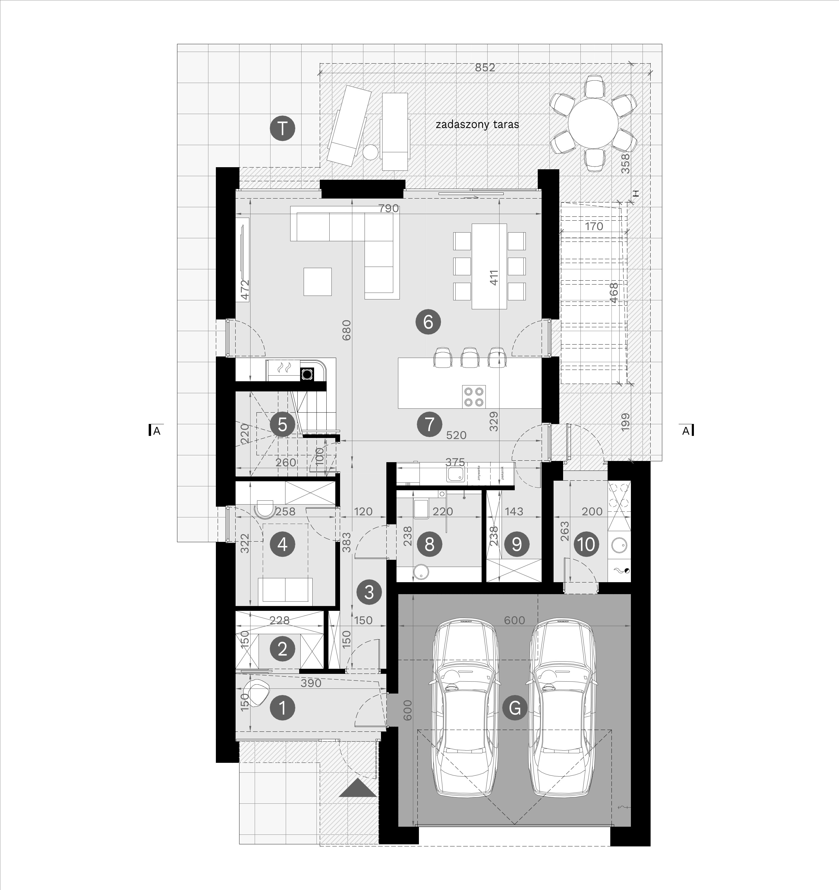 Komunikacyjny majstersztyk strefy dziennej - praktycznie z każdego miejsca tej strefy możecie wyjść do ogrodu lub na częściowo zadaszony, częściowo ukryty przed słońcem pod pergolą taras.