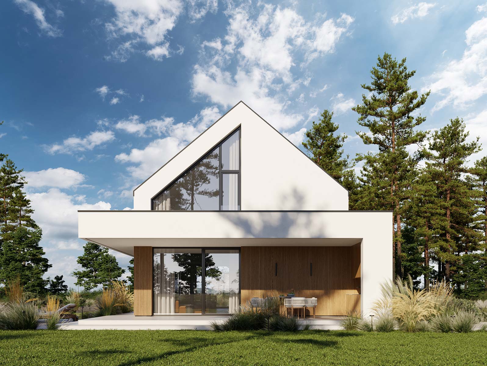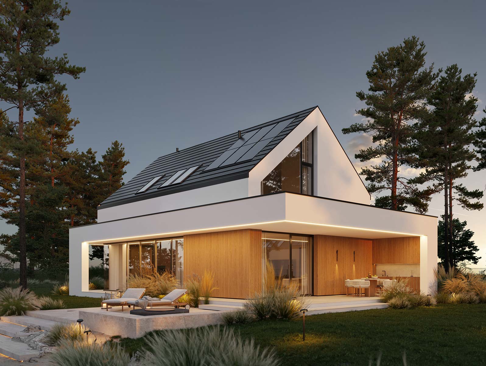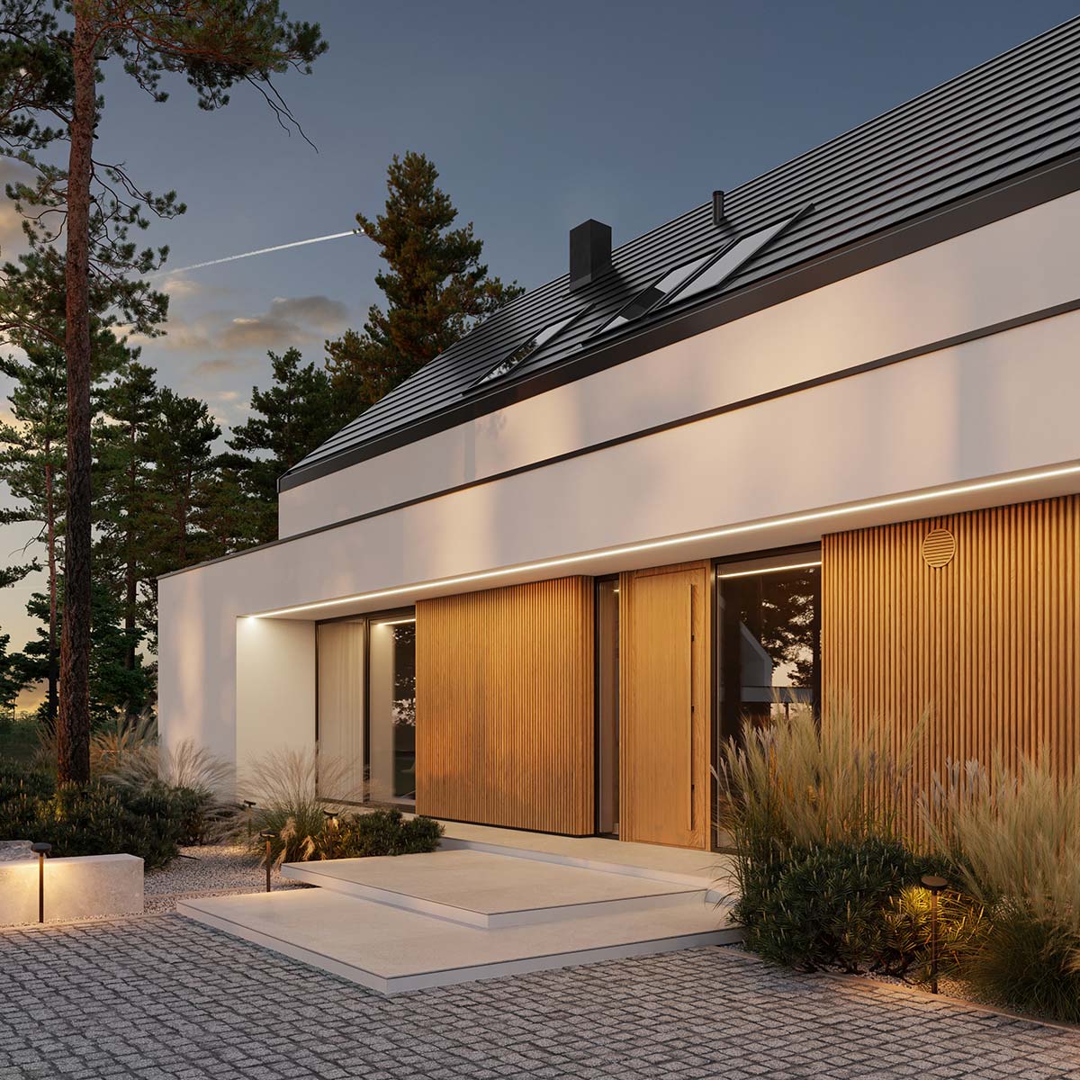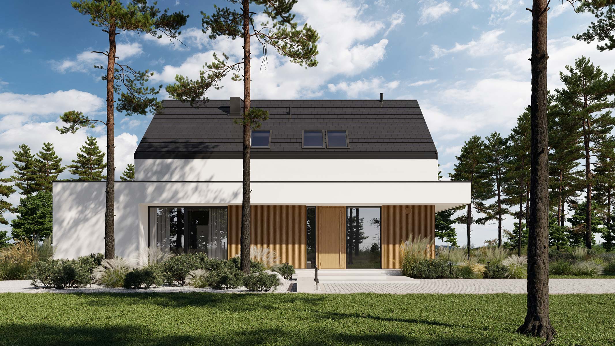 - elewacja: tynk silikonowy połączony z deską elewacyjną lamelową