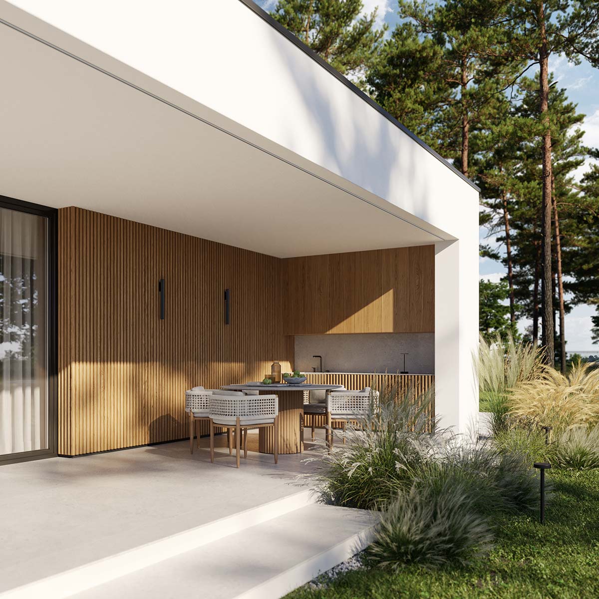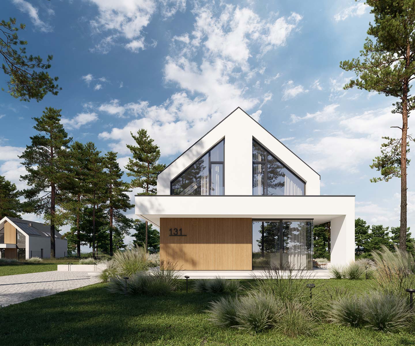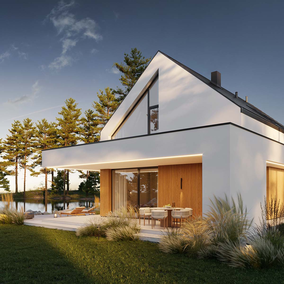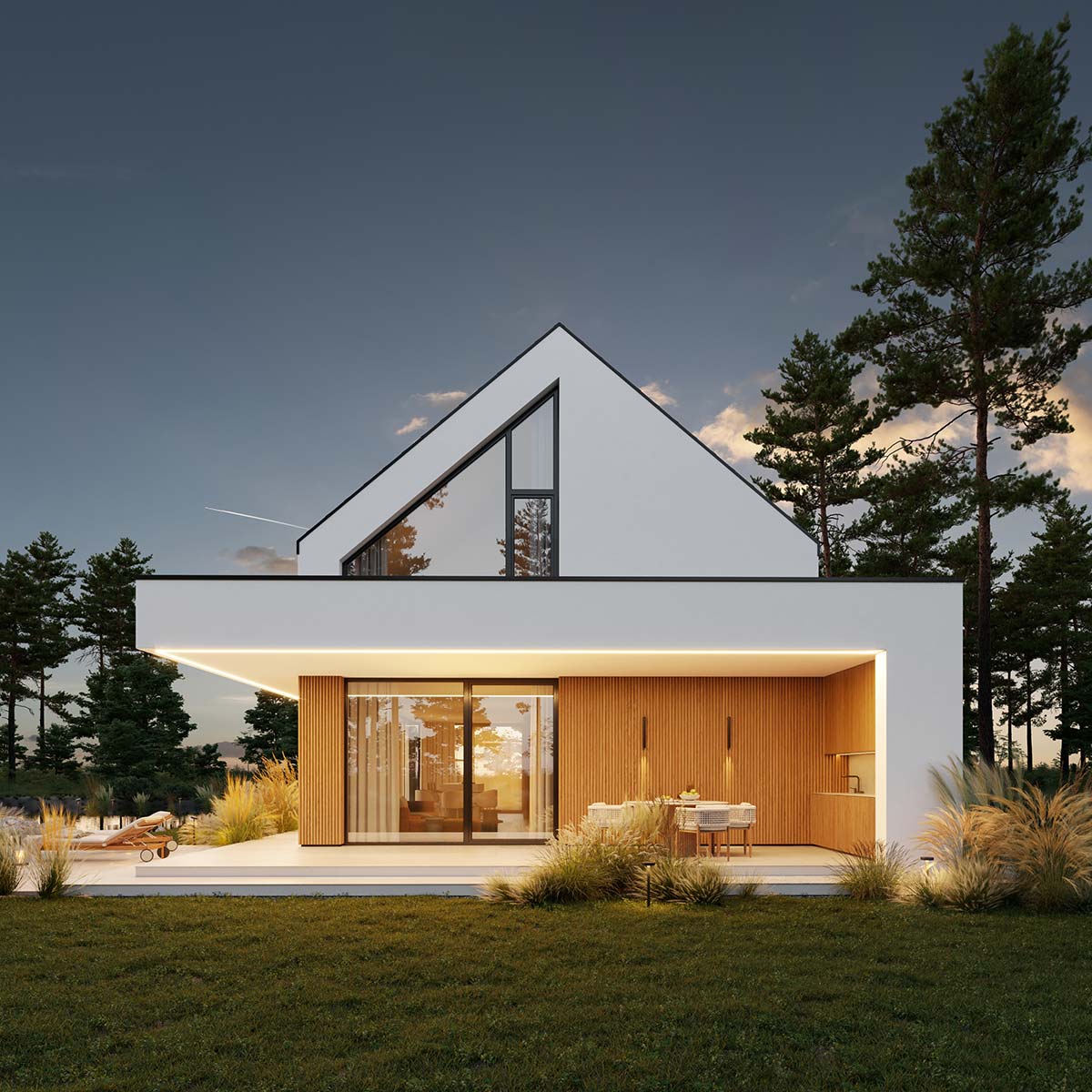 - elewacja: tynk silikonowy połączony z deską elewacyjną lamelową