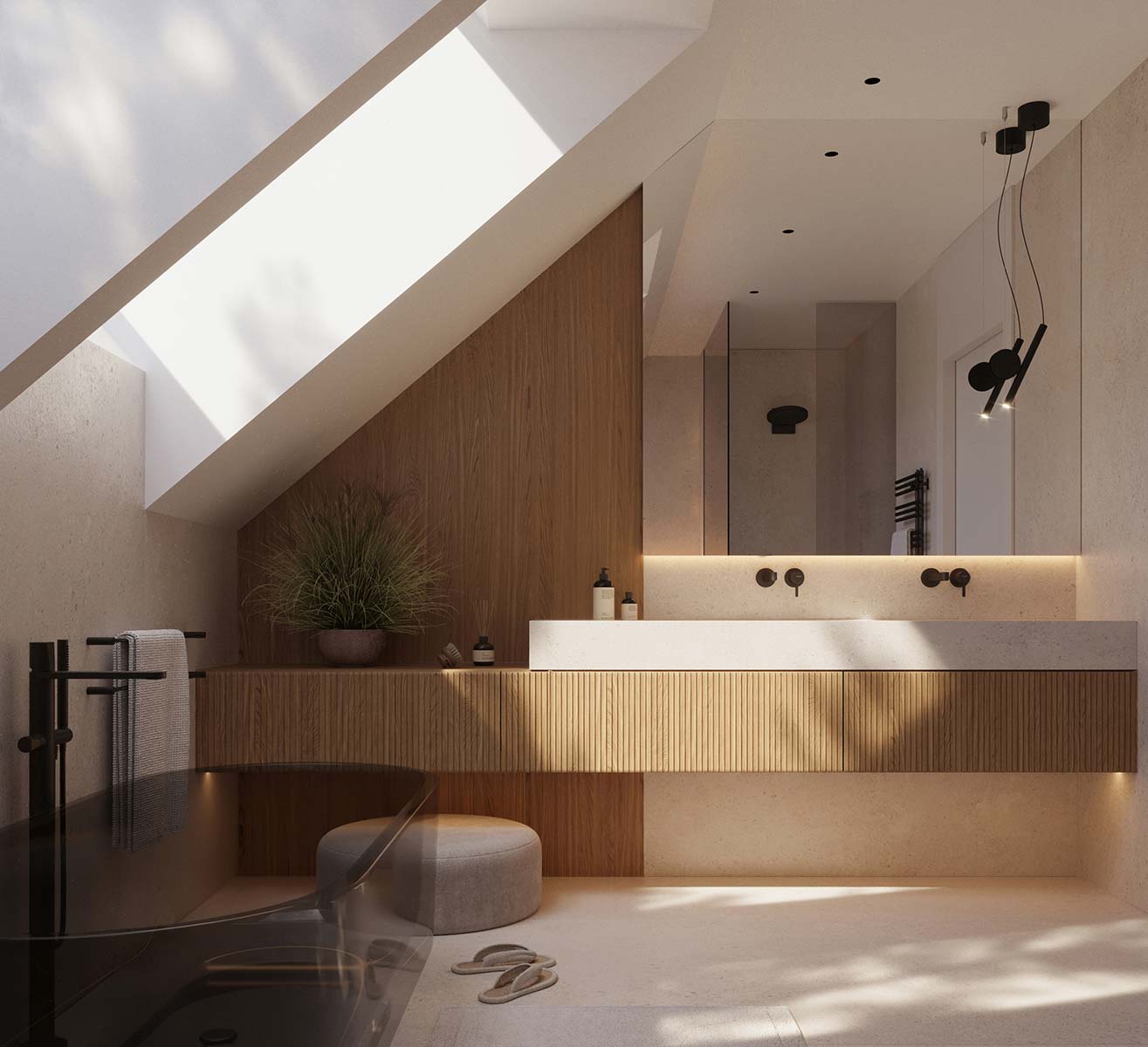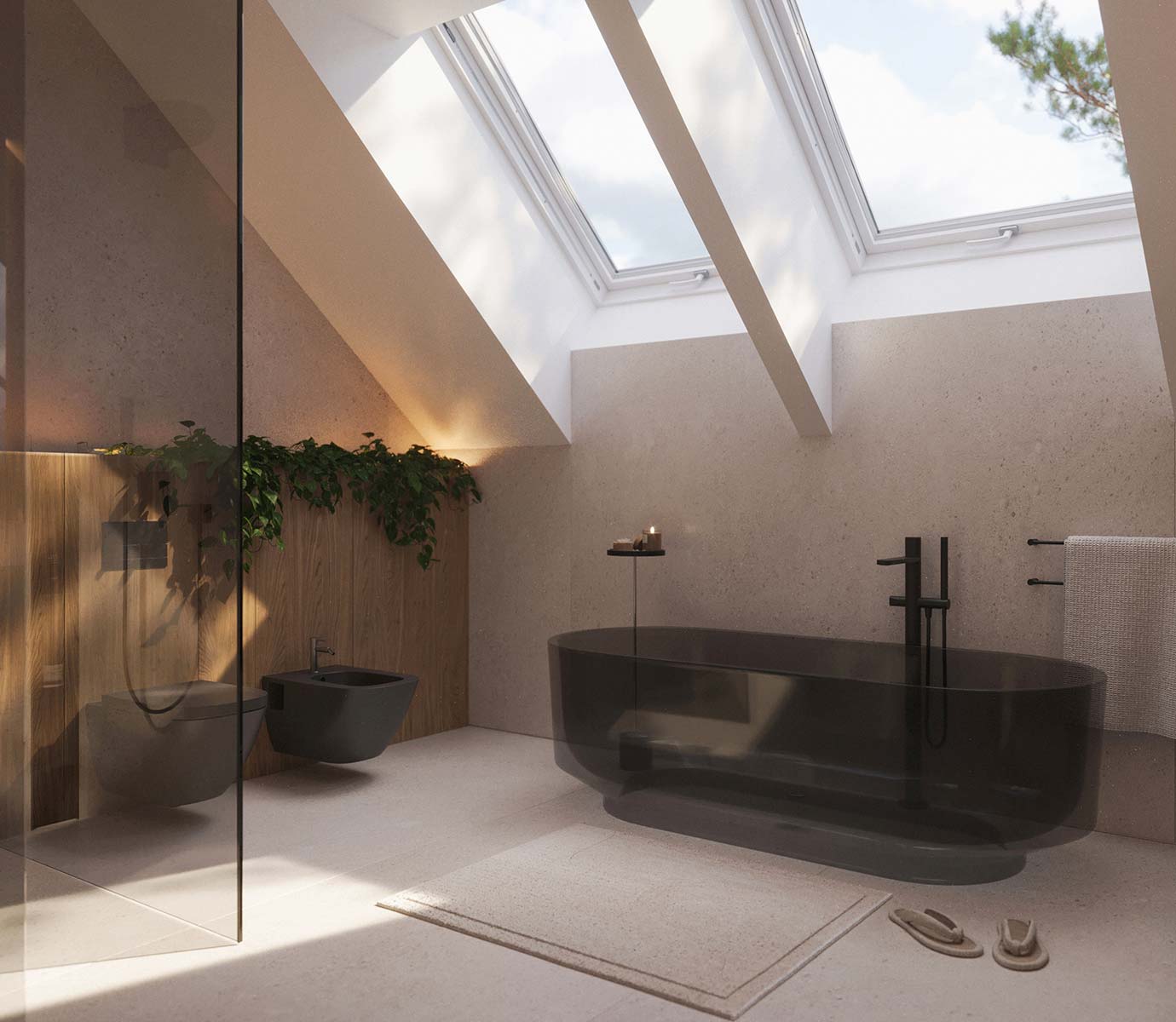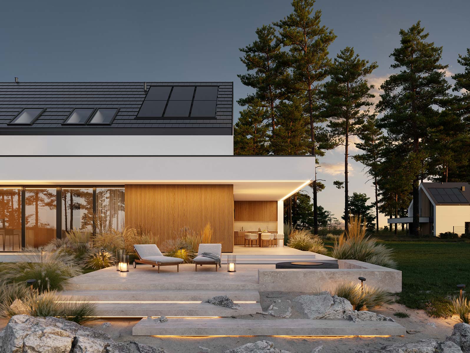 - dach dwuspadowy kryty dachówką ceramiczną lub cementową swissporTON wraz z systemem fotowoltaicznym SunLACE, okna dachowe FAKRO
