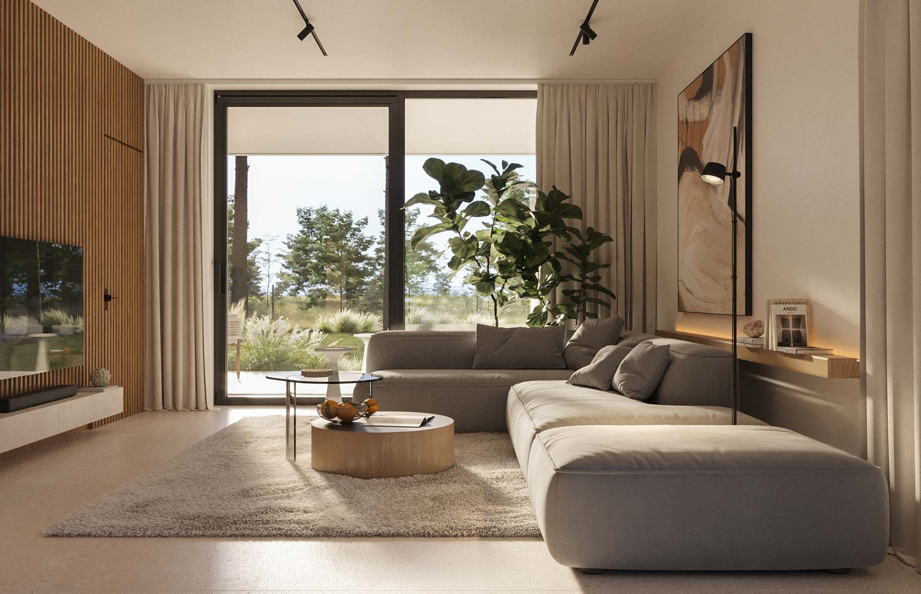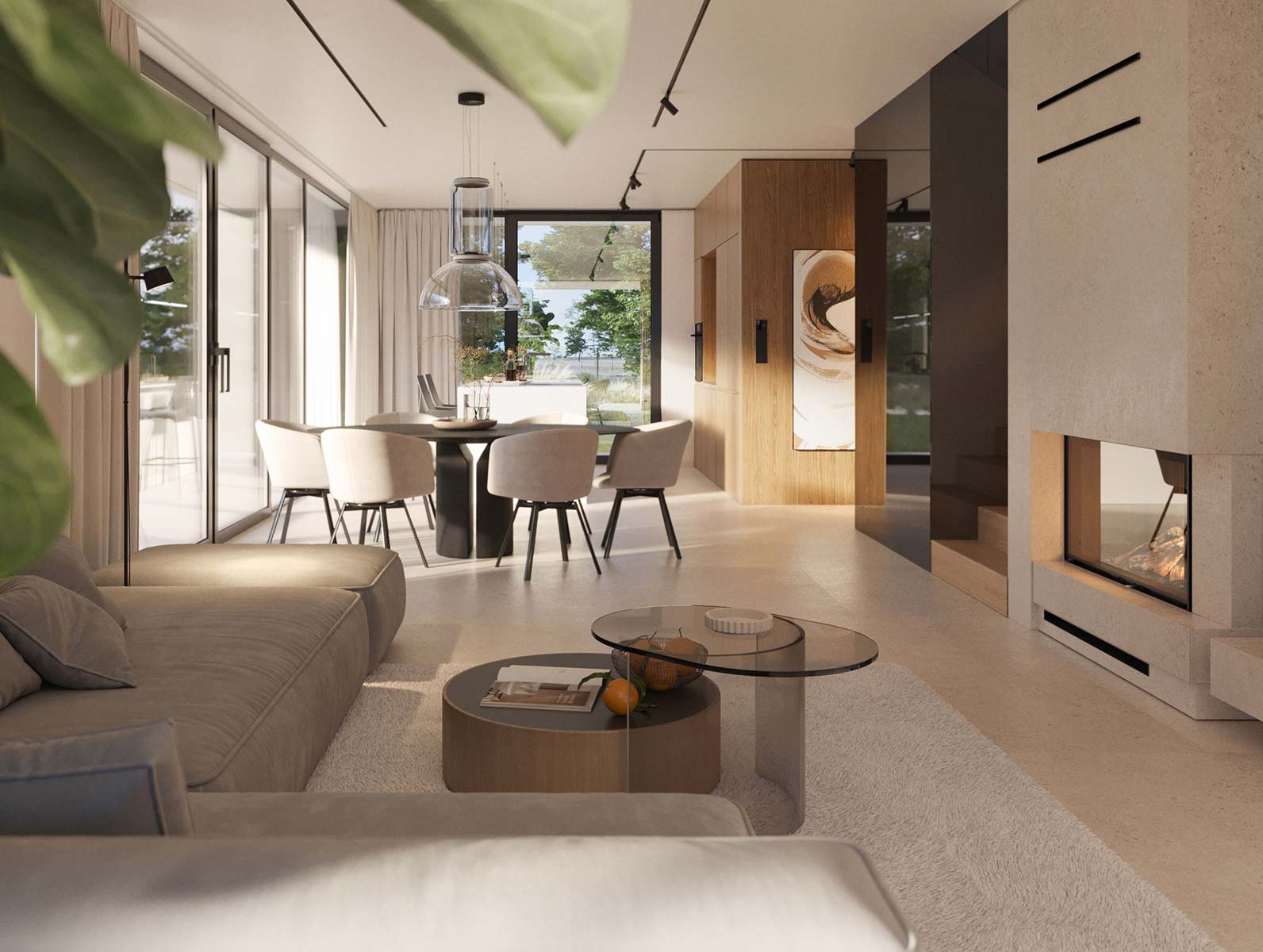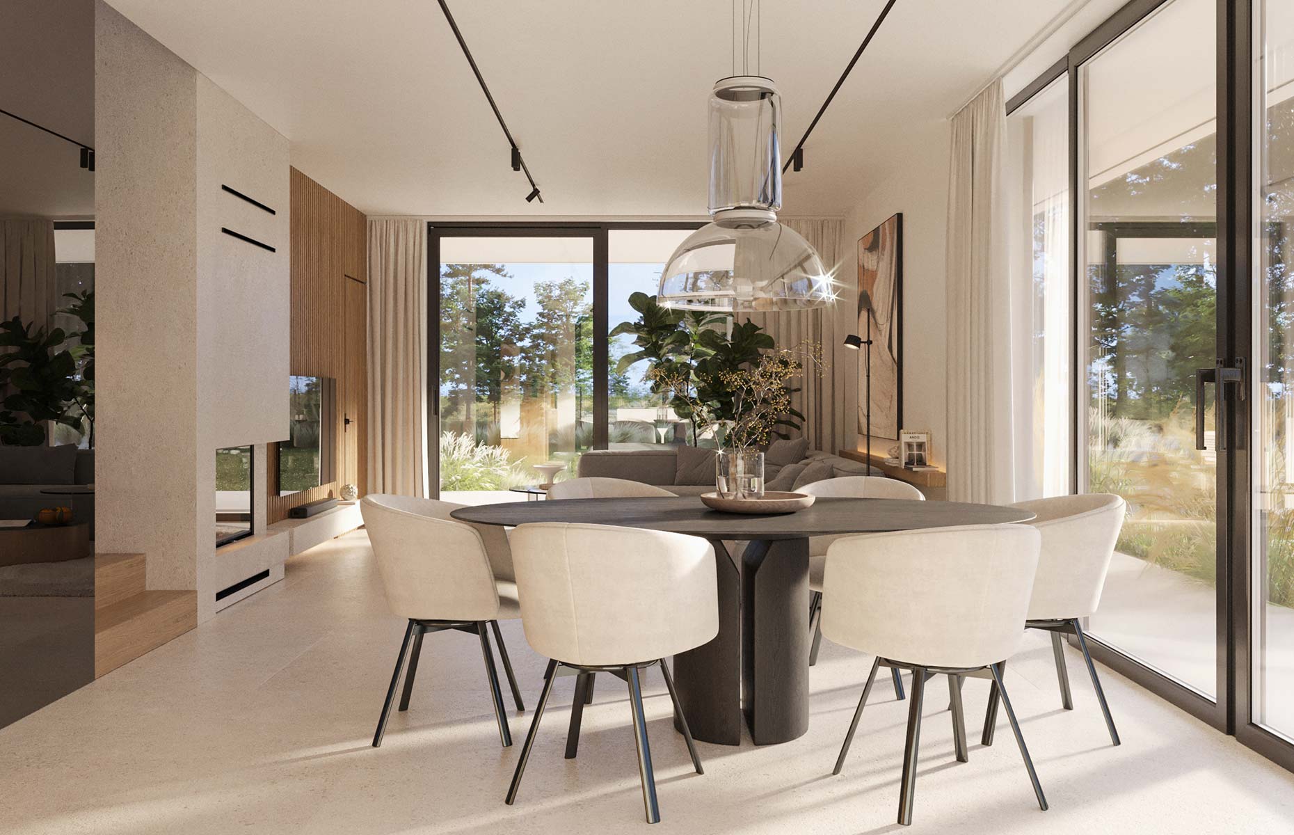 Jasna strefa dzienna z dużymi przeszkleniami - salon, jadalnia i kuchnia tworzą otwartą przestrzeń pełną naturalnego światła, a duże przeszklenia płynnie łączą wnętrze z ogrodem.