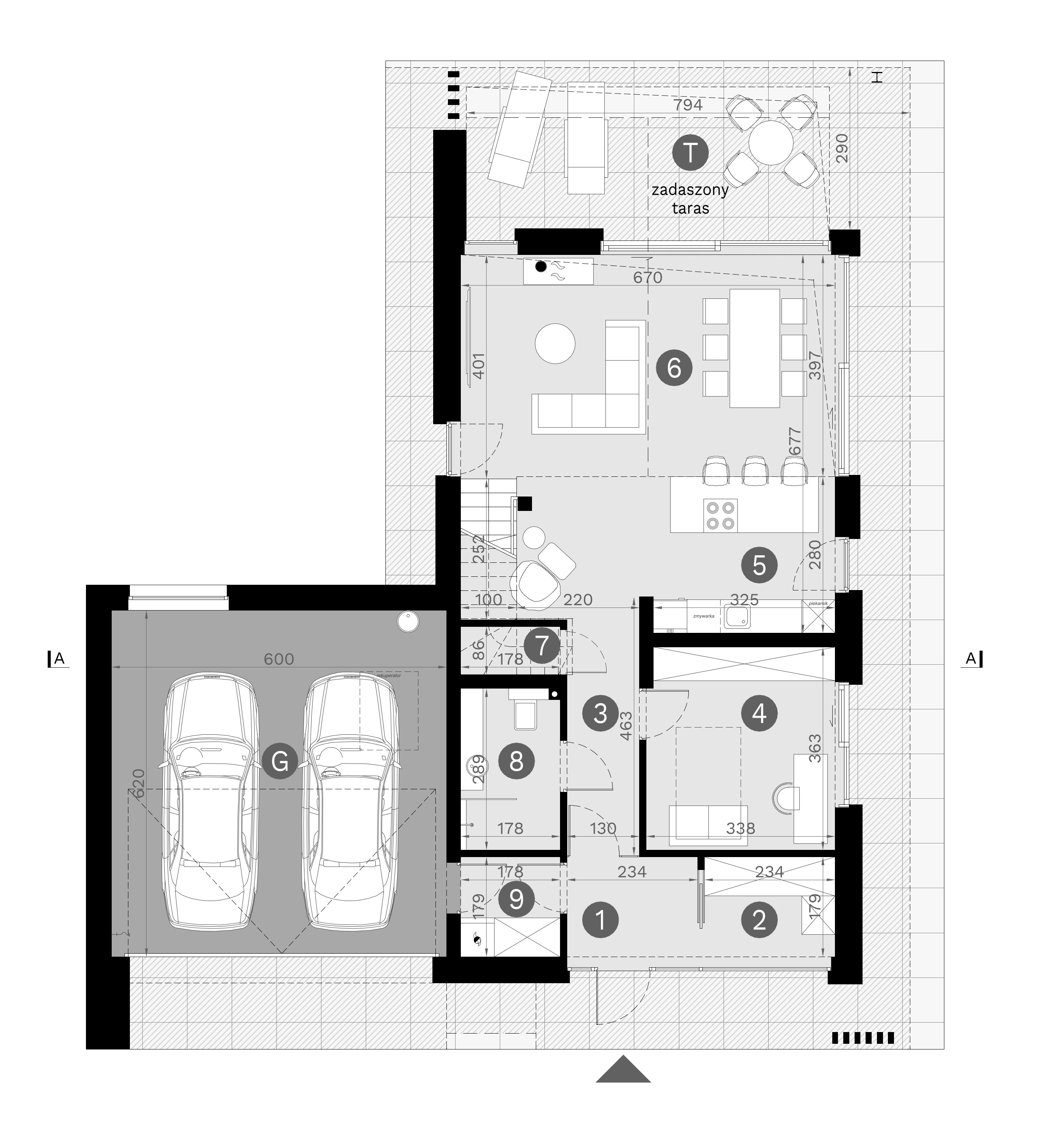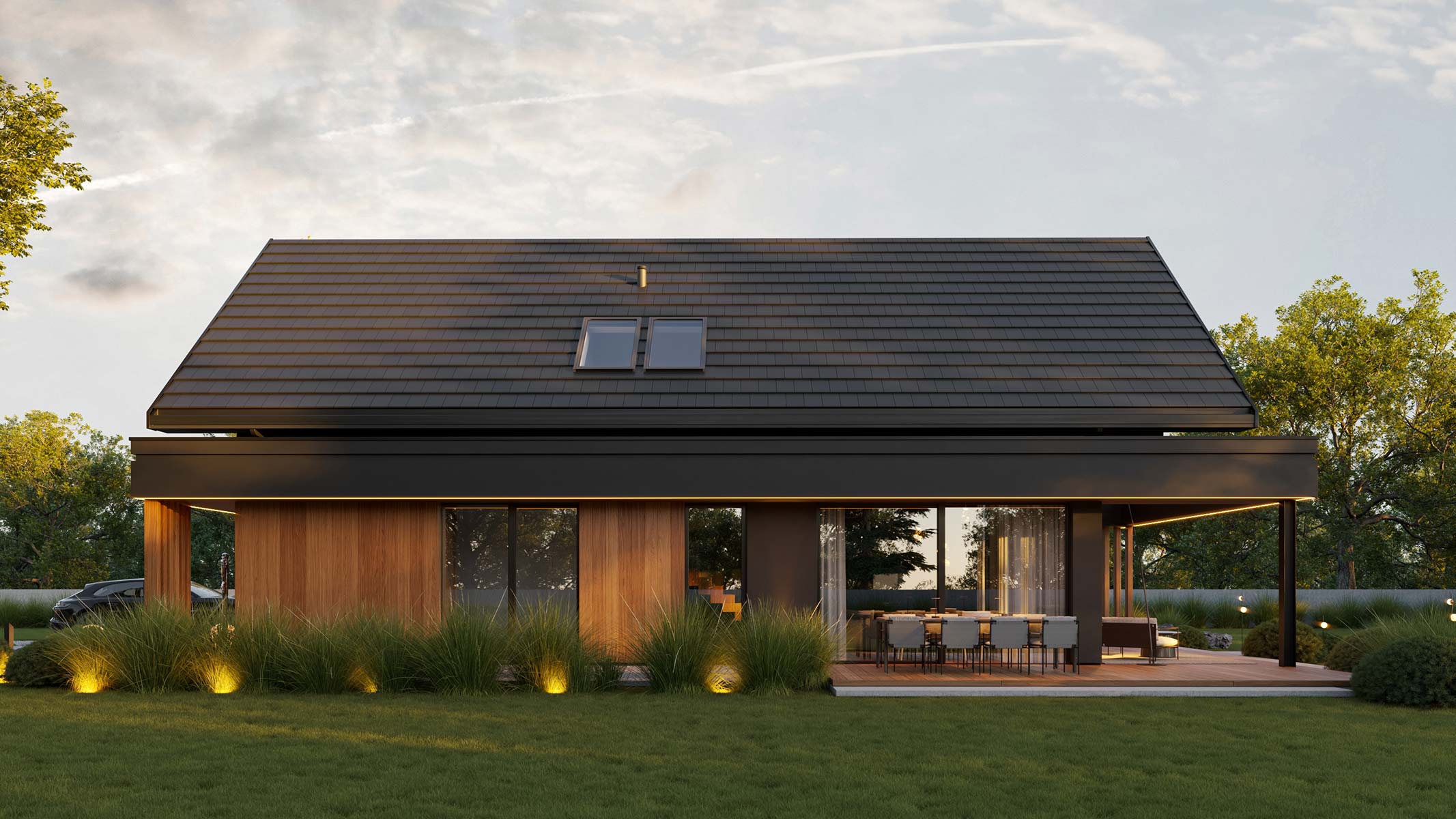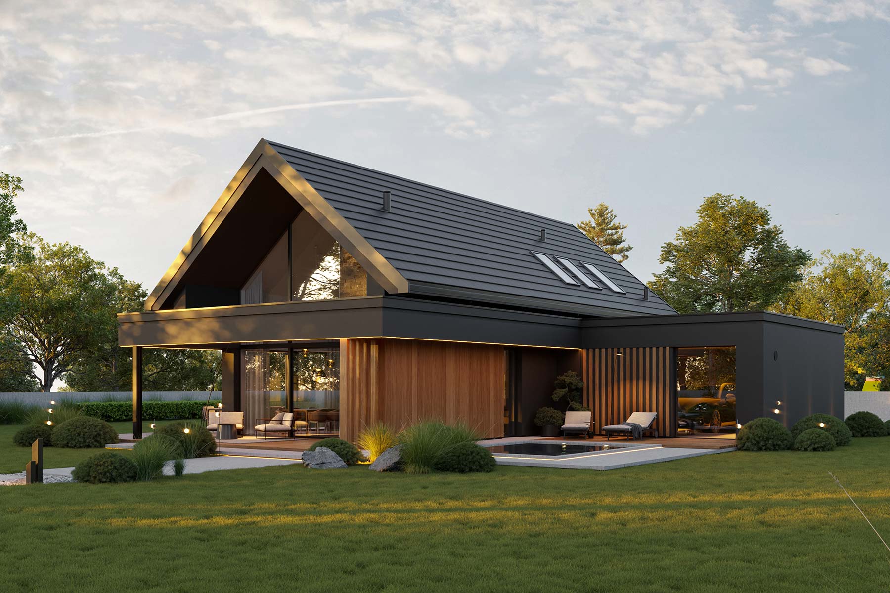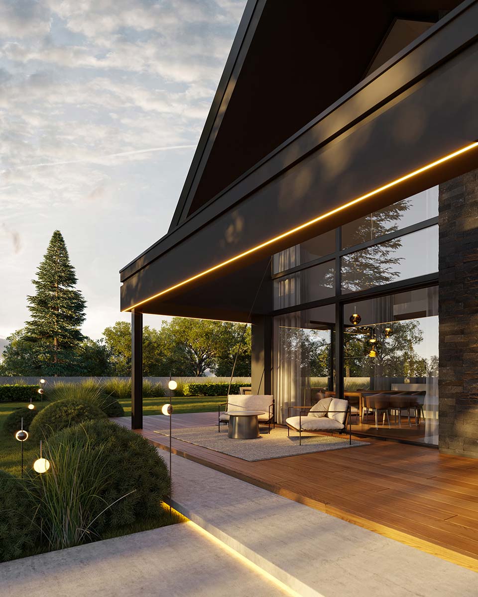 Dodatkowym atutem projektu jest kameralna strefa wypoczynkowa “ukryta” za garażem, idealna na jacuzzi lub basen, a także przemyślane zadaszenia prowadzące wokół domu, które podnoszą komfort i budują przytulną atmosferę.