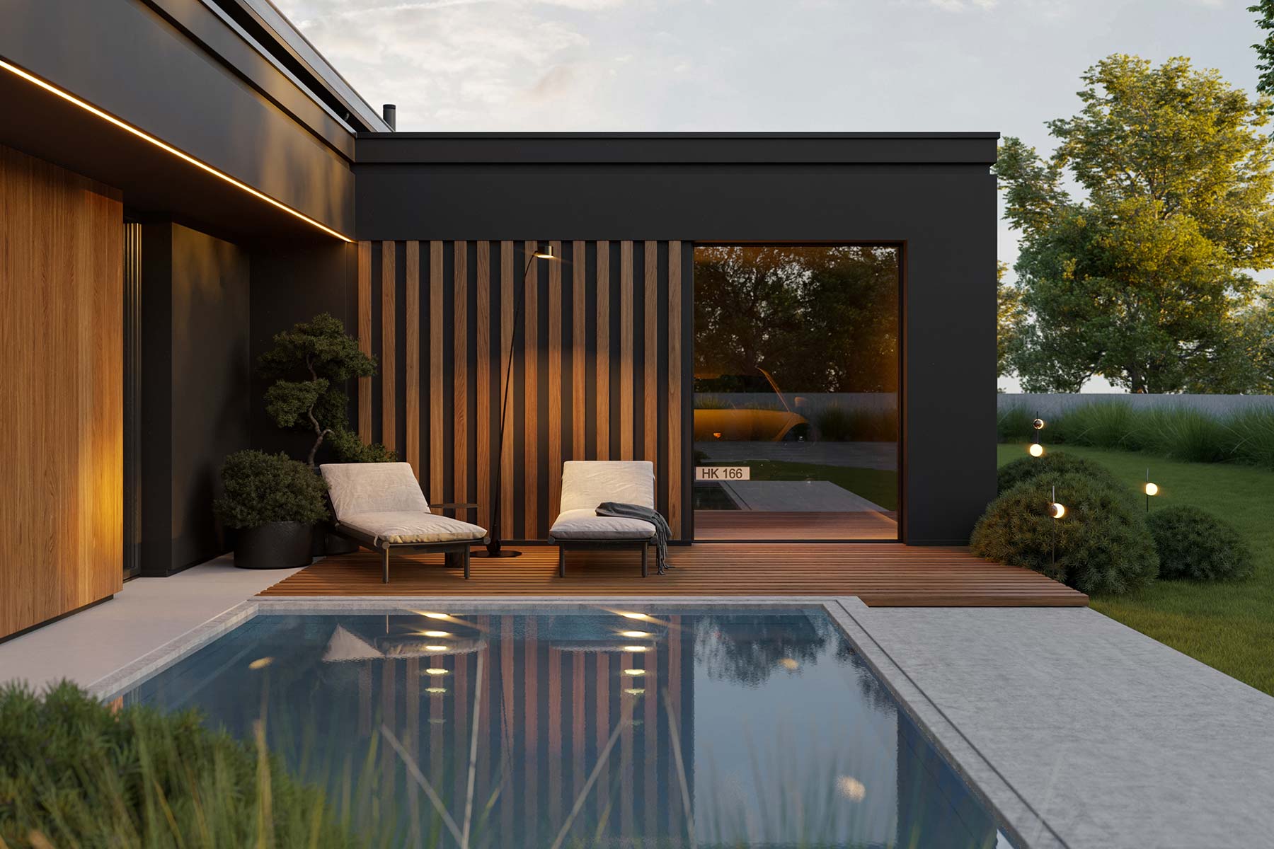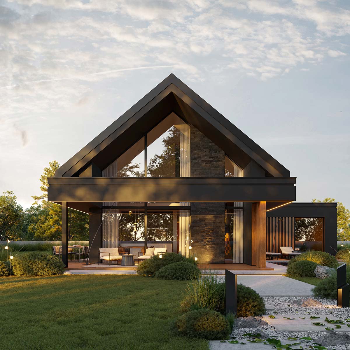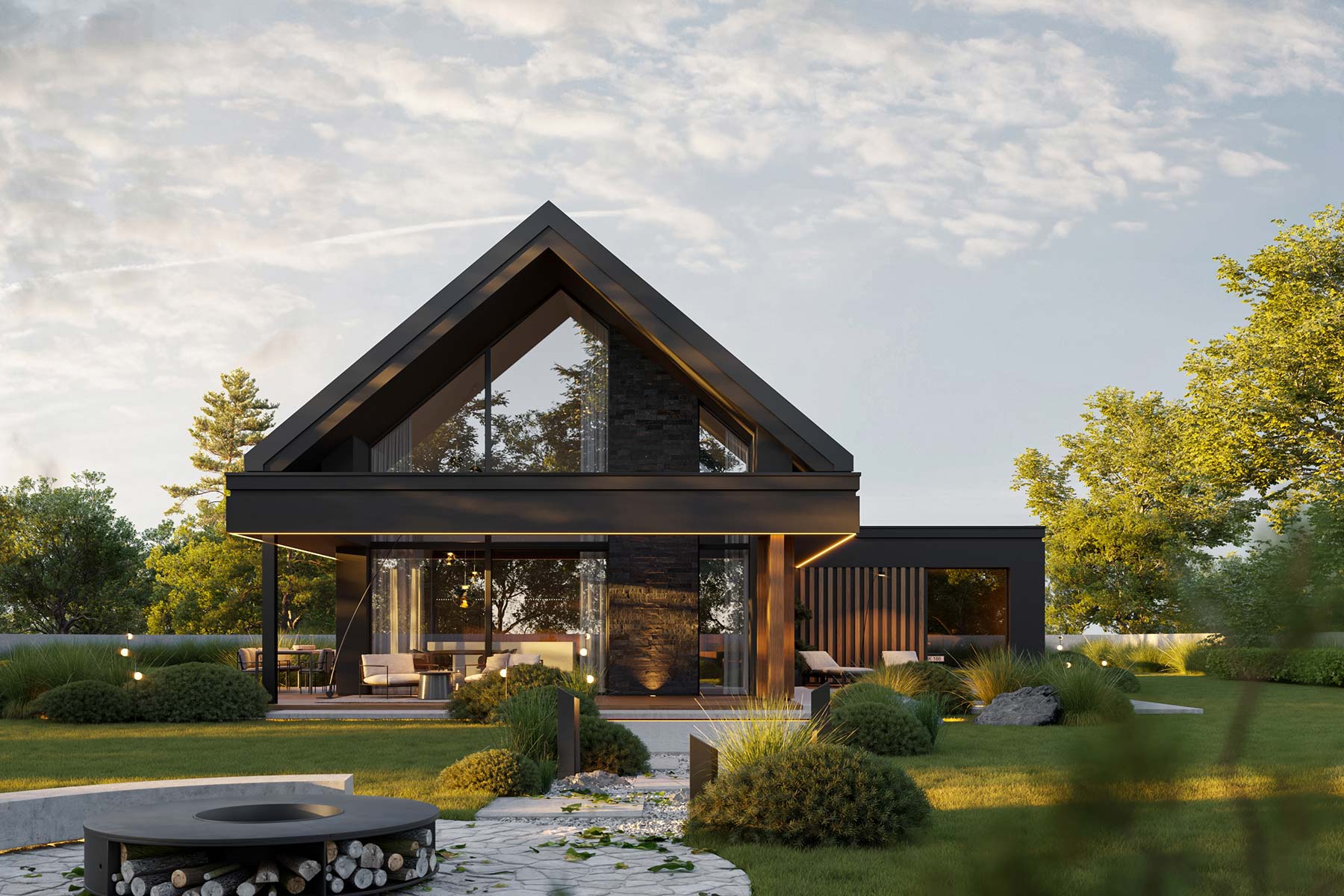 Dodatkowym atutem projektu jest kameralna strefa wypoczynkowa “ukryta” za garażem, idealna na jacuzzi lub basen, a także przemyślane zadaszenia prowadzące wokół domu, które podnoszą komfort i budują przytulną atmosferę.