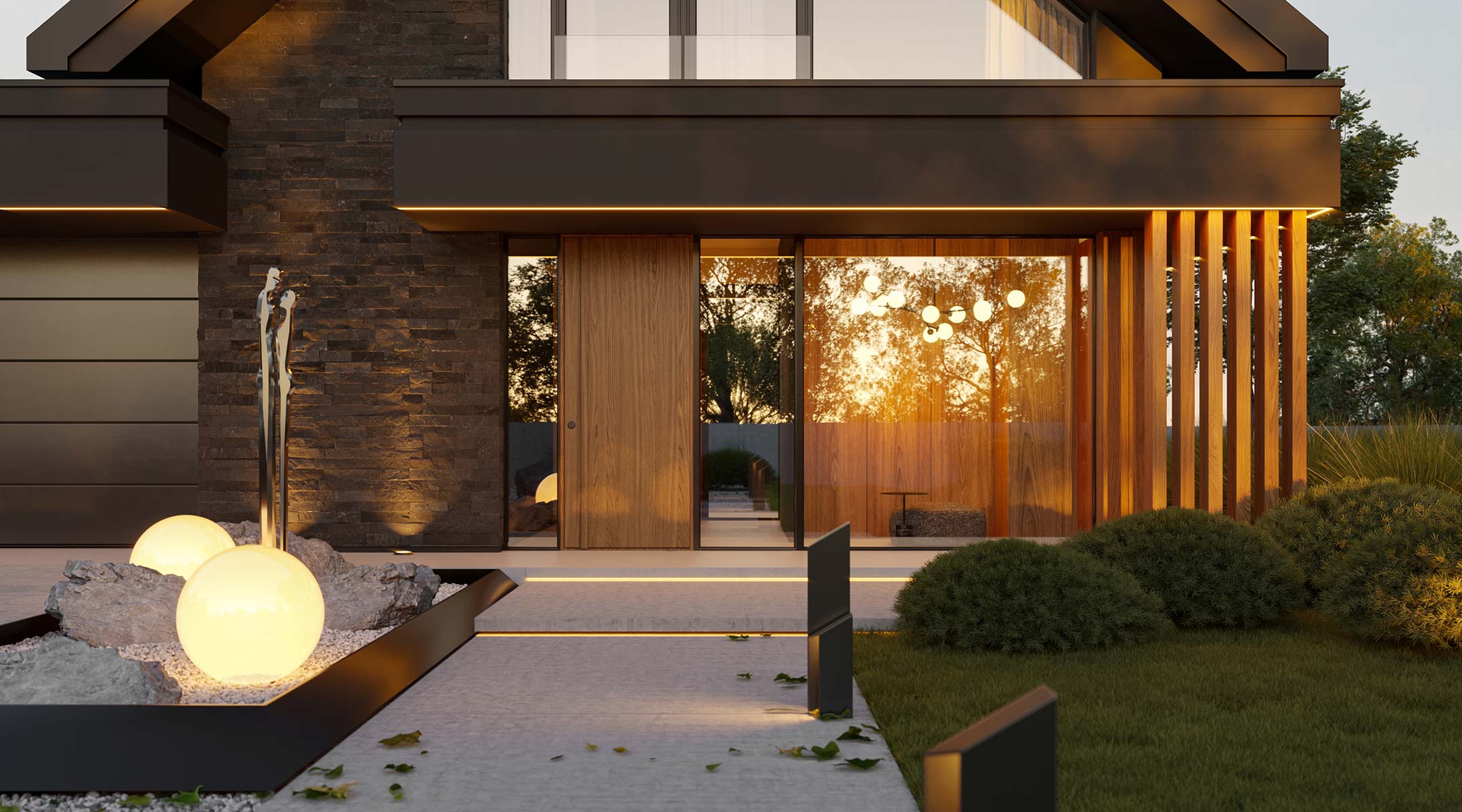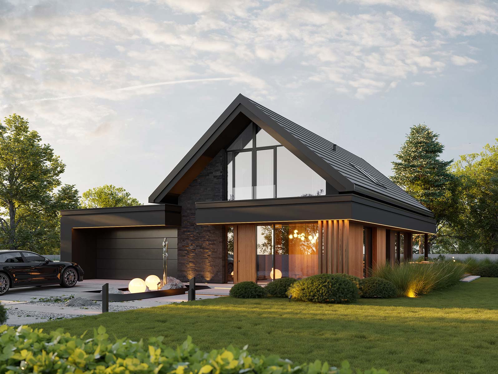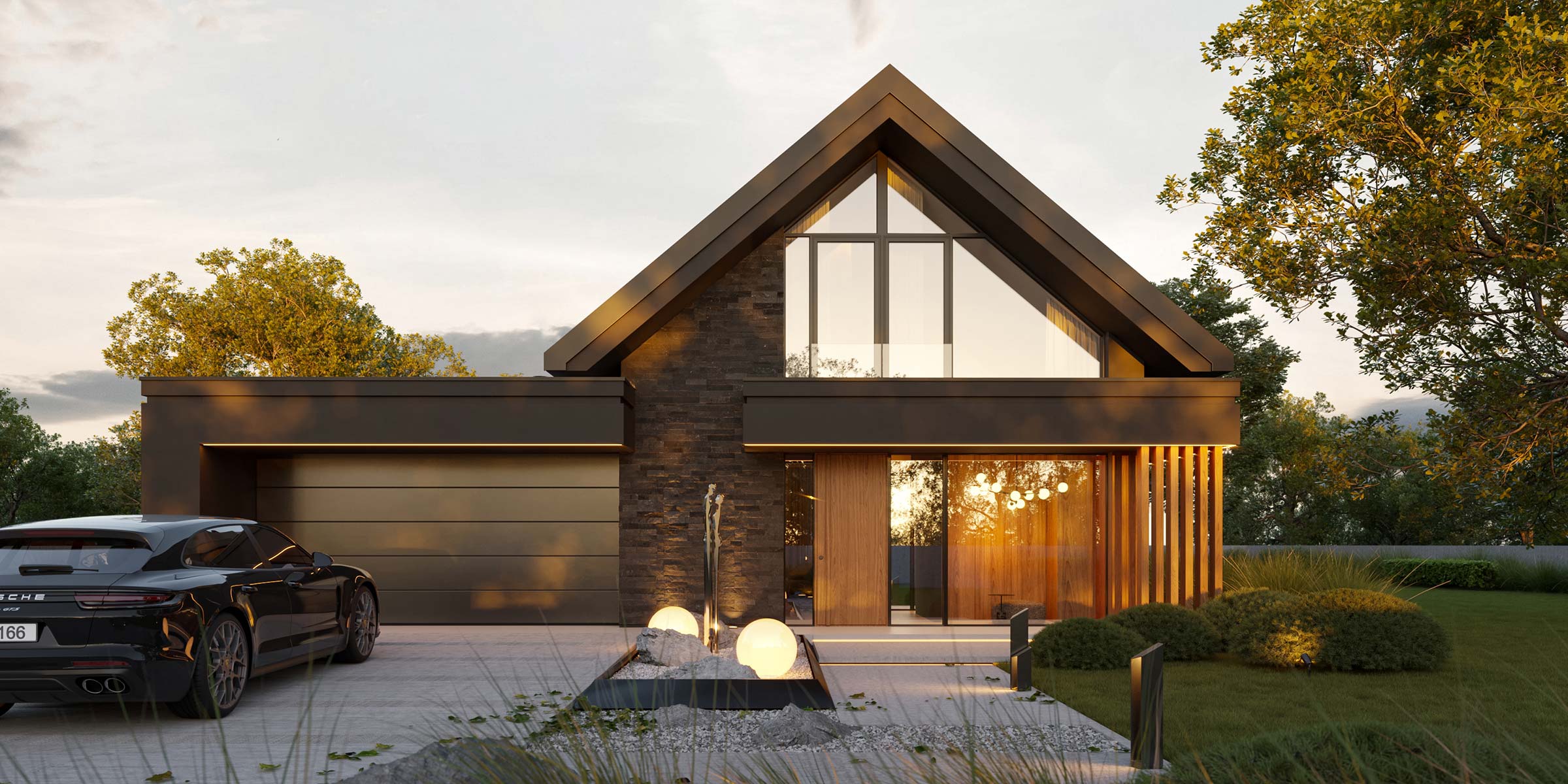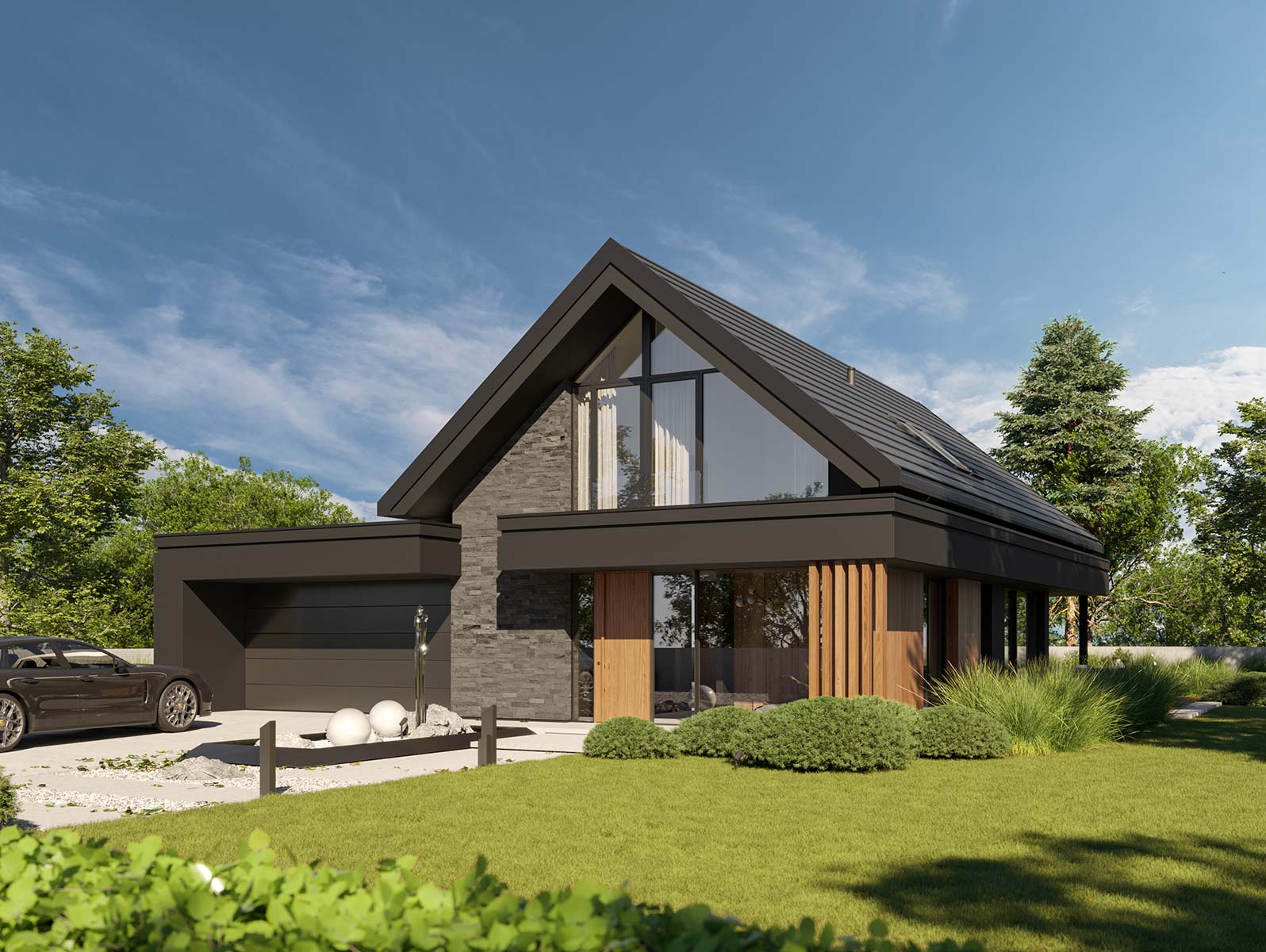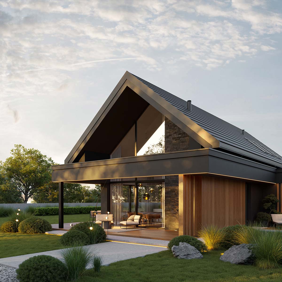 - elewacja: tynk silikonowy w połączeniu z deską elewacyjną lamelową oraz kamieniem elewacyjnym