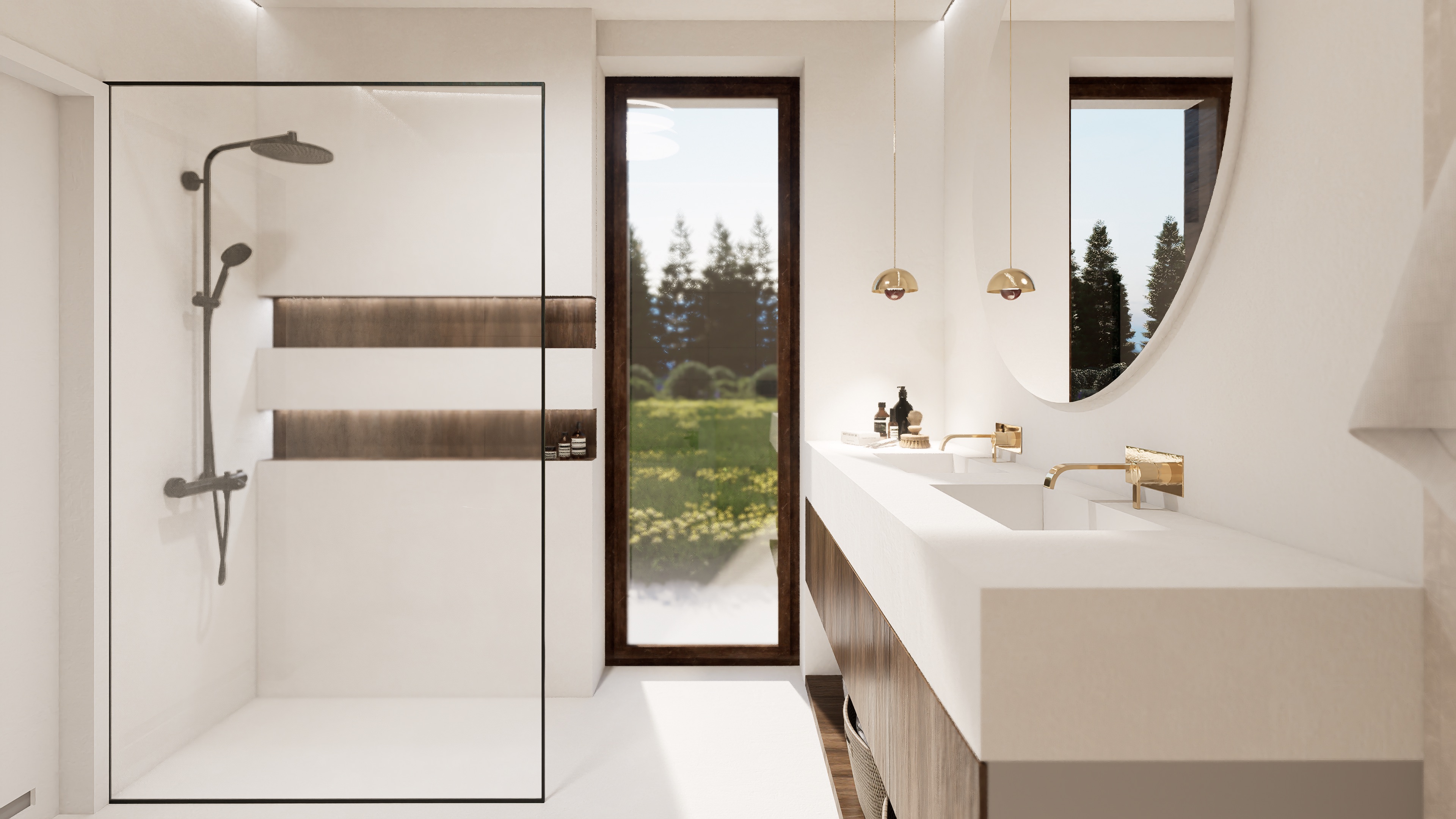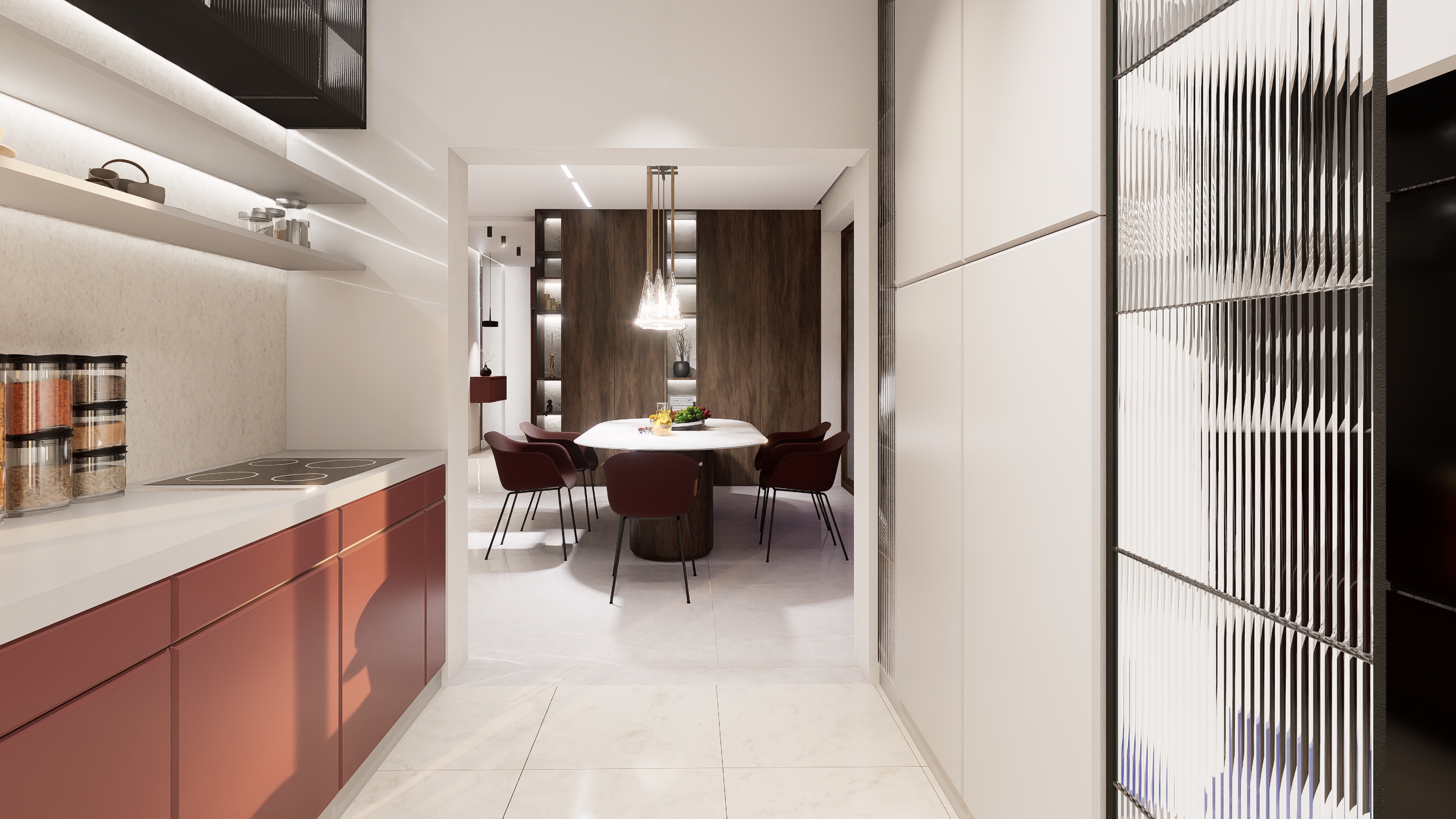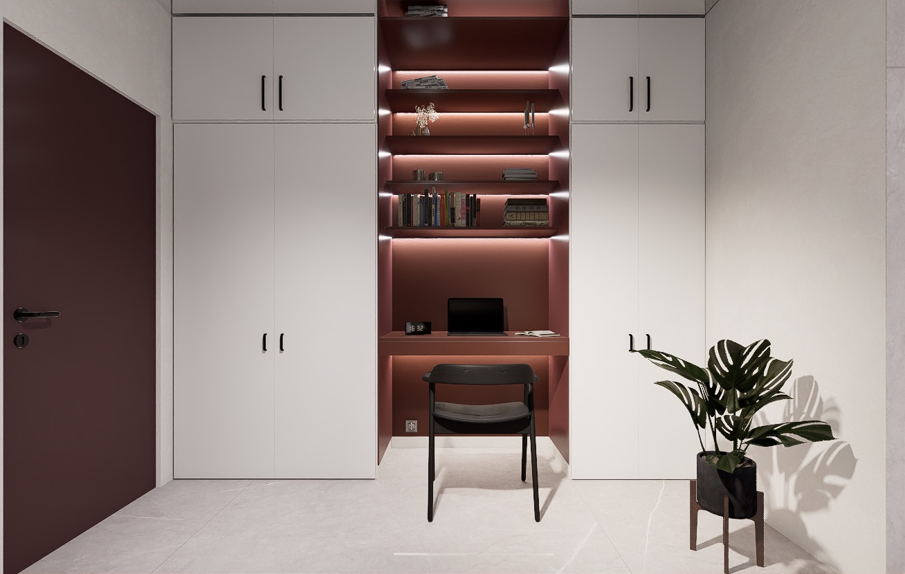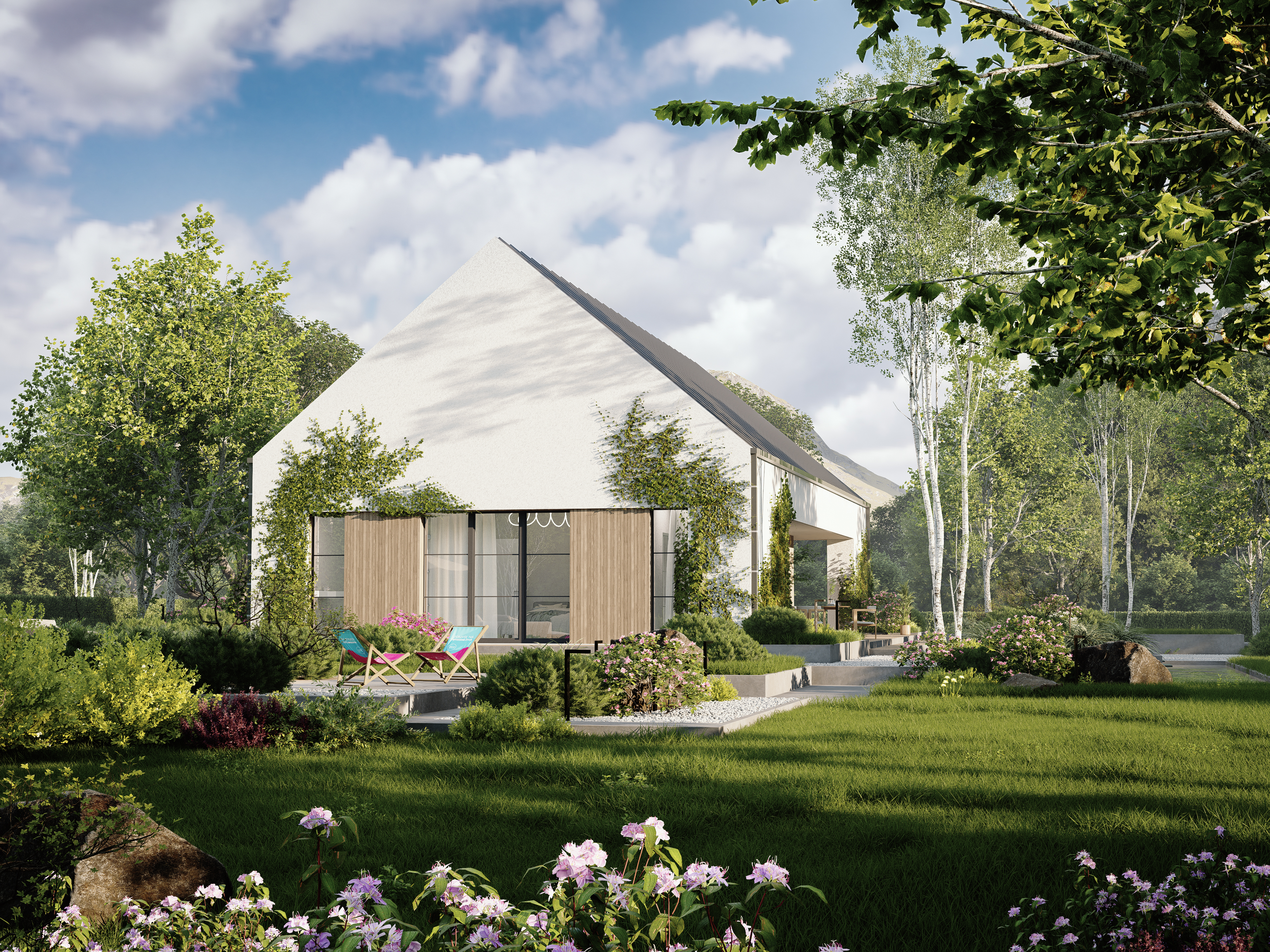 Dom wyróżnia się wąską fasadą i przemyślanym układem wnętrza. Nietypowa, przejściowa strefa dzienna obejmuje przestronny, pełen światła salon, jadalnię oraz kuchnię z wyspą. Główna część kuchni jest lekko oddzielona, ale pozostaje otwarta na strefę dzienną, co sprzyja integracji przestrzeni. W drugiej części domu znajdują się dwie komfortowe sypialnie, w tym jedna typu master z własną łazienką i dużą garderobą, a także ogólnodostępna łazienka i praktyczne pomieszczenie gospodarcze.