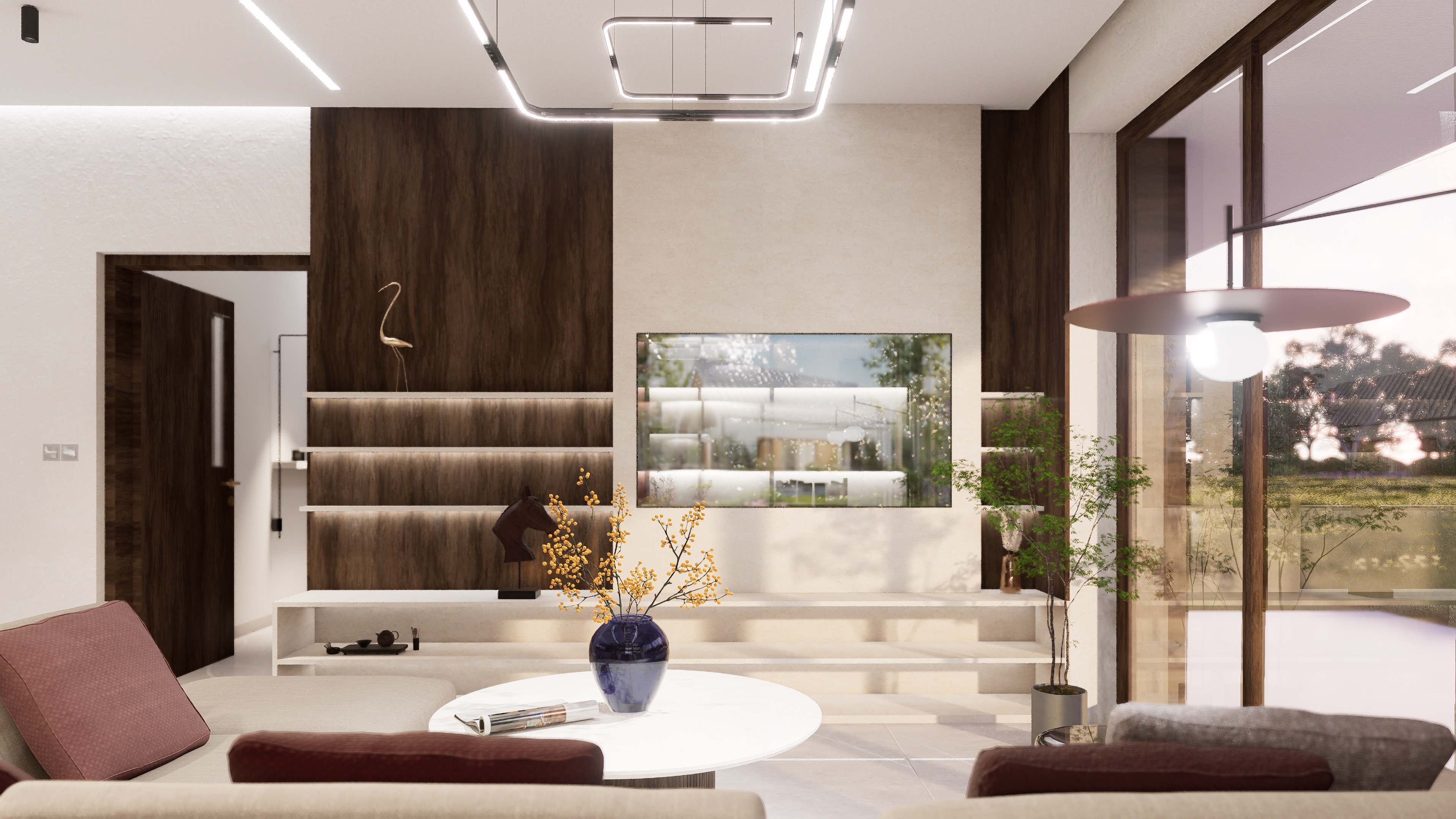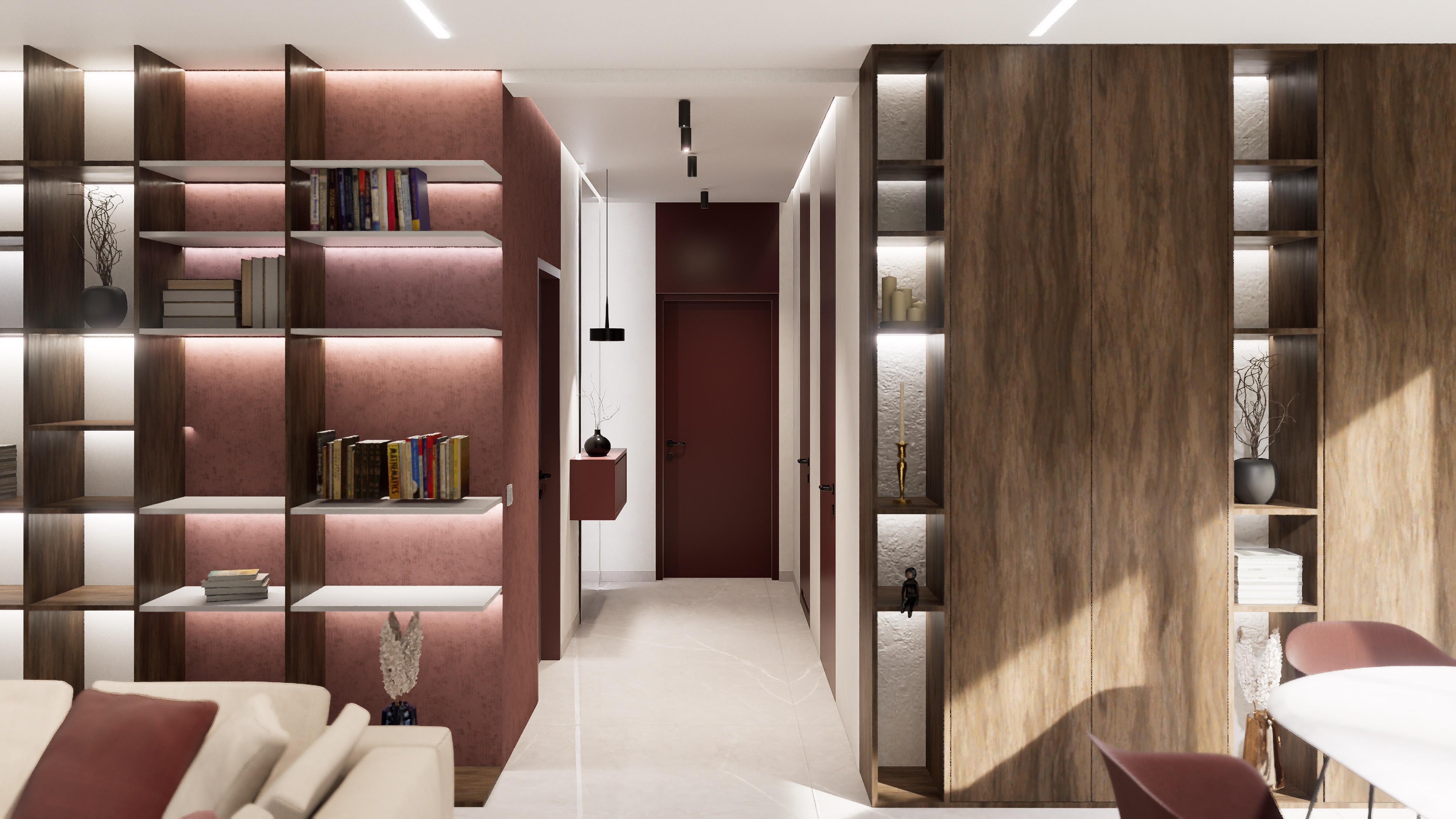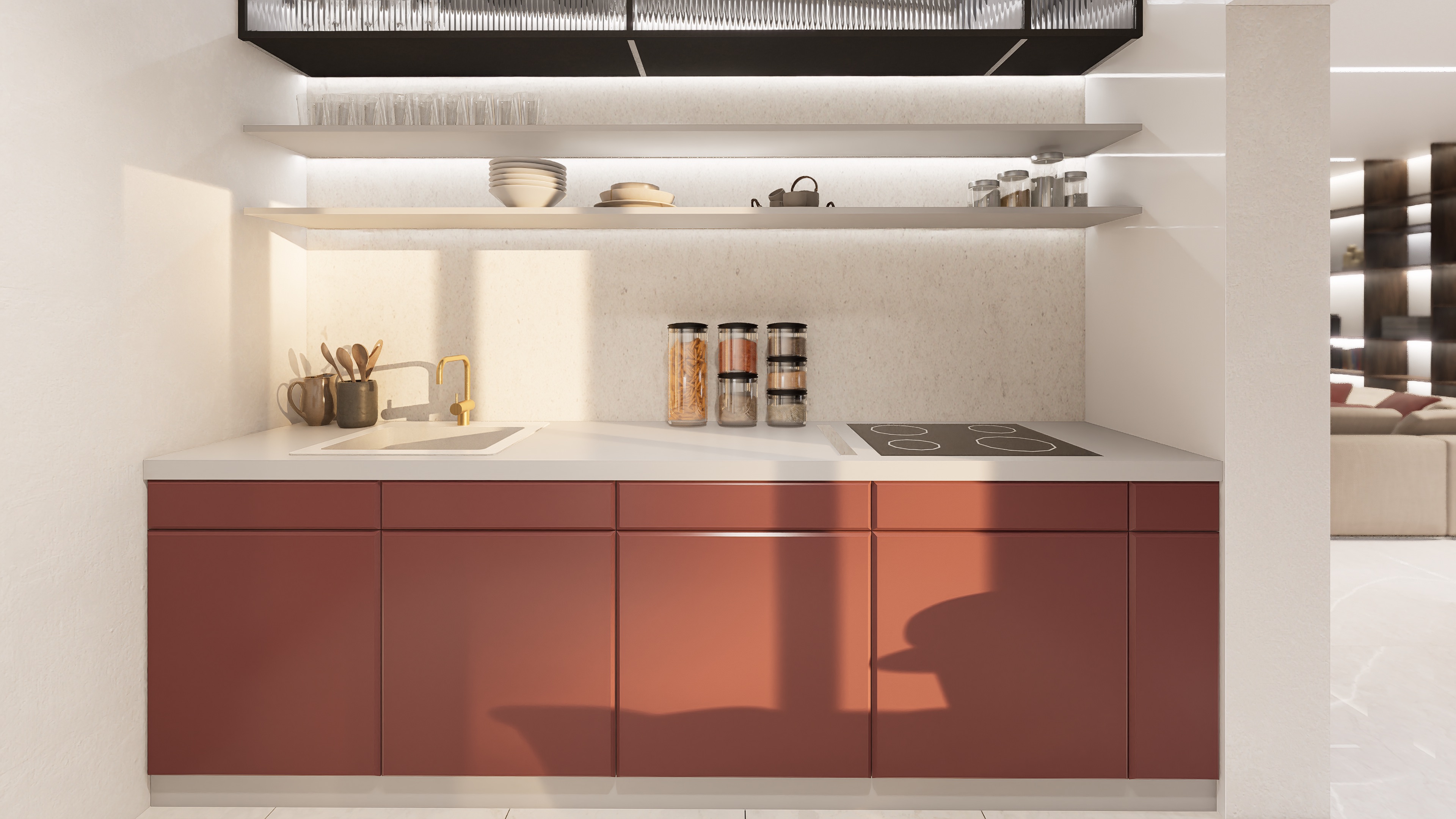 Dom wyróżnia się wąską fasadą i przemyślanym układem wnętrza. Nietypowa, przejściowa strefa dzienna obejmuje przestronny, pełen światła salon, jadalnię oraz kuchnię z wyspą. Główna część kuchni jest lekko oddzielona, ale pozostaje otwarta na strefę dzienną, co sprzyja integracji przestrzeni. W drugiej części domu znajdują się dwie komfortowe sypialnie, w tym jedna typu master z własną łazienką i dużą garderobą, a także ogólnodostępna łazienka i praktyczne pomieszczenie gospodarcze.