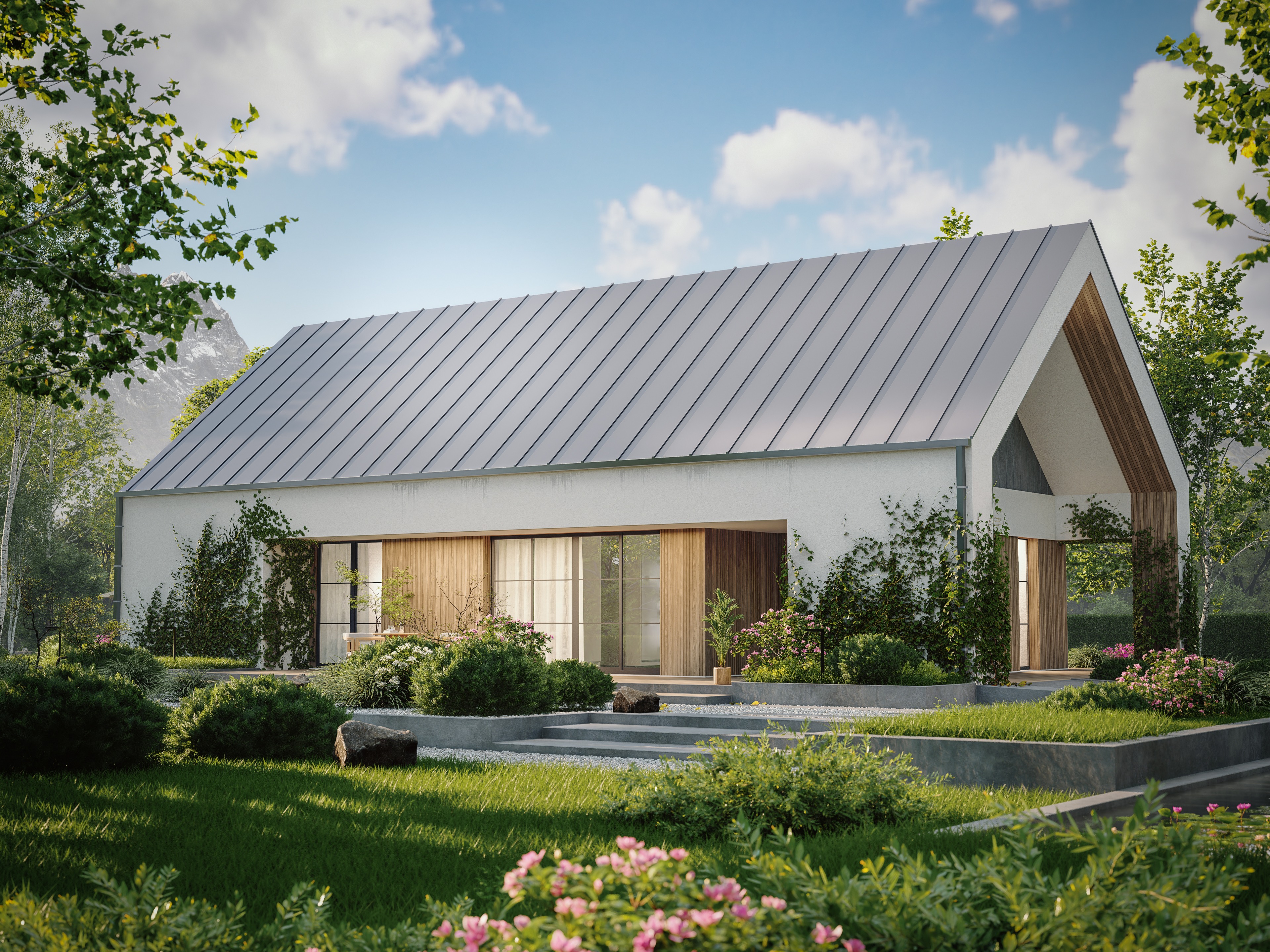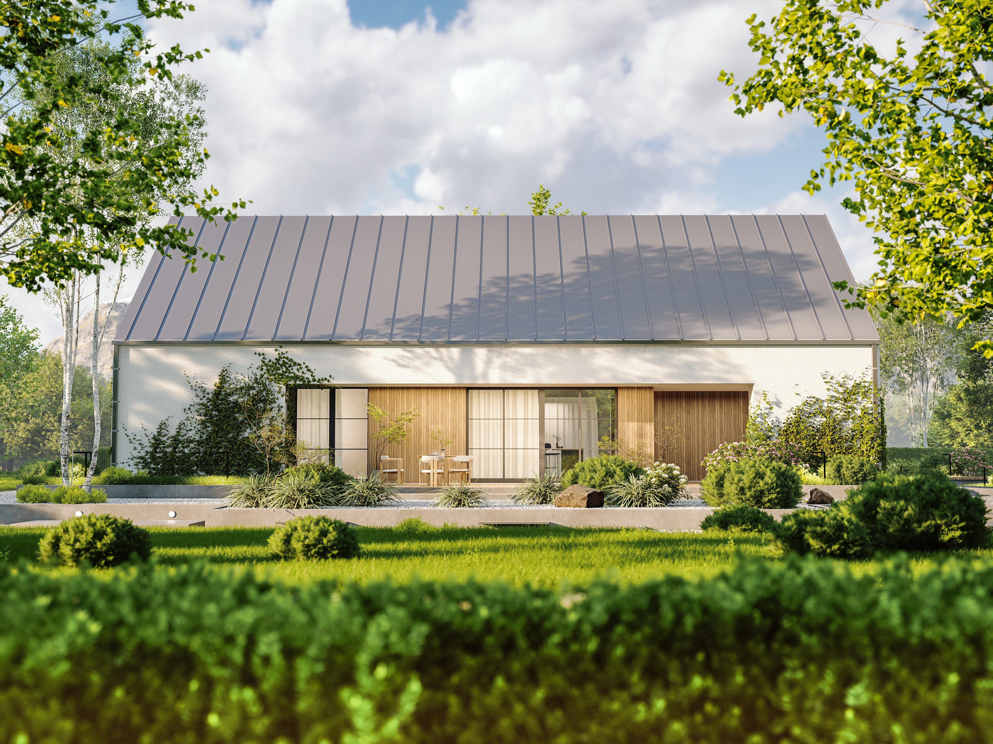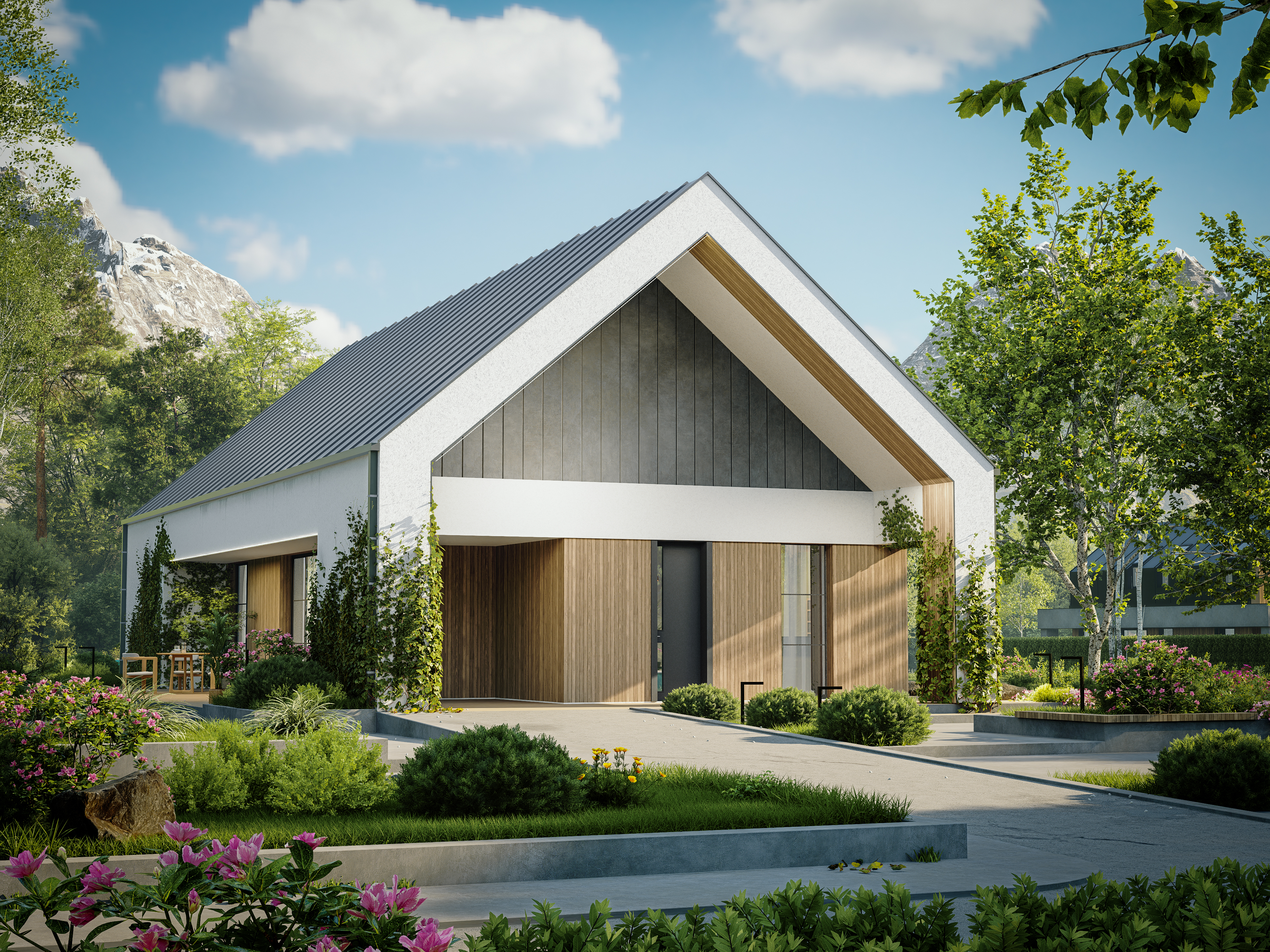 Charakterystycznym elementem projektu jest przedłużony dach od strony frontowej, który tworzy minimalistyczną wiatę — idealną również jako zadaszony taras przy wejściu do domu.