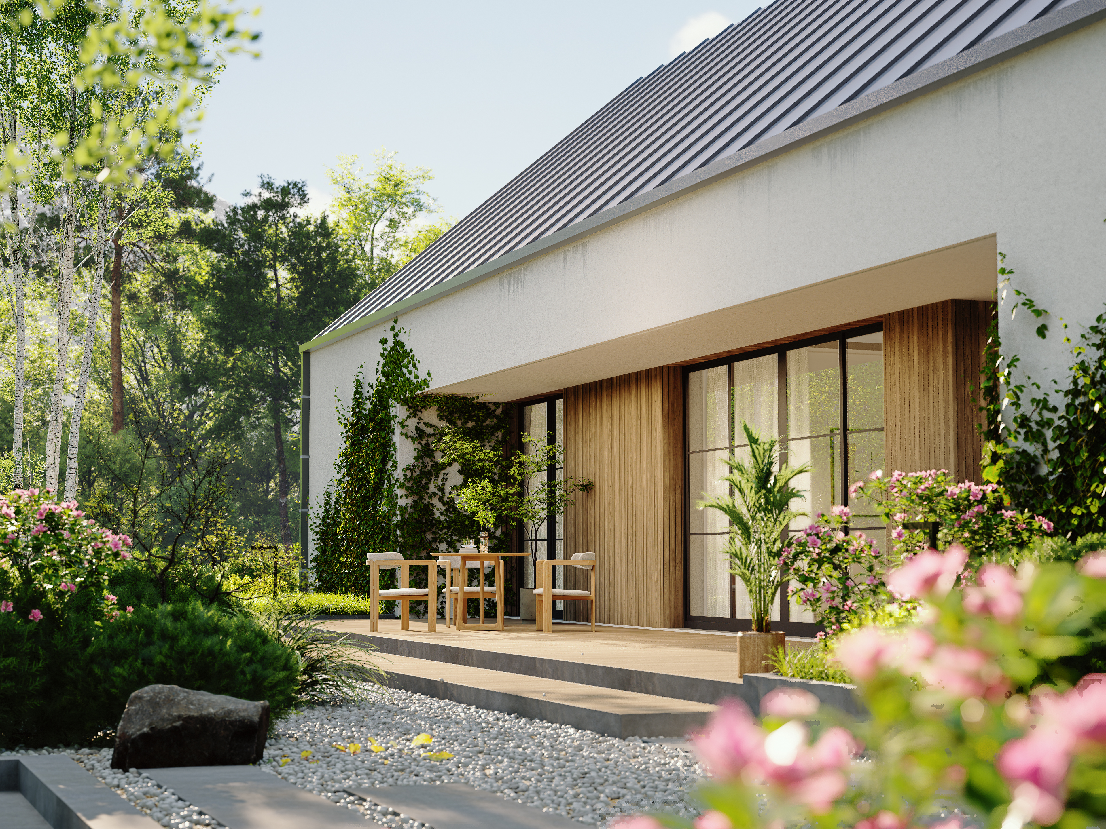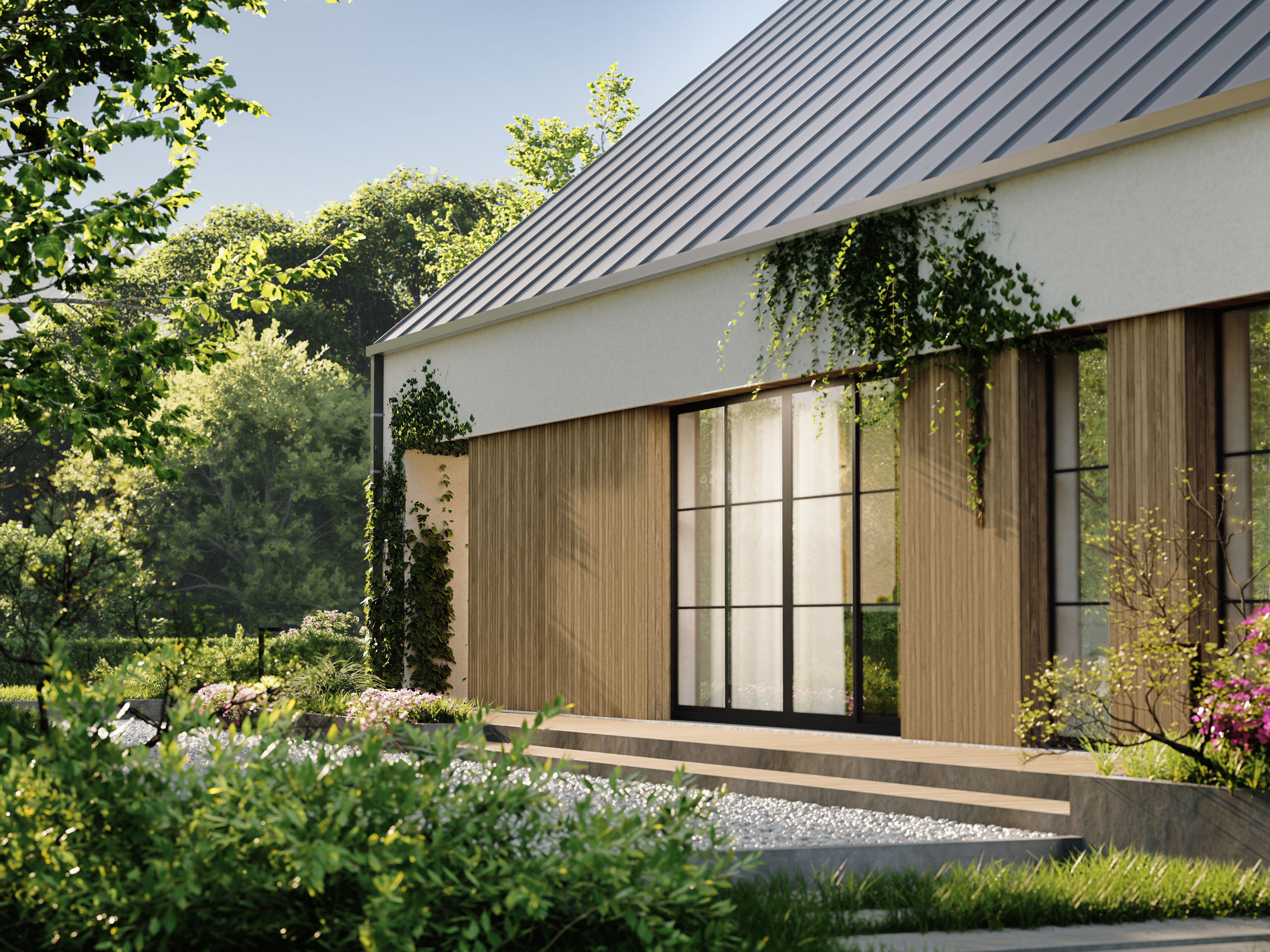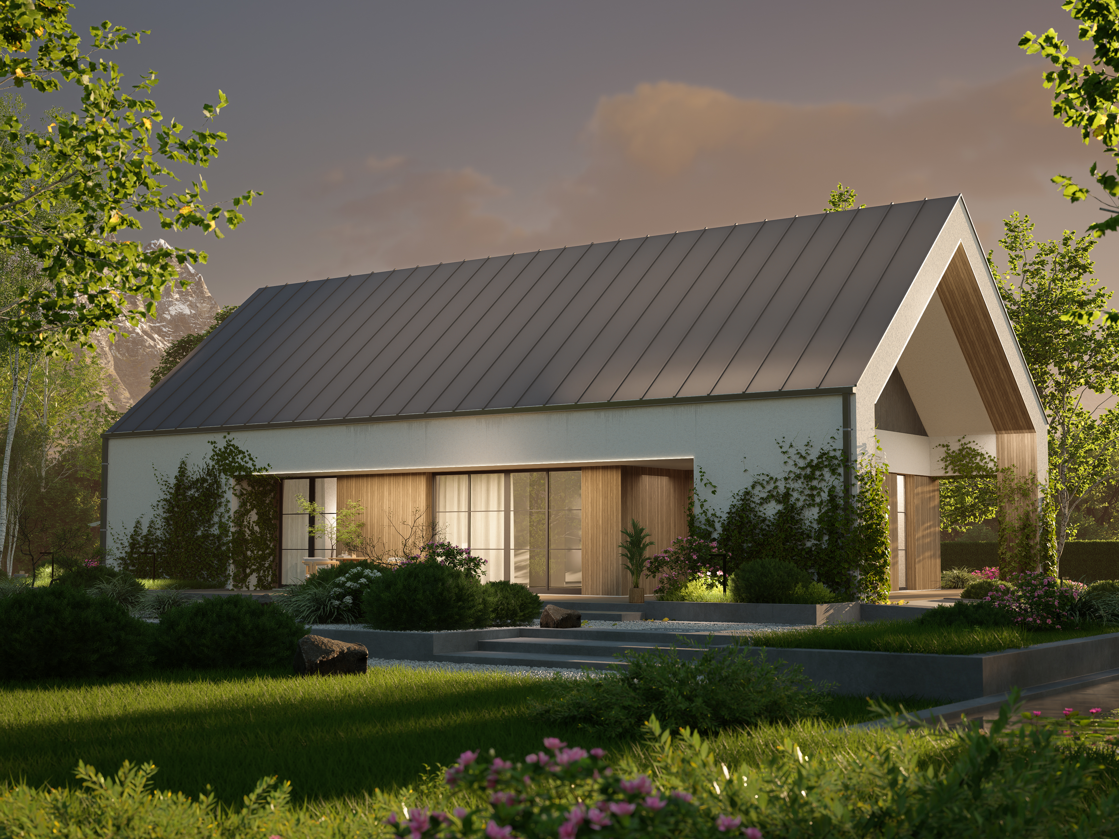 Charakterystycznym elementem projektu jest przedłużony dach od strony frontowej, który tworzy minimalistyczną wiatę — idealną również jako zadaszony taras przy wejściu do domu.
