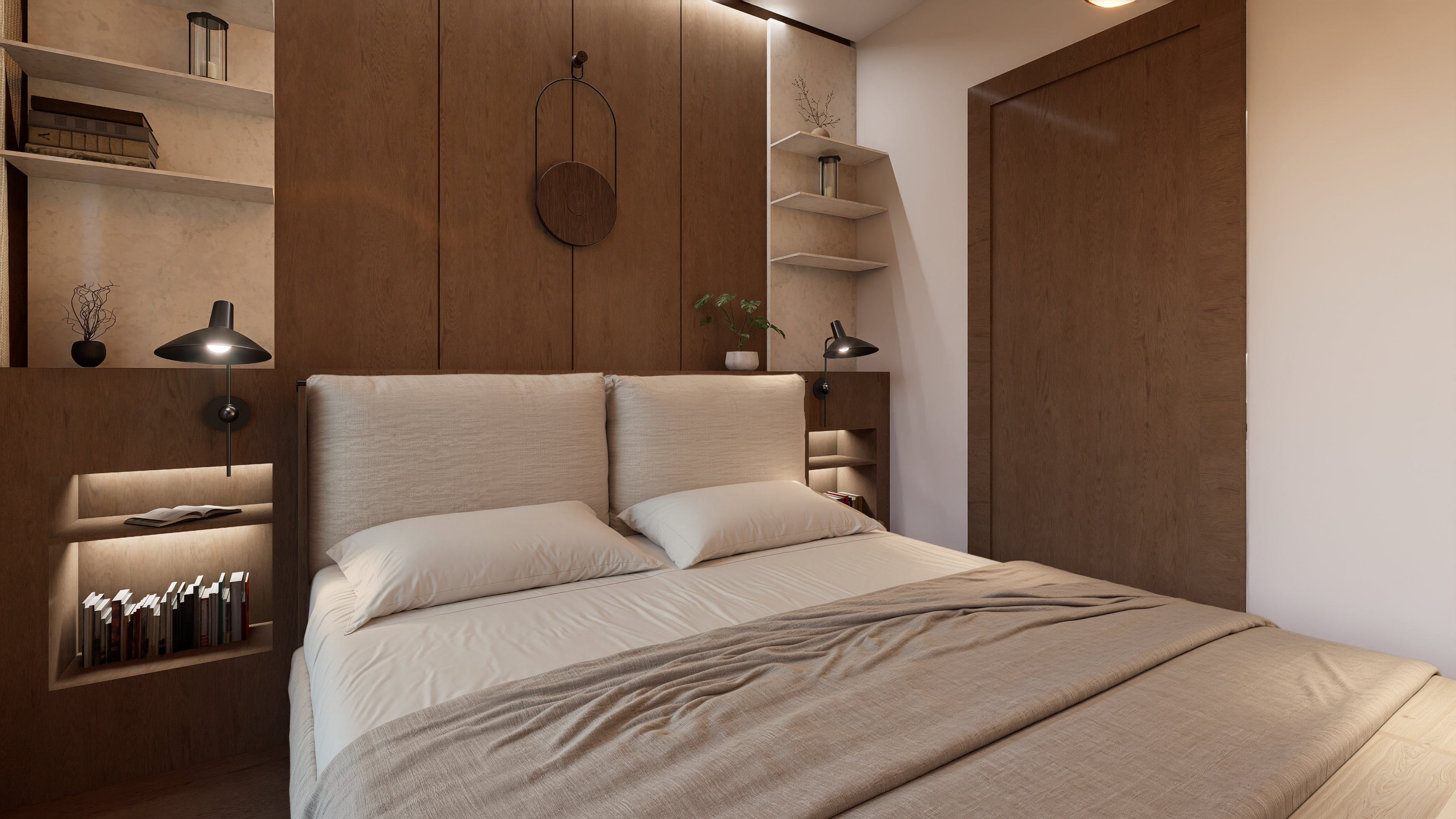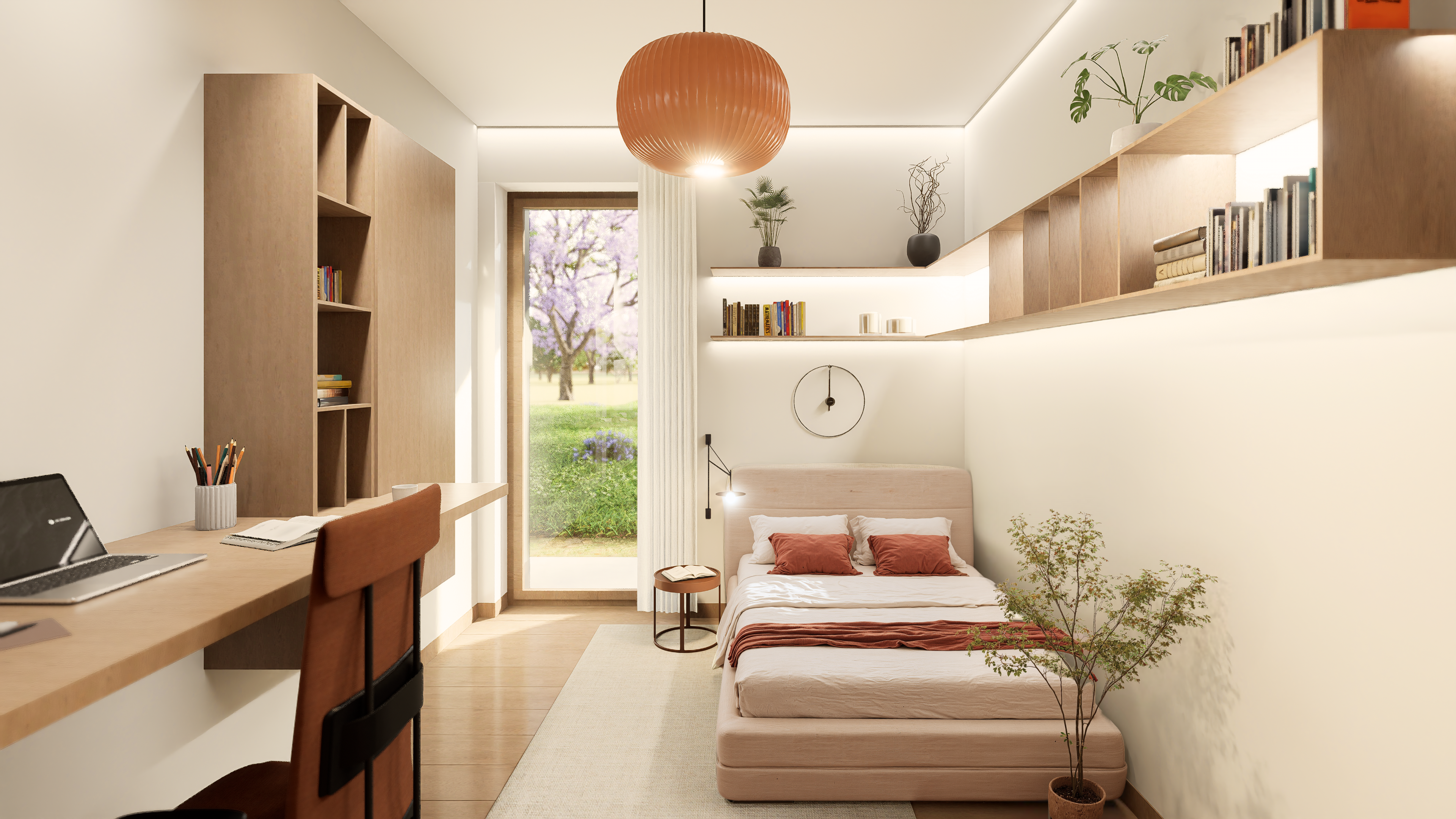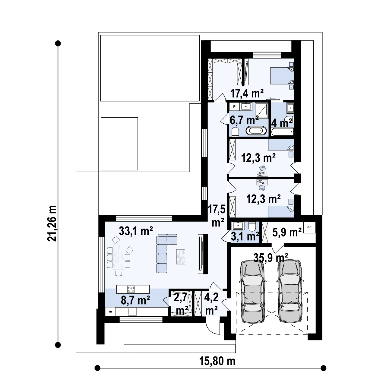W części prywatnej znalazły się trzy komfortowe sypialnie, w tym główna z prywatną garderobą i łazienką. Dodatkowo projekt uwzględnia drugą, ogólnodostępną łazienkę, osobne WC oraz praktyczne pomieszczenia gospodarcze – w tym spiżarnię i kotłownię.