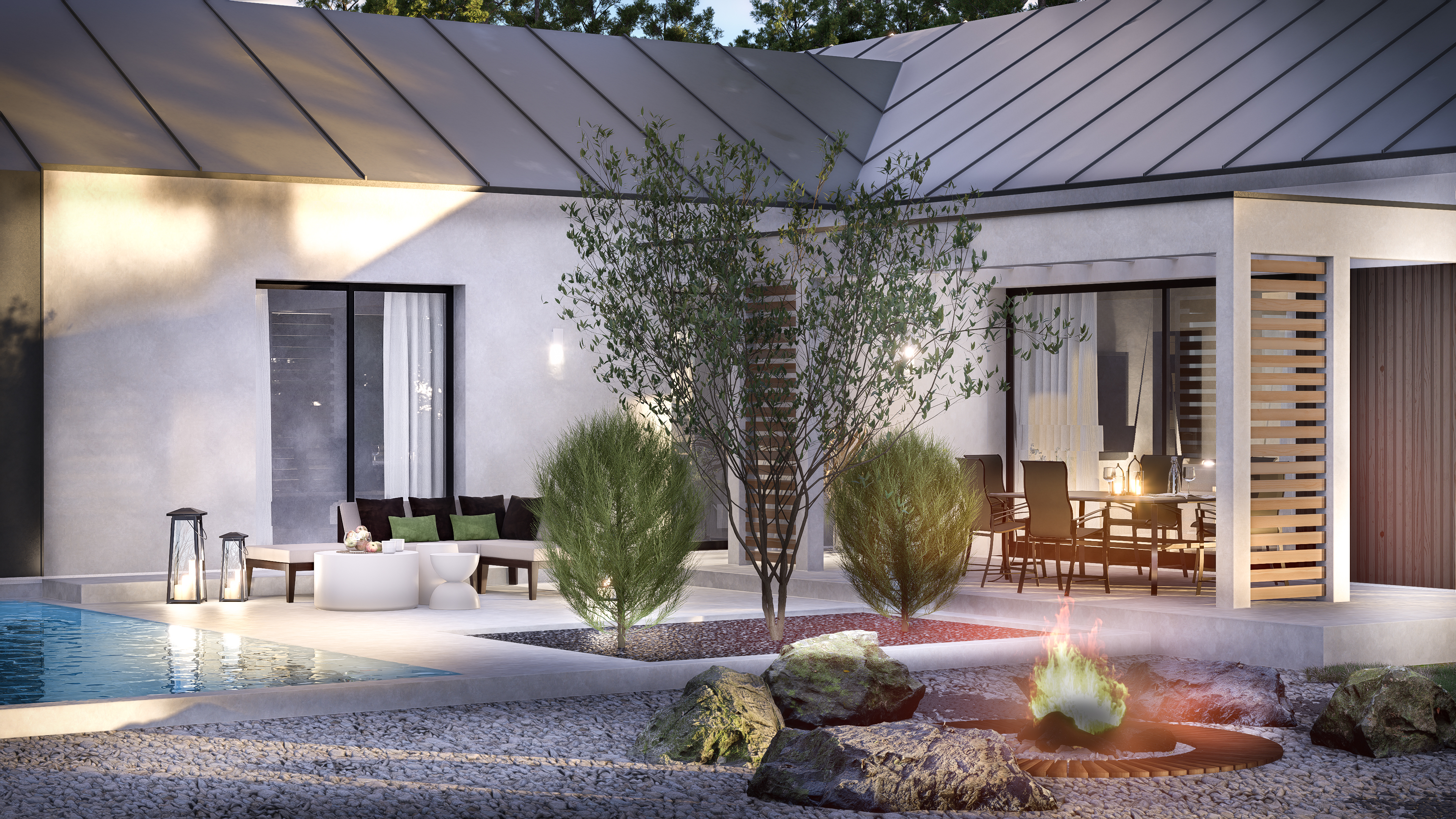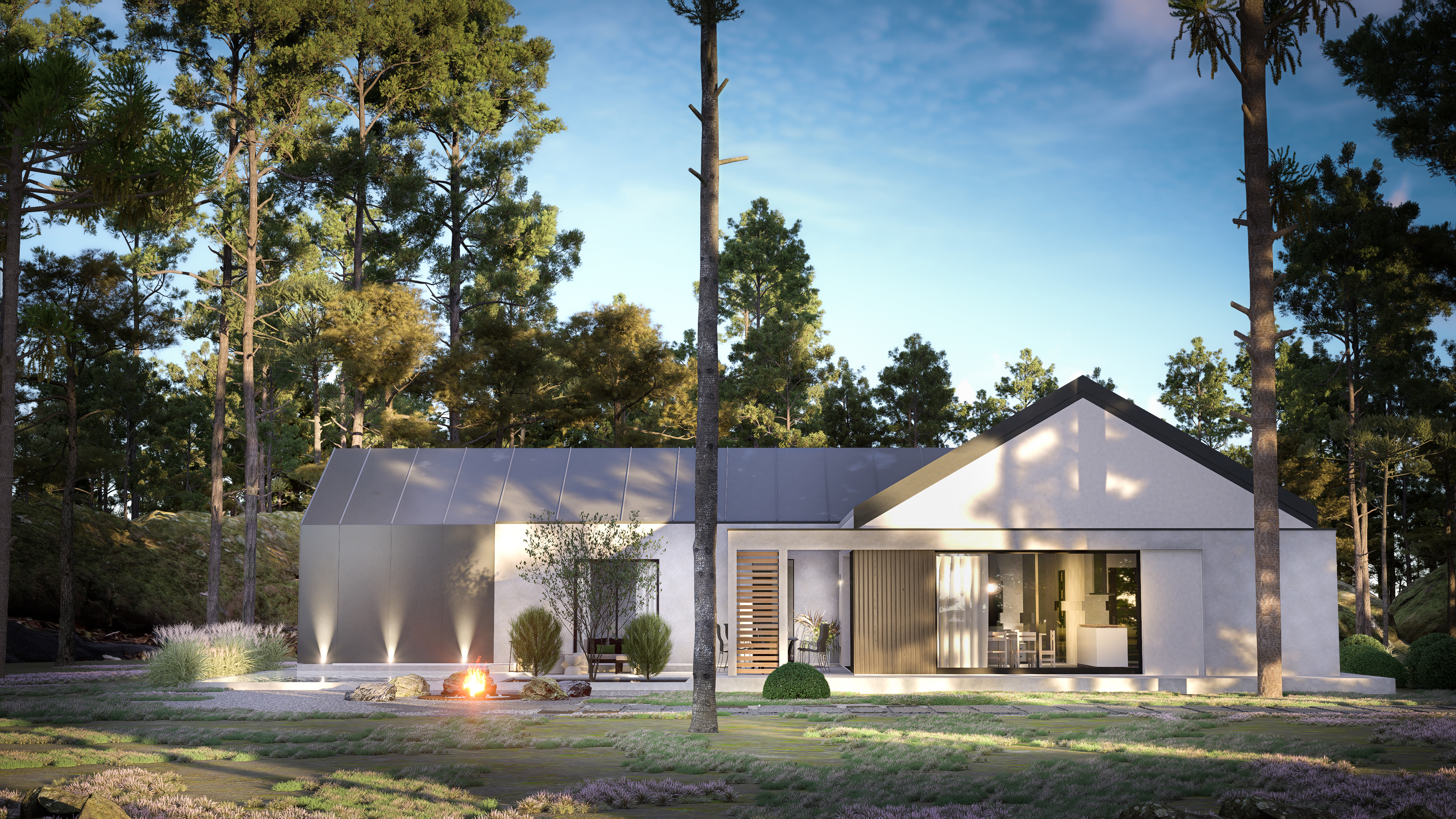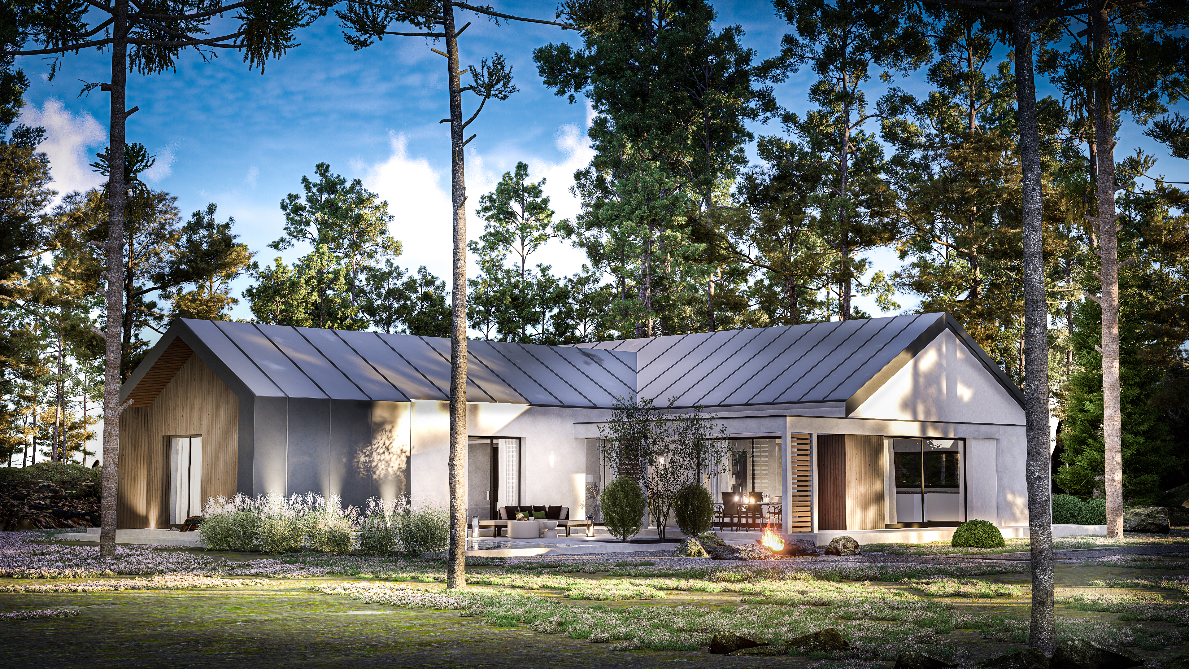 Dom Z566 oferuje 121,8 m² powierzchni użytkowej, na której zaplanowano nowoczesną strefę dzienną z otwartym salonem, jadalnią i kuchnią z wyspą. Duże przeszklenia otwierają wnętrze na ogród, zapewniając dostęp do naturalnego światła i płynne połączenie przestrzeni wewnętrznej z zewnętrzną. Wyjście na taras umożliwia swobodne korzystanie z uroków natury, a układ domu w literę L pozwala zorganizować przytulne, osłonięte patio.