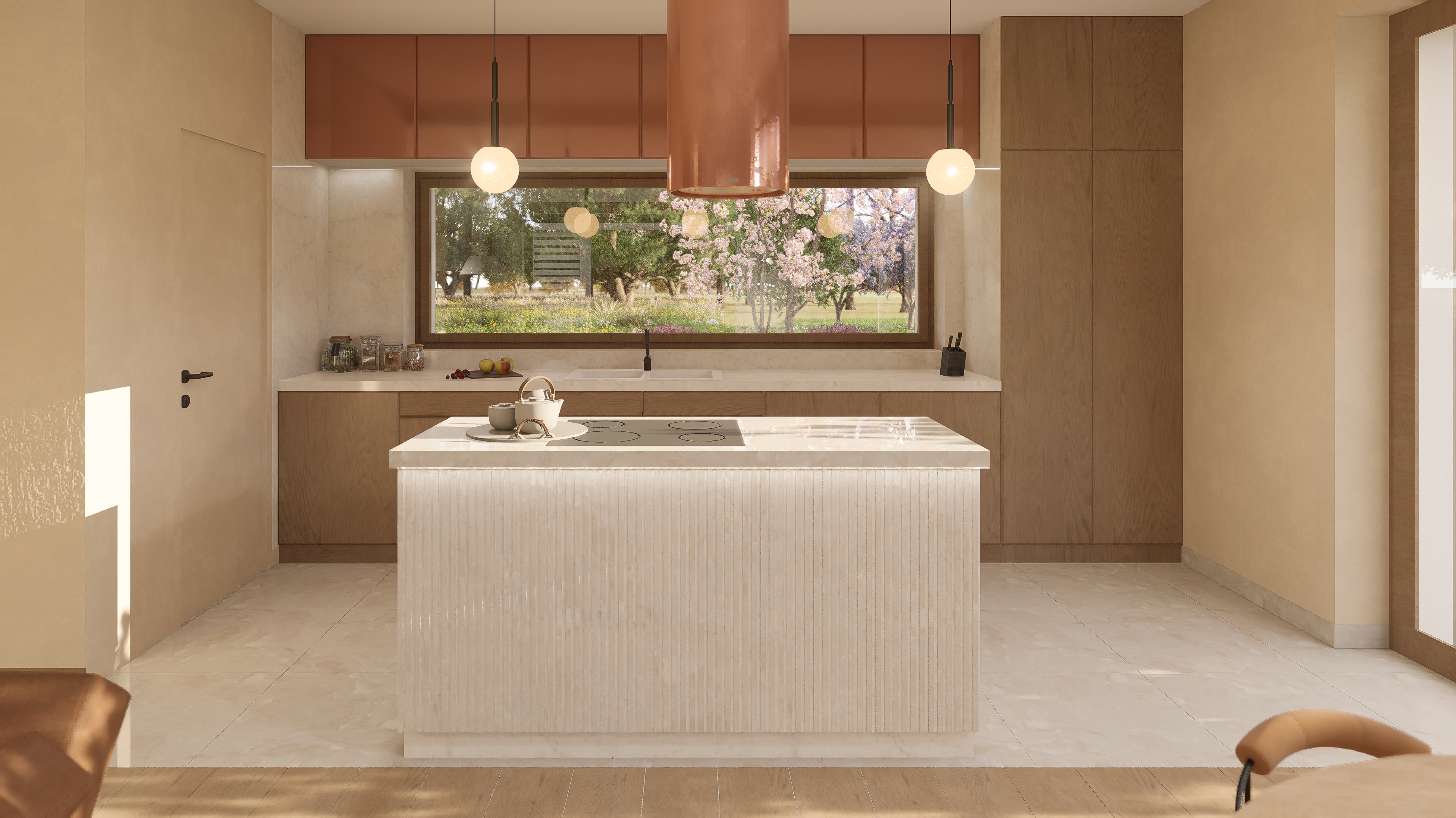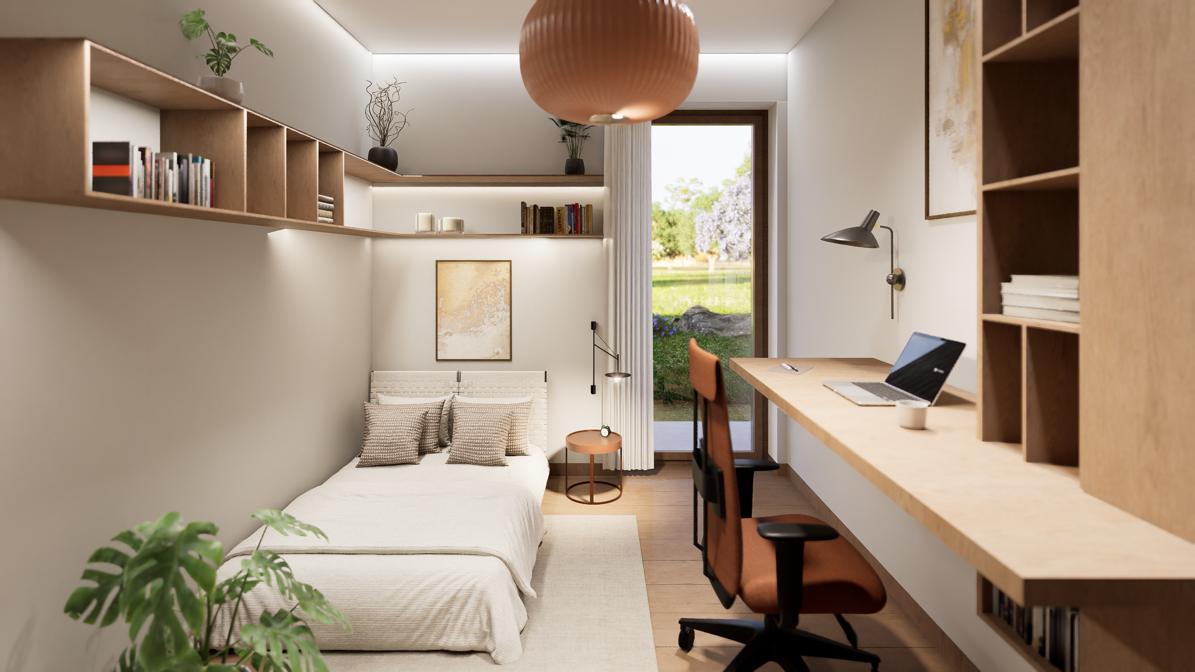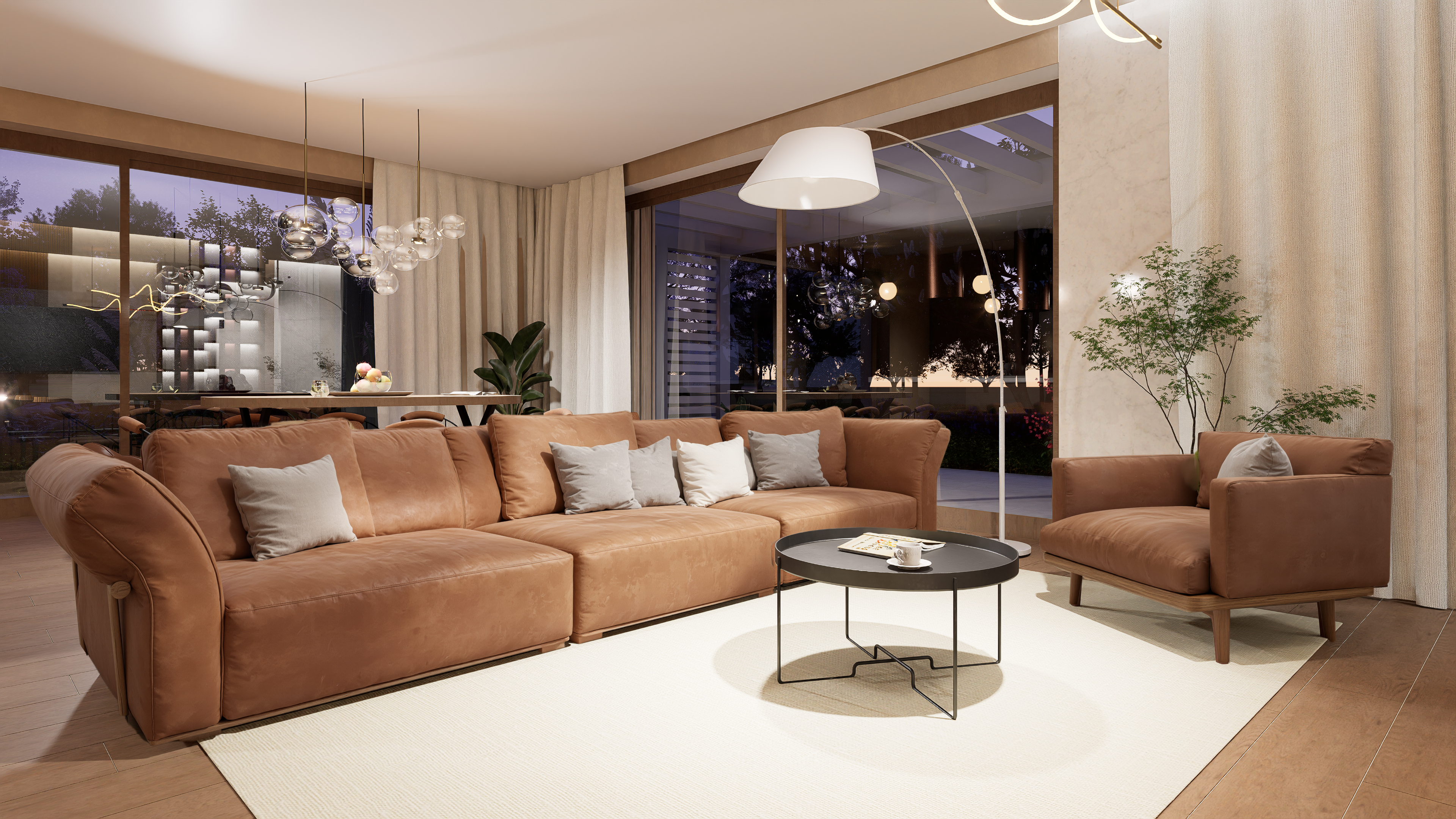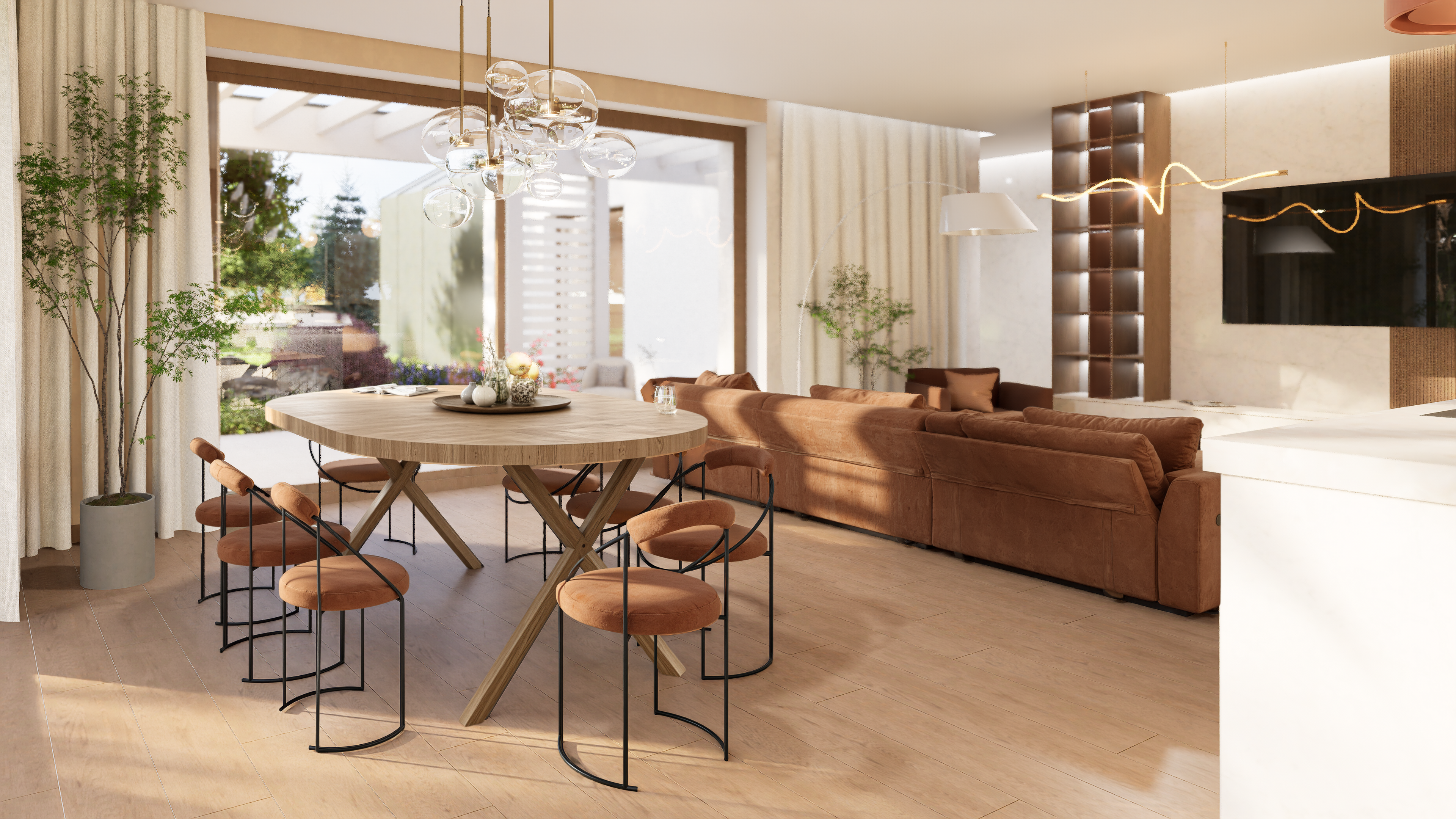 Dom Z566 oferuje 121,8 m² powierzchni użytkowej, na której zaplanowano nowoczesną strefę dzienną z otwartym salonem, jadalnią i kuchnią z wyspą. Duże przeszklenia otwierają wnętrze na ogród, zapewniając dostęp do naturalnego światła i płynne połączenie przestrzeni wewnętrznej z zewnętrzną. Wyjście na taras umożliwia swobodne korzystanie z uroków natury, a układ domu w literę L pozwala zorganizować przytulne, osłonięte patio.