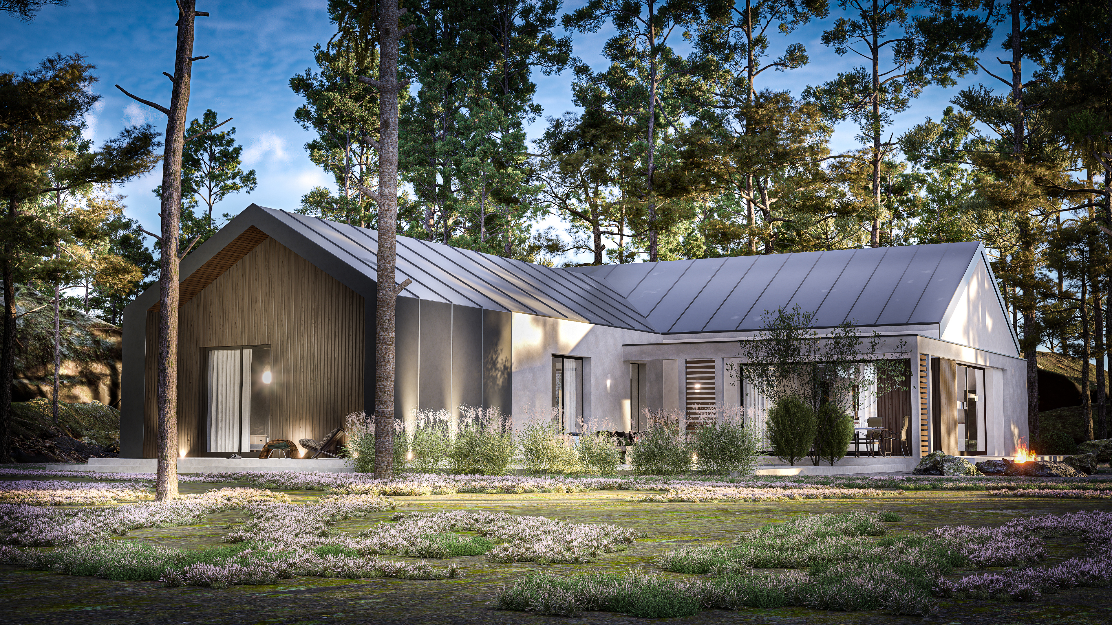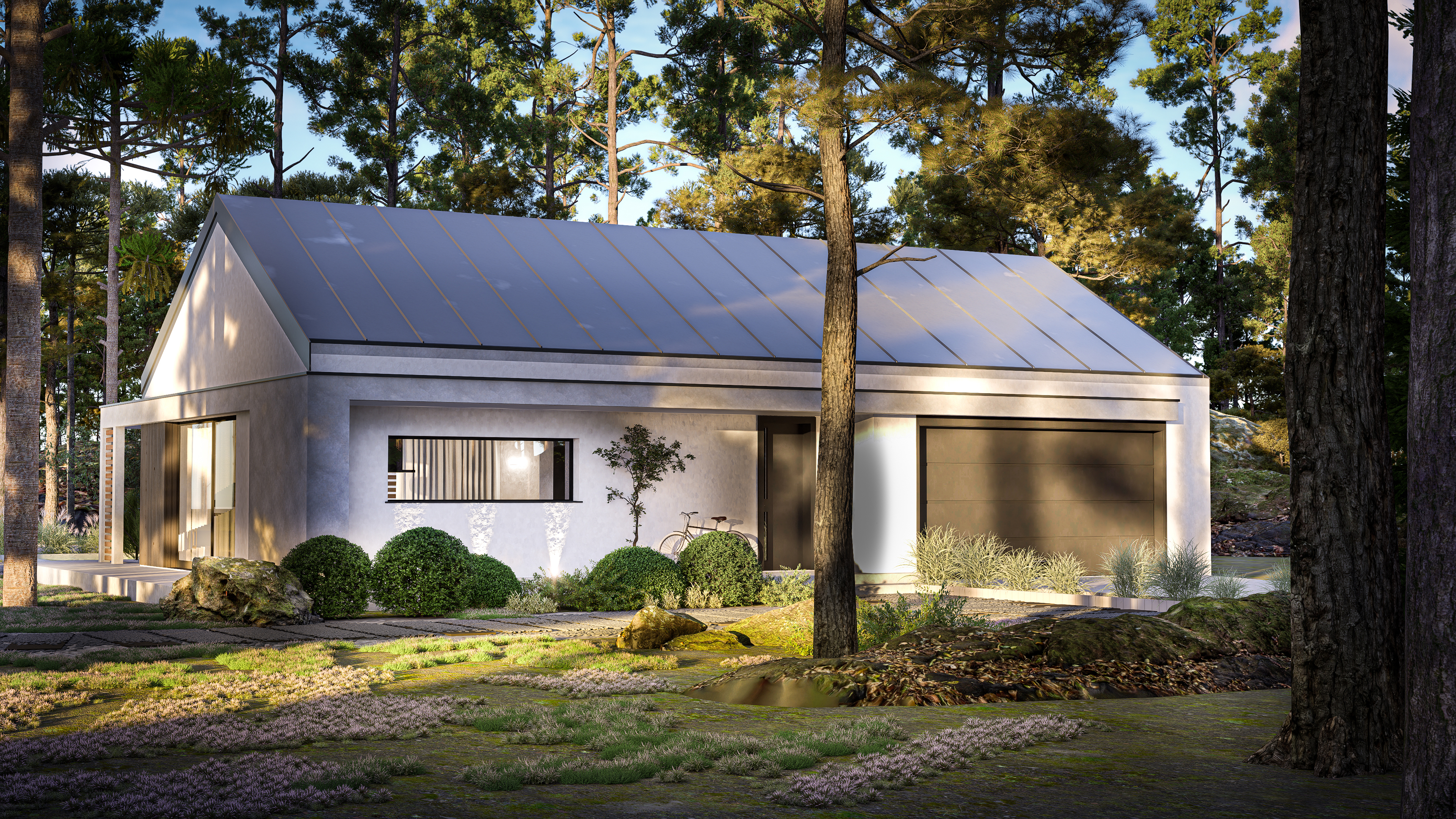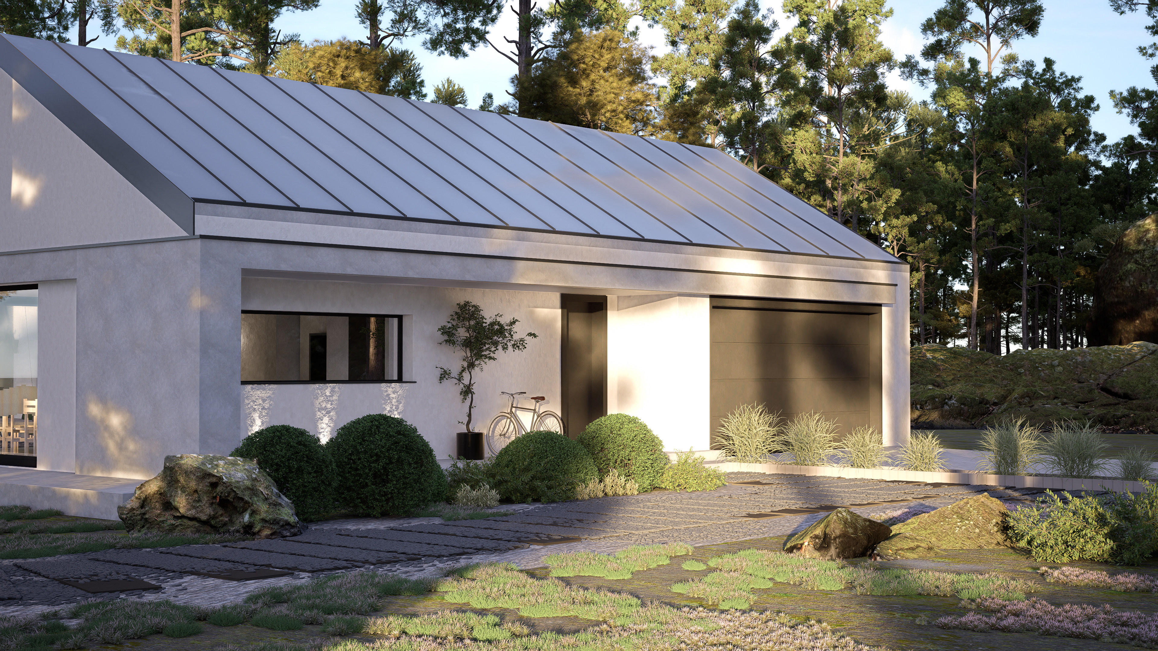 Integralną częścią bryły jest garaż dwustanowiskowy, dyskretnie wkomponowany w całość, co podkreśla nowoczesny, spójny charakter budynku. Prosta forma, naturalne materiały elewacyjne i duże okna tworzą dom idealnie wpisujący się w trend współczesnych stodół – funkcjonalnych, stylowych i ponadczasowych.