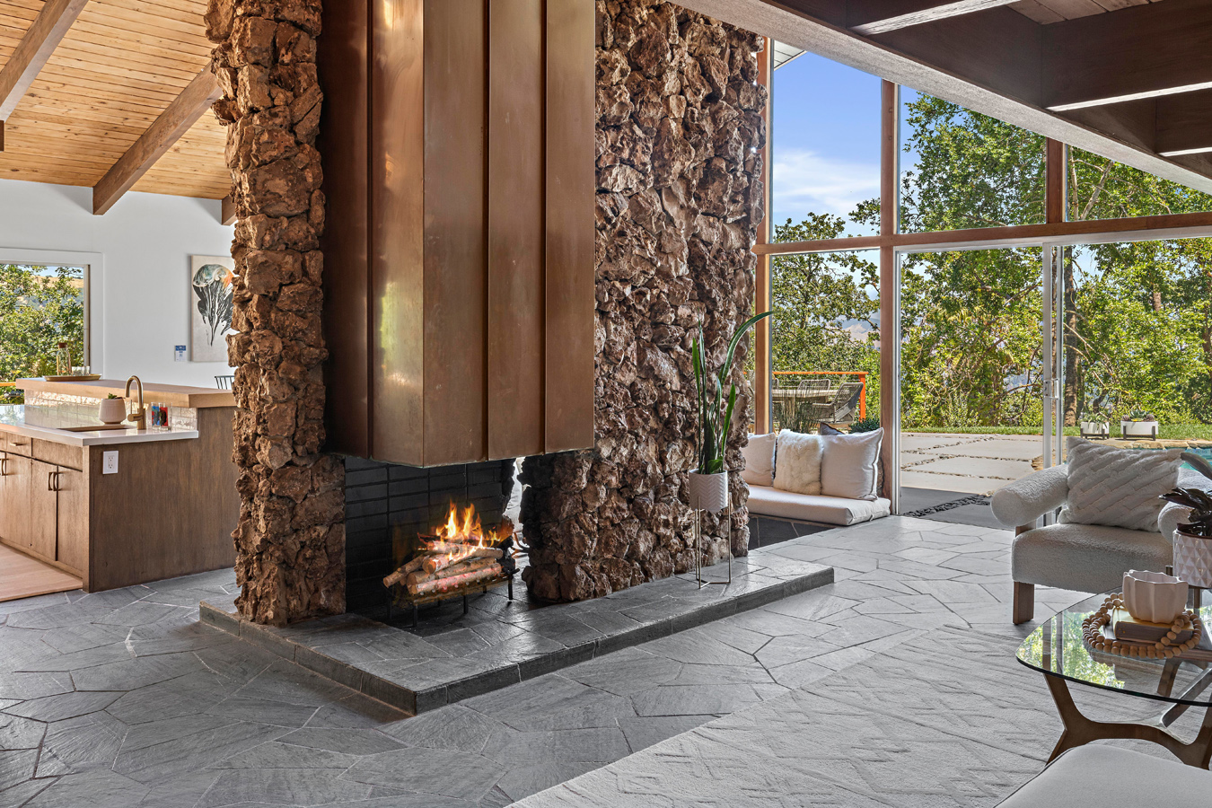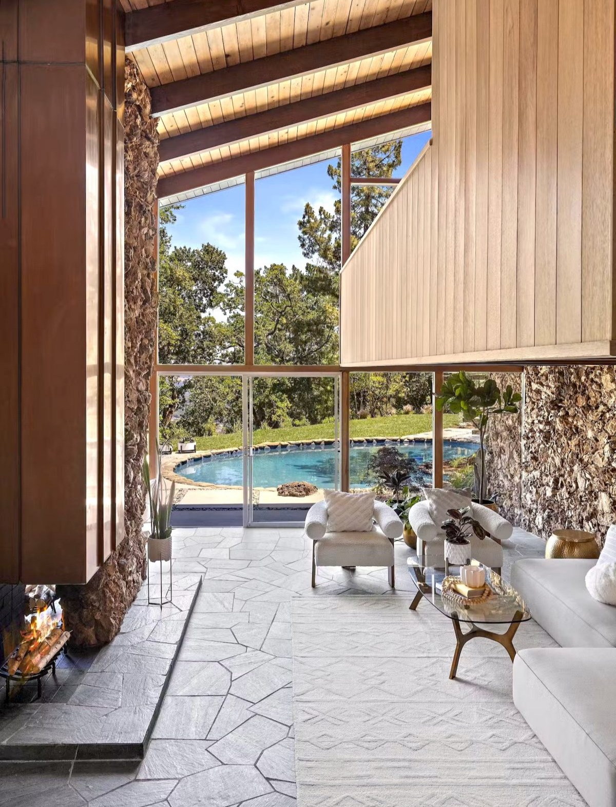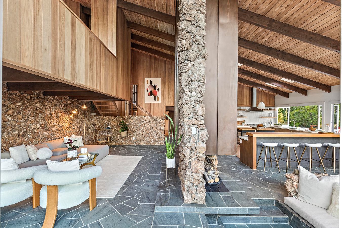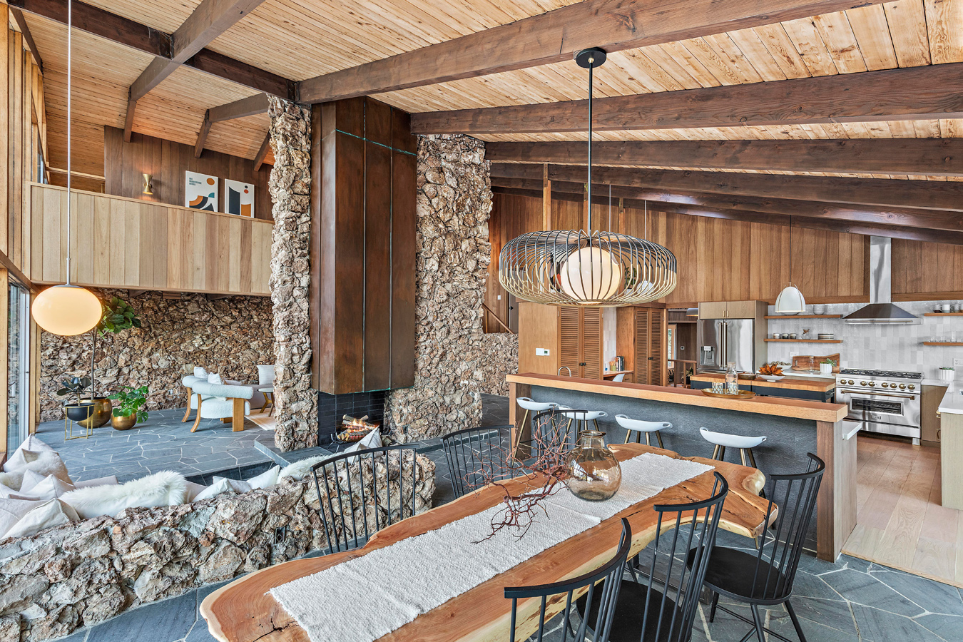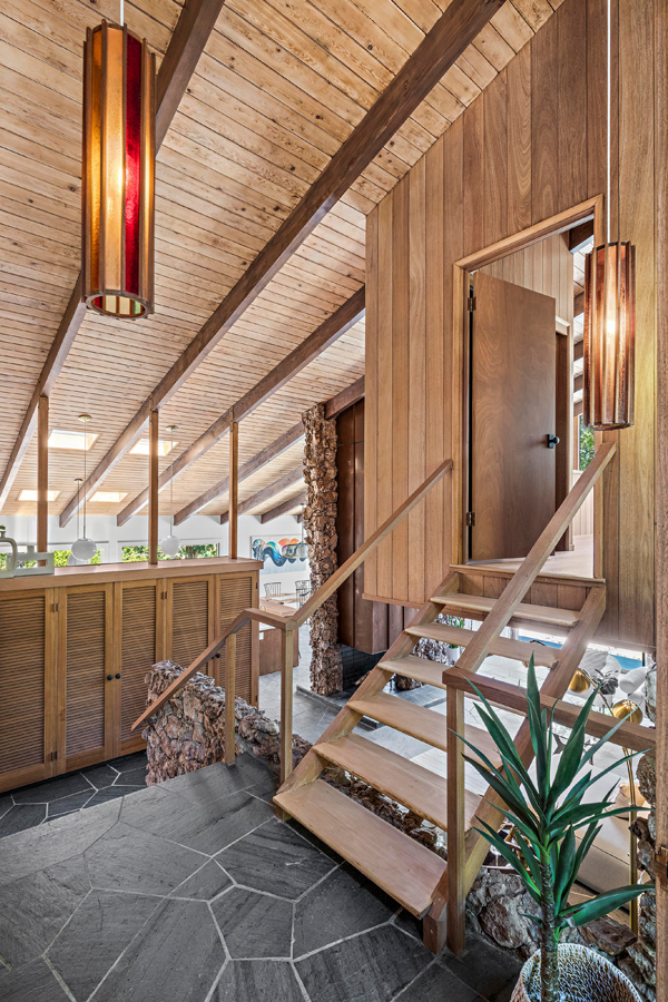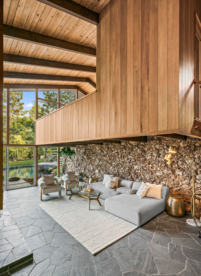 Z powierzchnią użytkową wynoszącą 295 m², rezydencja reprezentuje esencję estetyki epoki Mad Men, będąc jednocześnie przykładem tego, jak może wyglądać nowoczesna stodoła w stylu kalifornijskim. Niedawno dom został starannie odrestaurowany, zachowując oryginalny charakter przy jednoczesnym zastosowaniu współczesnych rozwiązań. Jednym z głównych atutów nieruchomości są rozległe przeszklenia od podłogi do sufitu, które otwierają wnętrze na spektakularny krajobraz. Klemmedson w mistrzowski sposób zintegrował przestrzenie wewnętrzne i zewnętrzne, prowadząc monumentalną wapienną ścianę od zen-przedsionka, przez salon z kamienną ścianą, aż do basenu na tyłach domu.