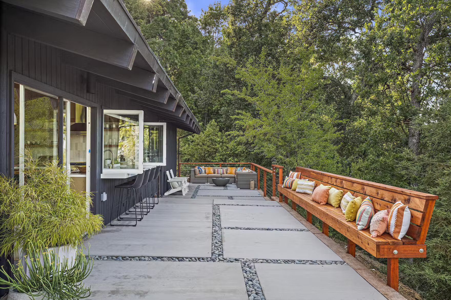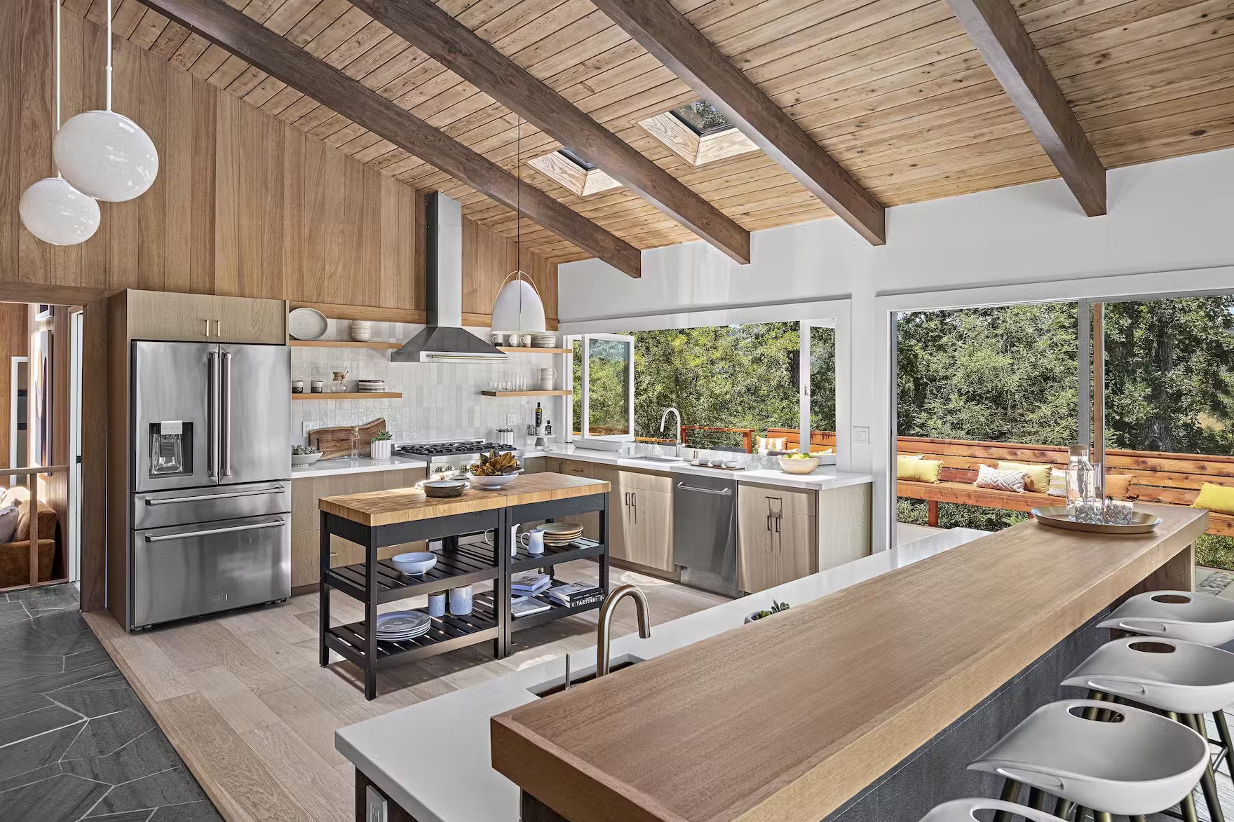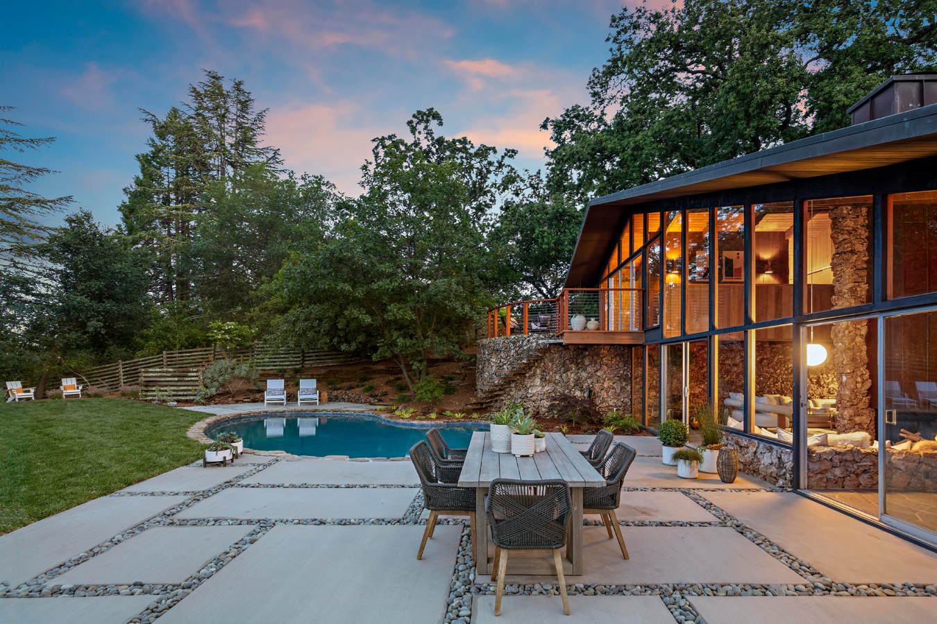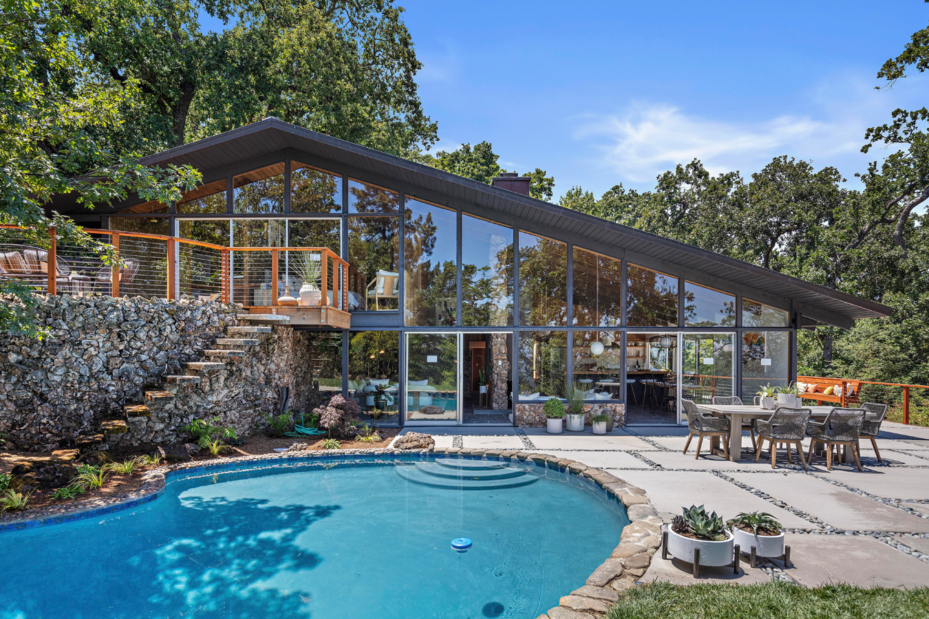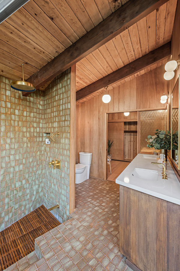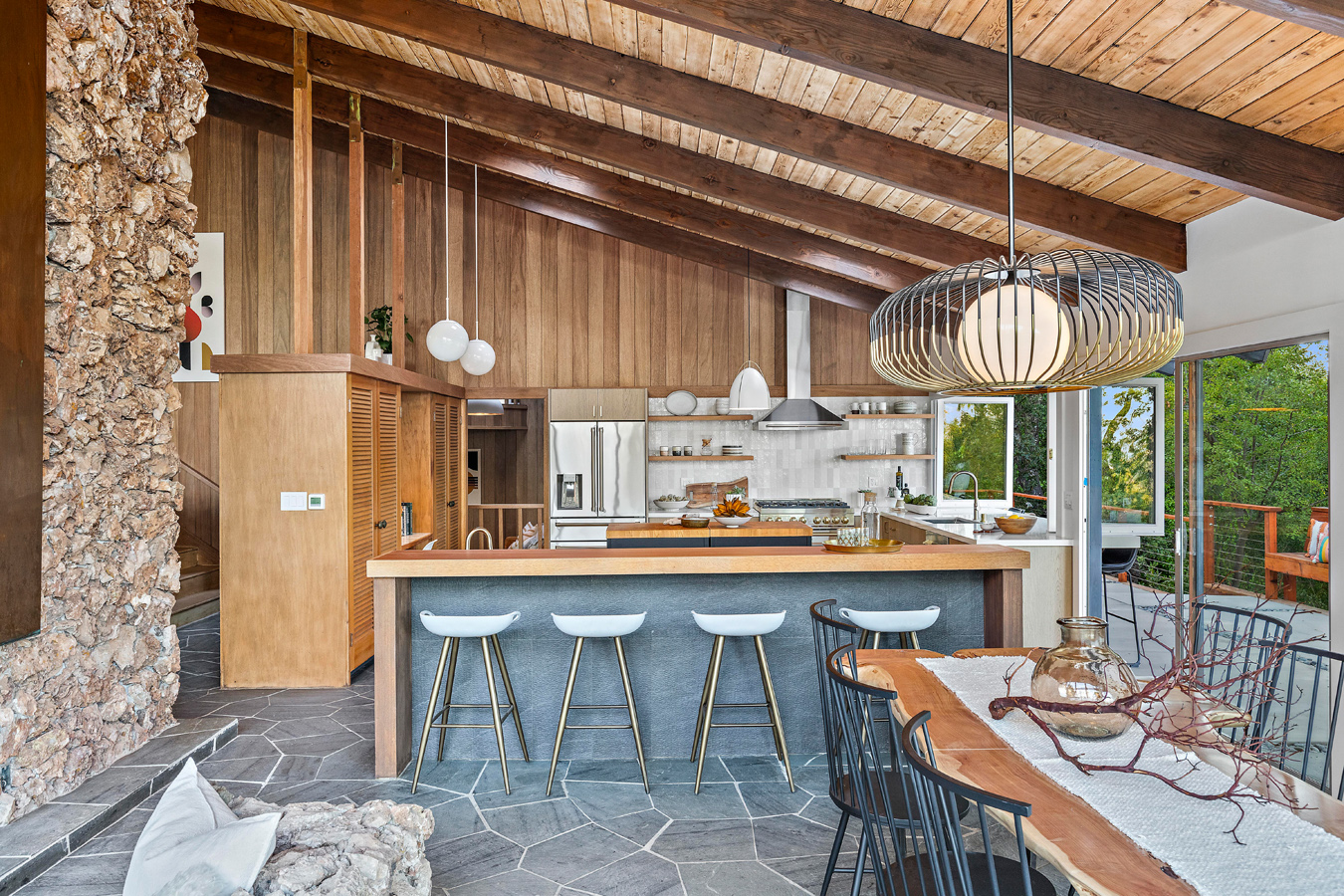 Z powierzchnią użytkową wynoszącą 295 m², rezydencja reprezentuje esencję estetyki epoki Mad Men, będąc jednocześnie przykładem tego, jak może wyglądać nowoczesna stodoła w stylu kalifornijskim. Niedawno dom został starannie odrestaurowany, zachowując oryginalny charakter przy jednoczesnym zastosowaniu współczesnych rozwiązań. Jednym z głównych atutów nieruchomości są rozległe przeszklenia od podłogi do sufitu, które otwierają wnętrze na spektakularny krajobraz. Klemmedson w mistrzowski sposób zintegrował przestrzenie wewnętrzne i zewnętrzne, prowadząc monumentalną wapienną ścianę od zen-przedsionka, przez salon z kamienną ścianą, aż do basenu na tyłach domu.