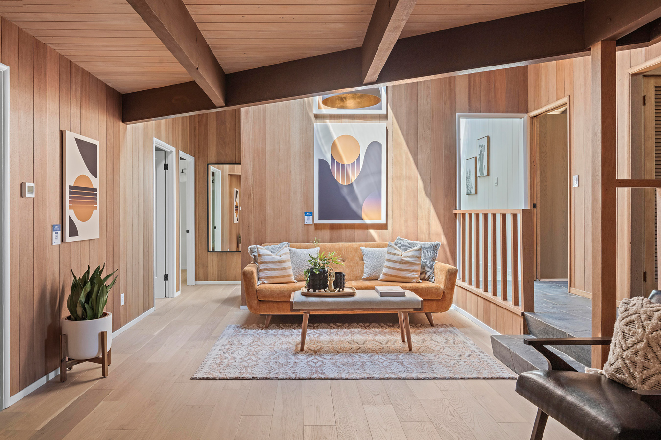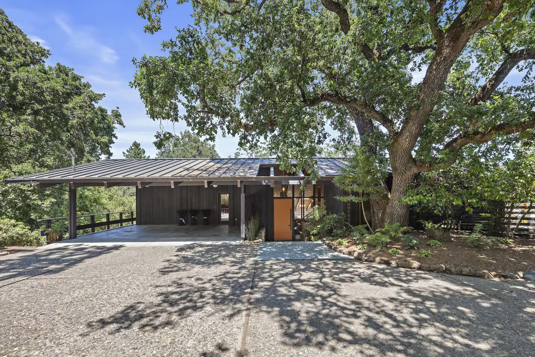 Gości wita szeroki, utwardzony podjazd prowadzący do jasnopomarańczowych drzwi wejściowych, które stanowią efektowny akcent. Wewnątrz zachowały się oryginalne detale, takie jak łupkowe podłogi z ogrzewaniem, mahoniowe boazerie oraz unikalna kamieniarka, które dopełniają klimat luksusowego mid-century modern home.
