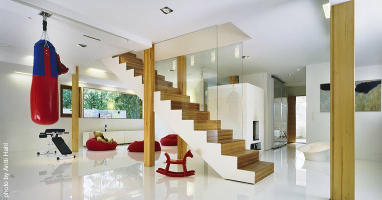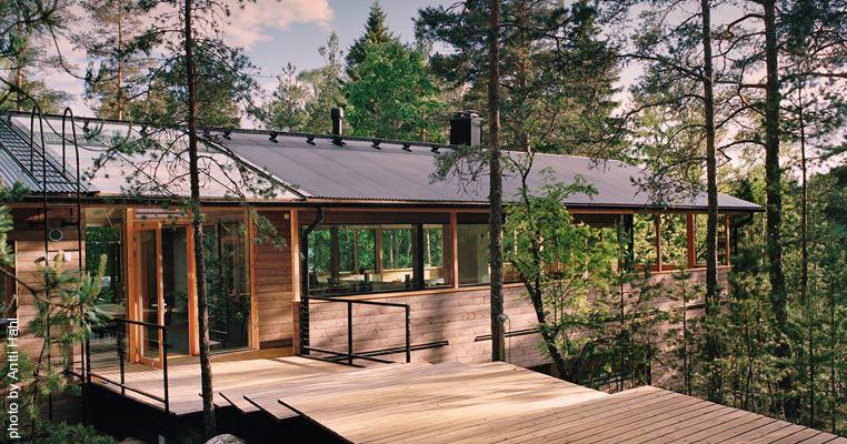Dom zlokalizowany w północnej części Espoo w Finlandii, na zachodnim, skalistym zboczu, powstał w miejscu o dużym znaczeniu historycznym i kulturowym, gdzie dominują tereny rolnicze i przemysłowe oraz naturalny, fiński las. Prosta bryła z dwuspadowym dachem jest bezpośrednią odpowiedzią na lokalny kontekst architektoniczny i krajobrazowy. Przemyślany podział działki pozwolił stworzyć zróżnicowane przestrzenie zewnętrzne: od strony wejścia zaplanowano plac zabaw dla dzieci, taras idealny na codzienne posiłki oraz warsztat, natomiast główny budynek łączy funkcję mieszkalną i biurową wokół wspólnej strefy dziennej. Całość uzupełnia wolnostojąca sauna, wzmacniająca relację domu z naturą i fińską tradycją. W tej oszczędnej formie łatwo dostrzec ideę, jaką reprezentuje nowoczesna stodoła – funkcjonalną, prostą i silnie zakorzenioną w miejscu.