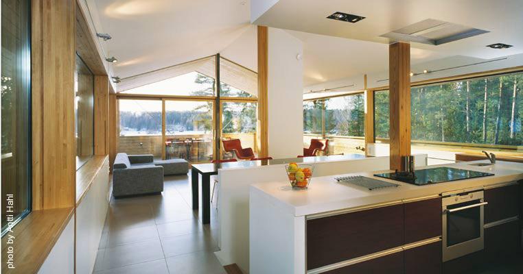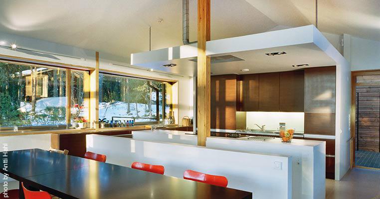 Konstrukcję domu zaprojektowano jako wentylowaną, drewnianą strukturę, częściowo zakotwiczoną bezpośrednio w skale, co ogranicza ingerencję w teren. Do budowy wykorzystano laminowane drewno klejone oraz sklejkę, a wszystkie materiały pochodzą głównie z lokalnych, fińskich źródeł. Wysoką efektywność energetyczną zapewnia ocieplenie z celulozy, ogrzewanie geotermalne oraz kominki we wnętrzach. Dzięki temu dom łączy ekologiczną architekturę, trwałość i niski ślad środowiskowy z estetyką skandynawskiego minimalizmu, bliską idei nowoczesnej stodoły osadzonej w surowym, północnym krajobrazie.