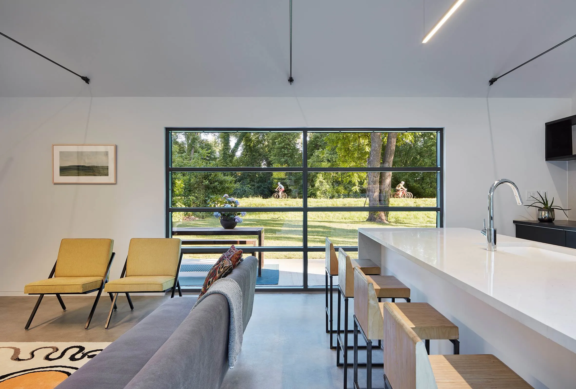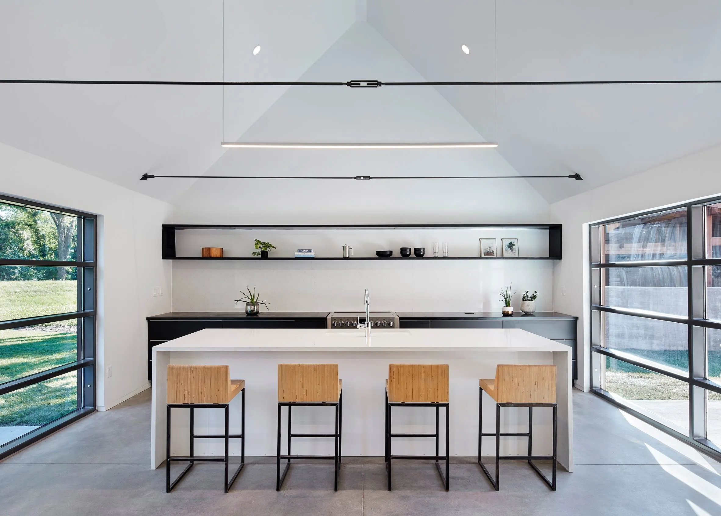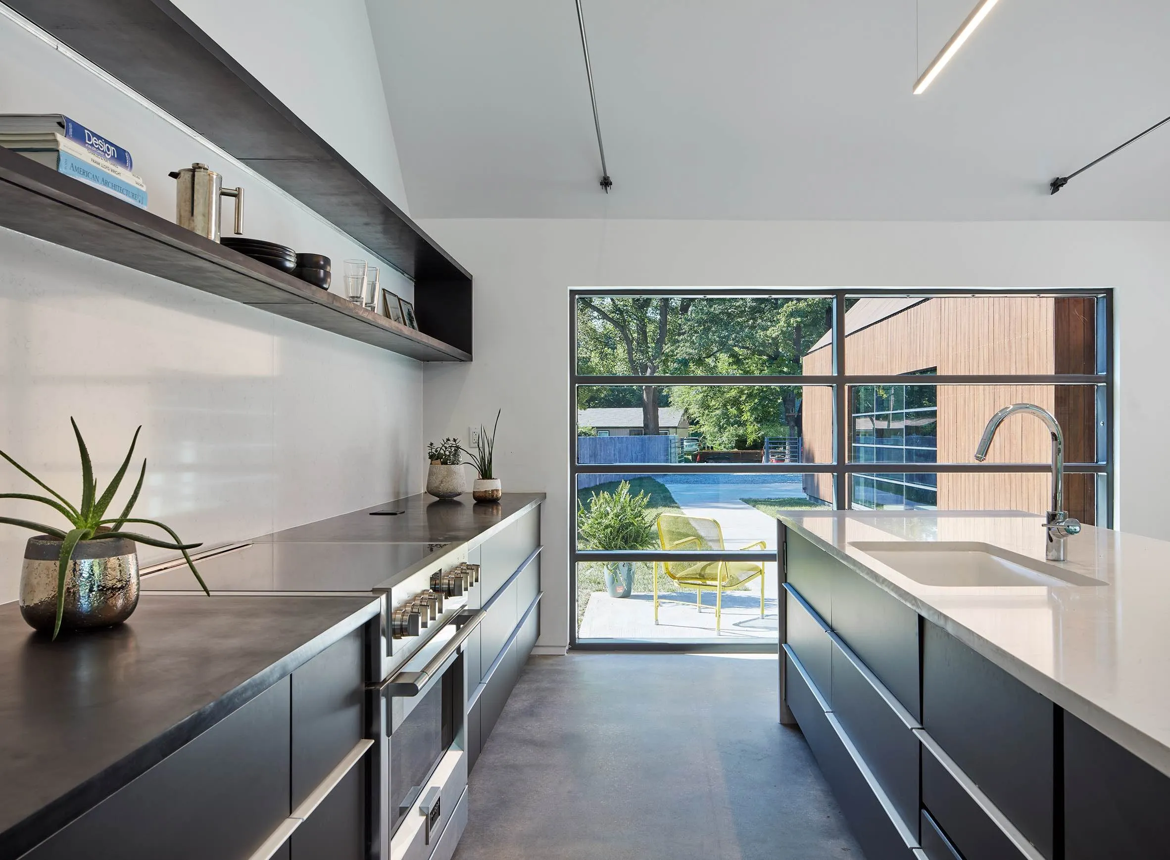 W środku zastosowano oszczędne, trwałe wykończenia. Polerowane posadzki betonowe, malowane płyty gipsowe oraz zabudowy kuchenne oparte na modułach IKEA z blatami i frontami z materiału Richlite tworzą neutralne tło dla codziennego życia. Przestrzenie są jasne, funkcjonalne i łatwe w adaptacji.