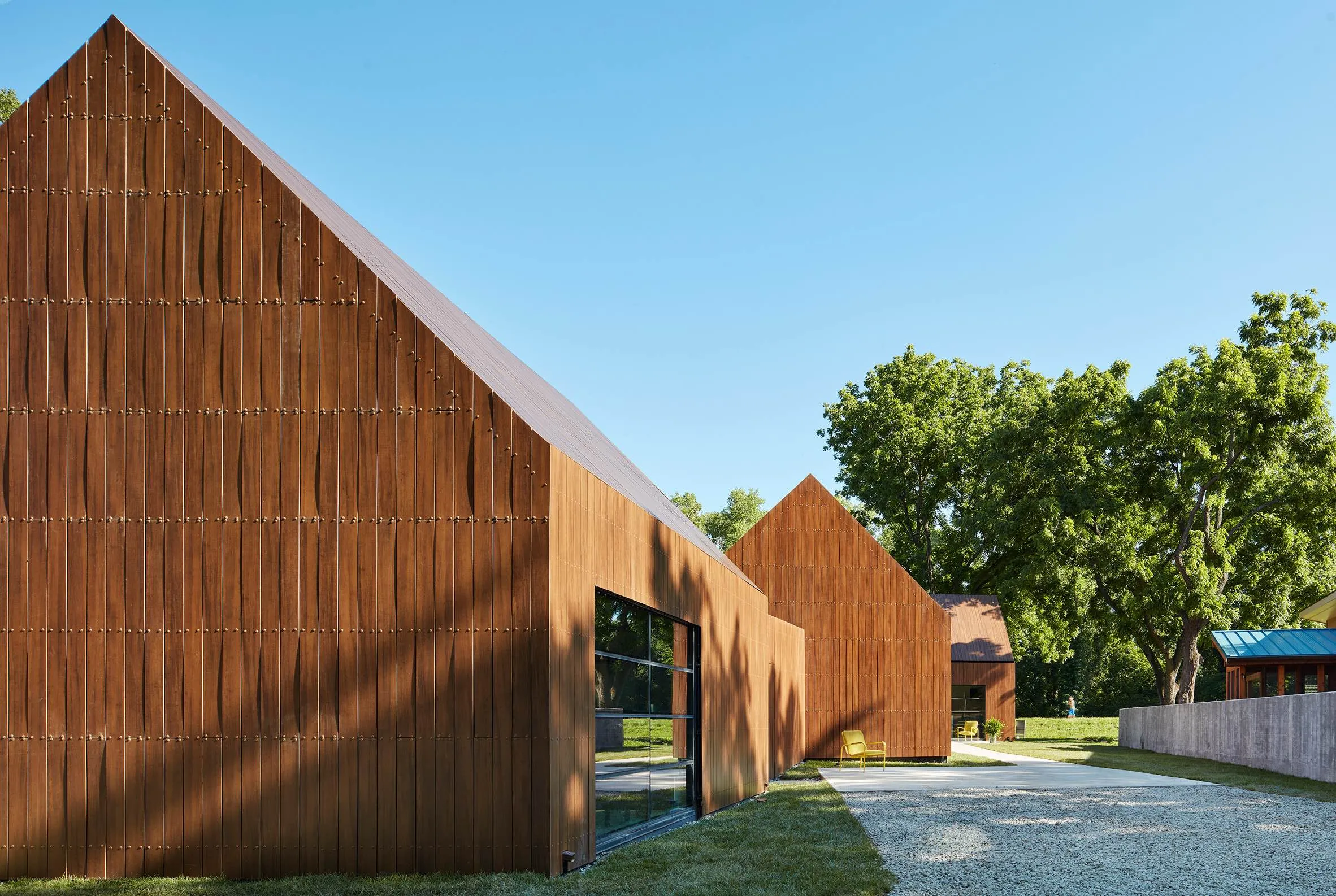 Konstrukcję wszystkich brył wykonano w technologii szkieletu drewnianego. Ściany i dachy pokryto ciągłą okładziną z żywicy fenolowej – materiału wybranego ze względu na trwałość i odporność na intensywne słońce Kansas. Jednolita, nieblaknąca powierzchnia spaja różne wolumeny w jeden architektoniczny organizm i podkreśla ich abstrakcyjny charakter.