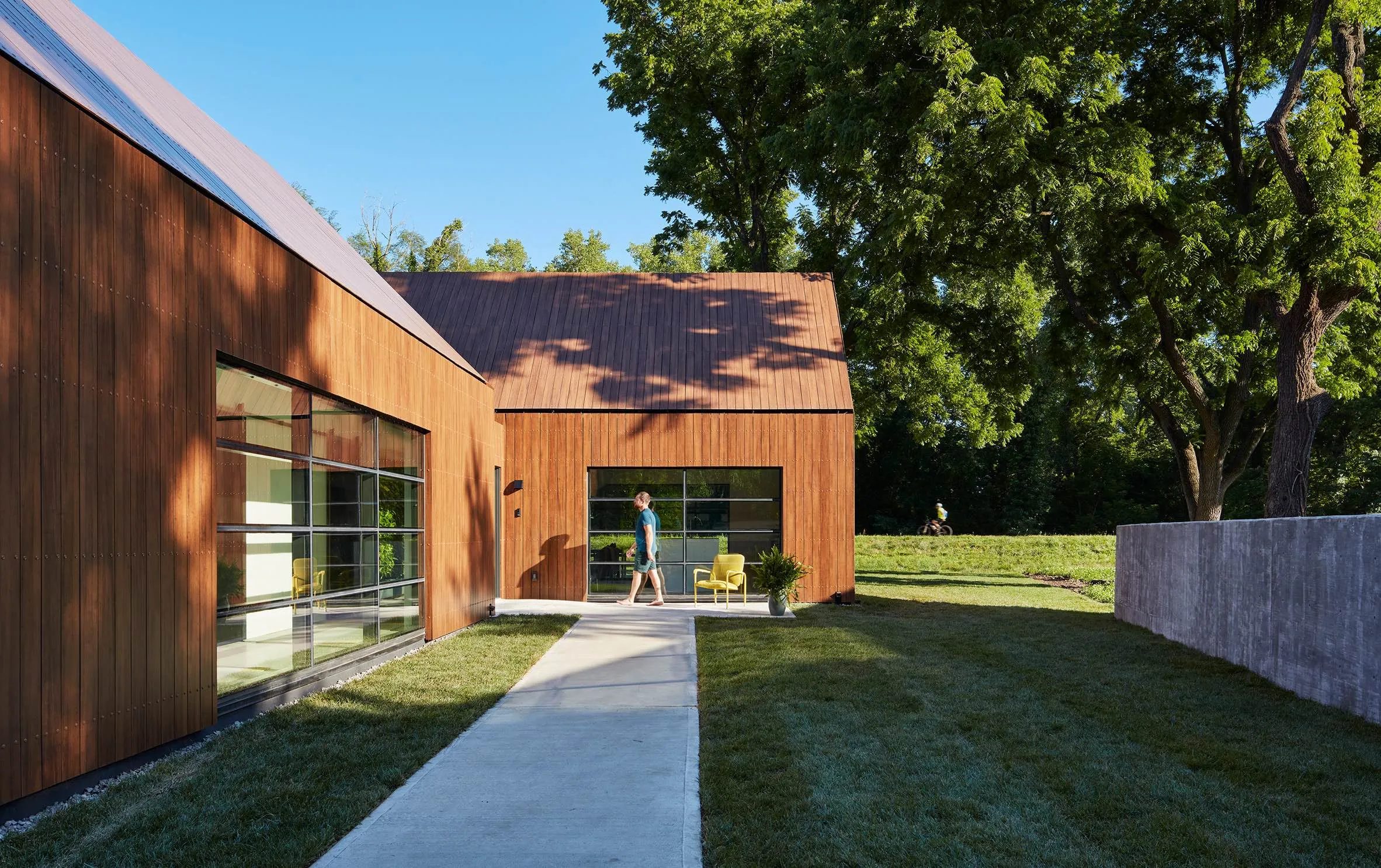 722 Ash Street to dom jednorodzinny z dodatkową jednostką mieszkalną ADU, zrealizowany w mieście Lawrence w północno-wschodnim Kansas. Projekt powstał w strefie przejściowej, gdzie miejska tkanka stopniowo ustępuje krajobrazowi rolniczemu – w sąsiedztwie rzeki Kansas, linii kolejowych, silosów zbożowych i dużych drzew. Architektura świadomie reaguje na ten kontekst, czerpiąc z lokalnej tradycji farmstead, a jednocześnie odpowiadając na współczesne potrzeby mieszkaniowe.