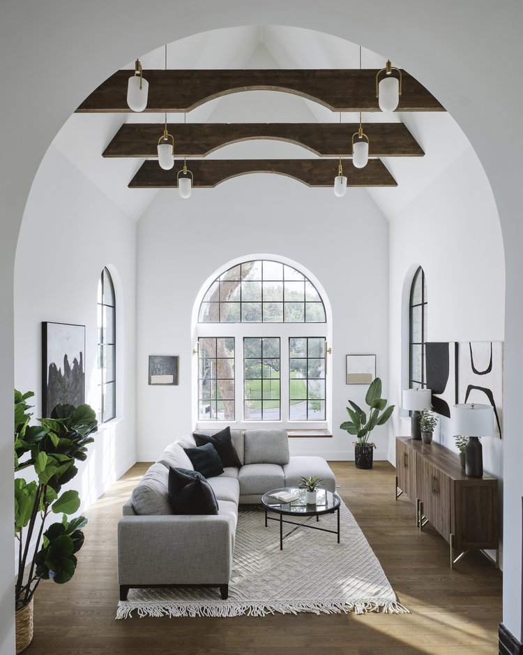 Dom charakteryzuje się eleganckimi łukowymi oknami, przestronnymi drzwiami oraz strzelistymi sufitami z odsłoniętymi belkami stropowymi, co nadaje mu wyjątkowy, luksusowy charakter. Wnętrza zostały wzbogacone o panele ścienne i przestronny balkon, które dodają domu elegancji i przestronności. Każdy detal projektu został zaprojektowany z myślą o najwyższej jakości i estetyce, co sprawia, że przestrzeń łączy tradycyjny urok z nowoczesną funkcjonalnością.