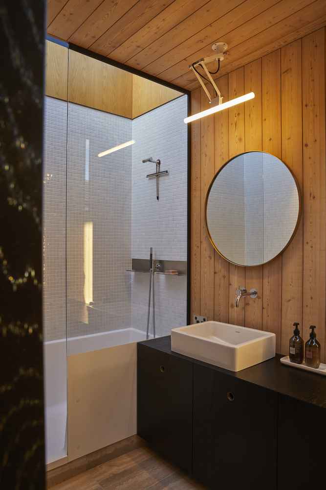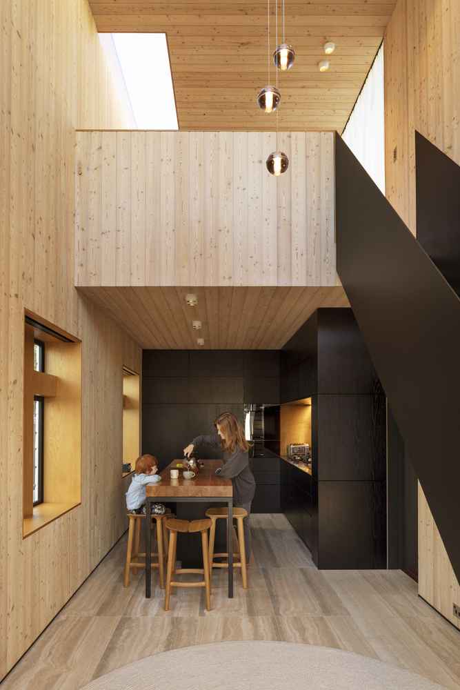 Architekci zastosowali praktyczne i energooszczędne rozwiązania, takie jak nowe ocieplenie dachu, wysokiej jakości stolarka okienna, system odzysku ciepła, podgrzewanie wody energią słoneczną oraz naturalne, ekologicznie pozyskiwane materiały. Na parterze powstała nowa, jasna kuchnia połączona z otoczeniem zewnętrznym, a nad jadalnią usunięto stropy, uzyskując imponującą wysokość wnętrza i większe poczucie przestrzeni. Na piętrze zaprojektowano nową sypialnię oraz apartament właścicieli z wyjściem na taras urządzony na dachu.