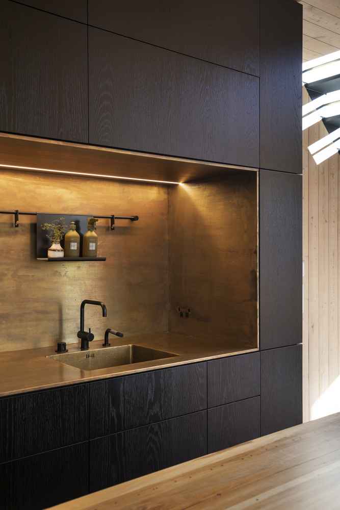 Nowa przybudówka stanowi wyraźny, ale świadomy kontrast dla istniejącego domu – ingerencja w pierwotną bryłę została ograniczona do minimum, obejmując jedynie usunięcie dwóch ścian i fragmentu dachu. Prosta, wysunięta forma wykończona aluminiowymi panelami podkreśla współczesny charakter rozbudowy, a starannie rozmieszczone okna kadrują widoki na okoliczne wzgórza. We wnętrzach zastosowano ciepłą paletę materiałów: podłogi z trawertynu, modrzewiowe deski na ścianach i sufitach oraz dębowe elementy z detalami z brązu, tworząc spójną i ponadczasową przestrzeń codziennego życia.
