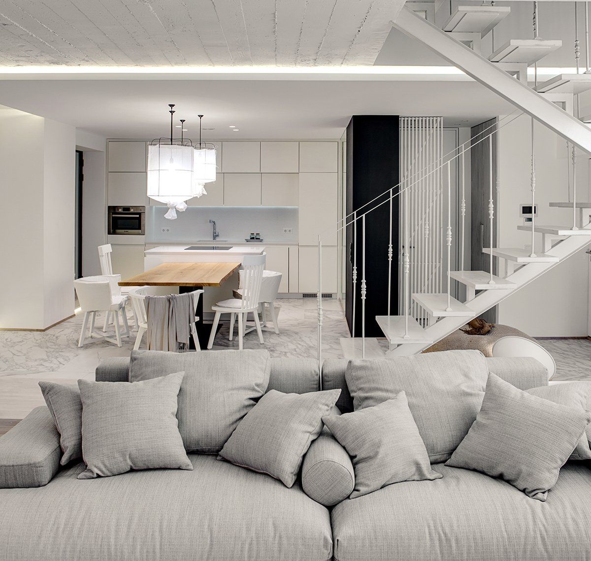 Przemyślany projekt wnętrza sprawia, że nawet przy ograniczonej liczbie okien przestrzeń jest jasna i przestronna, głównie dzięki starannie zaplanowanemu oświetleniu. Każde pomieszczenie posiada indywidualnie zaprojektowane lampy – od drucianych opraw owiniętych białym płótnem, przez ceramiczne i patynowe lampy, aż po kreatywne rozwiązania DIY z butelkami. Centralnie umieszczone schody z delikatną balustradą i pojedynczym dźwigarem podkreślają lekkość bryły, a ściana z otoczaków oraz nisza z drewnem kominkowym wprowadzają wyjątkową fakturę i naturalny charakter do nowoczesnego wnętrza.