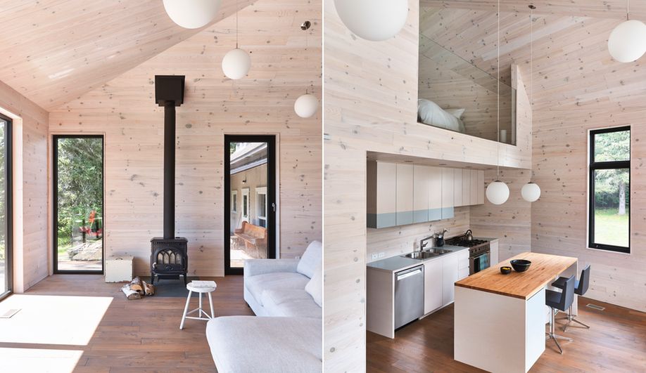 Forma dachu odegrała kluczową rolę w integracji nowego budynku z otoczeniem i starszym domem. Od strony zachodniej i południowej dach został wydłużony, skracając wizualnie ściany zewnętrzne i harmonizując proporcje obu obiektów, natomiast od wschodu i północy unosi się wyżej, nawiązując do linii drzew oraz smukłej wieży pobliskiego kościoła. Układ dachu wpłynął również na organizację wnętrza, pozwalając na wydzielenie dodatkowej sypialni pod połacią. Na parterze zaprojektowano kuchnię z jadalnią, salon oraz sypialnię z łazienką, a jasne sosnowe ściany zestawiono z ciemniejszymi drewnianymi podłogami, subtelnie rozpraszając światło. Nowa część nie dominuje w krajobrazie, lecz współistnieje z nim, podczas gdy „starsza siostra”, pełniąca dziś funkcję domku gościnnego, pozostaje świadkiem historii tego miejsca – razem tworząc architektoniczny symbol ciągłości i jedności.