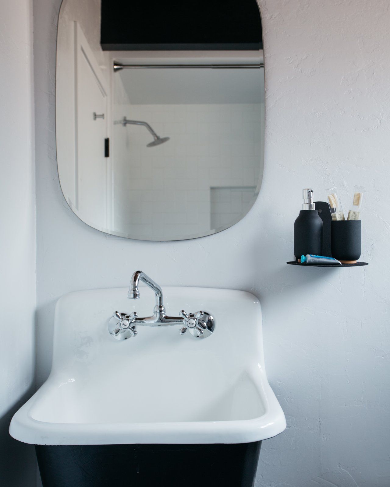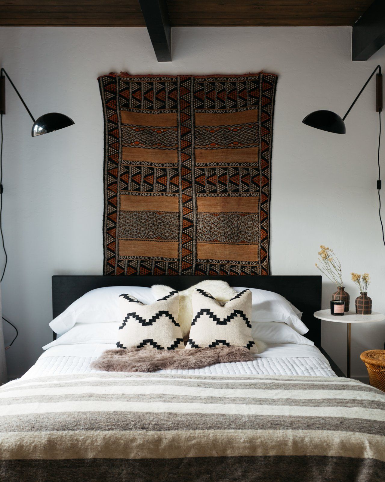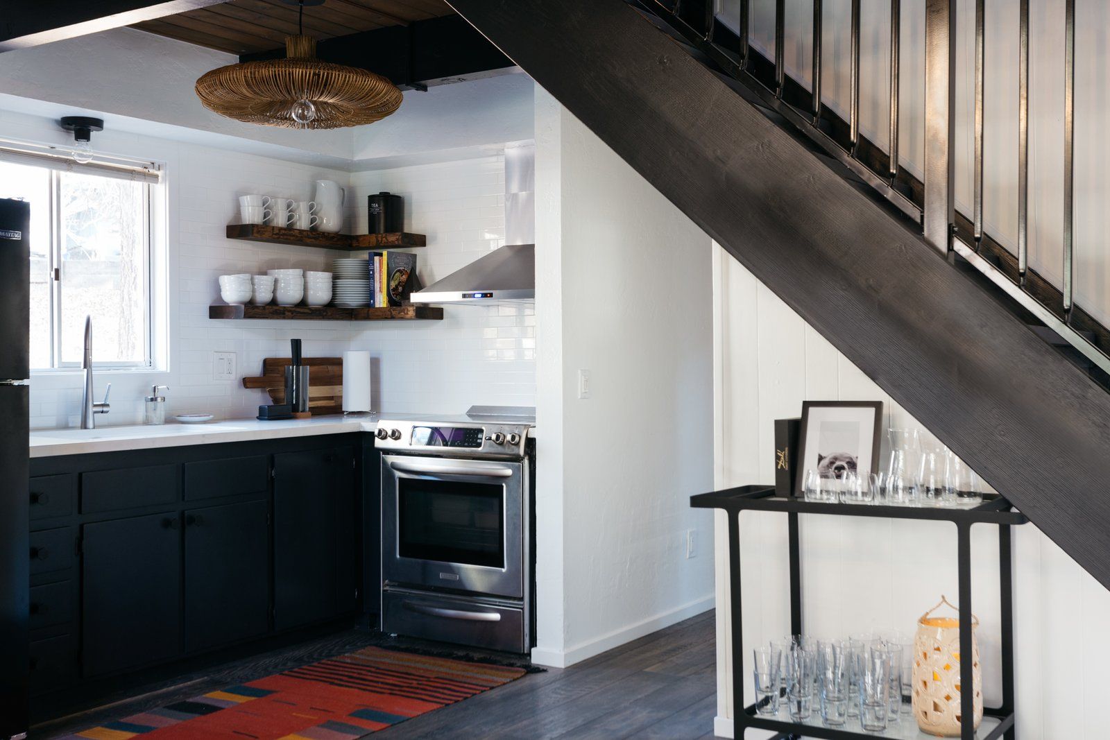 Kanciasta bryła o dwóch trójkątach została pomalowana odcieniem ciemnego brązu, który pasuje do otaczających dom drzew. Podobnym kolorem pomalowano duże belki konstrukcyjne wewnątrz, które dzięki temu wydają się nieco chować w ścianach i sufitach. W salonie drewniane belki pomalowano na głęboki, hebanowy kolor, stając się pięknym detalem. W kuchni pozostawiono drewniane szafki, ponieważ nie było czasu i pieniędzy na ich wymianę. Dołożono za to nowe półki, zmieniono sprzęty i płytki na ścianie, dzięki czemu kąt nabrał lekkości. Sypialnie mają inną „osobowość” niż przestrzenie wspólne. Jeśli salon uznamy za wyszukany, sypialnie można uznać za nieco artystyczne i sprzyjające wypoczynkowi. Wprowadzono tam więcej światła i zrównoważono je minimalistyczną łazienką.