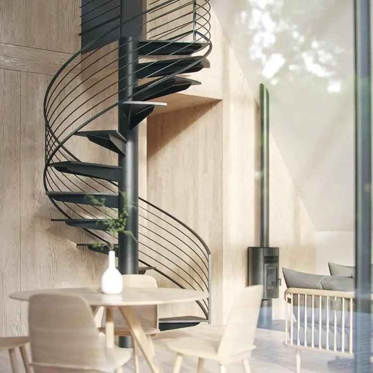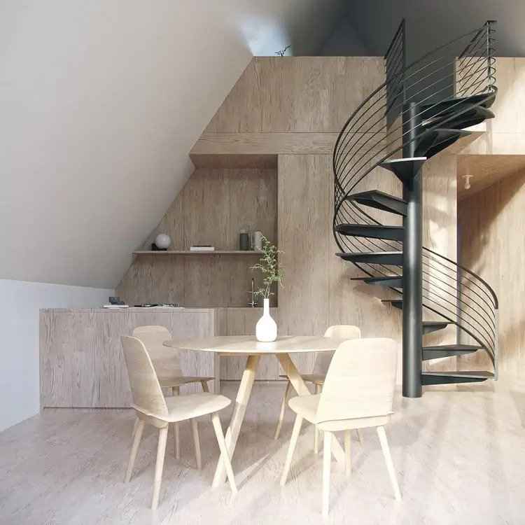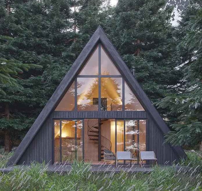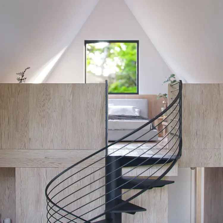 Mimo niewielkich rozmiarów, A-Frame Retreat zaskakuje efektywnym wykorzystaniem przestrzeni. W centralnym punkcie domku znajdują się spiralne schody prowadzące do sypialni na antresoli, z której rozciąga się zachwycający widok na leśne krajobrazy. Strzelista bryła pozwala na piętrowe rozmieszczenie pomieszczeń, oddzielając strefę dzienną od nocnej i tworząc wrażenie przestronności. Z kolei duże przeszklenia wpuszczają naturalne światło i otwierają wnętrze na naturę, potęgując poczucie spokoju i bliskości z otoczeniem.