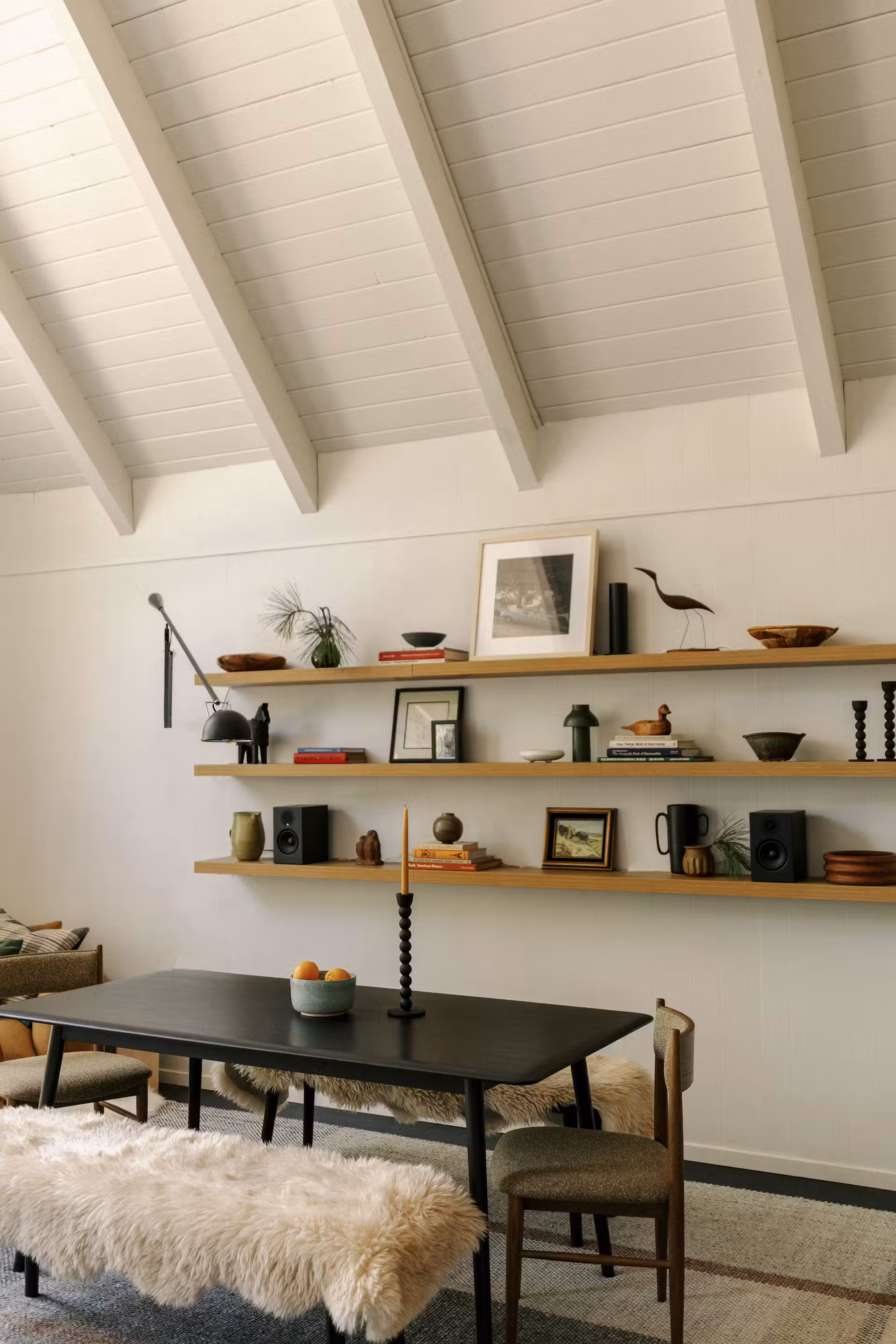 Ponad 100 płyt winylowych, starannie wyszukanych w sklepach w Los Angeles, dodaje domowi artystycznej duszy. Kolekcja obejmuje eklektyczny wybór nagrań – od Delta blues i jazzu po folkowe brzmienia, w tym albumy Joe Bataan, Howlin’ Wolf, Steve Miller, Stan Getz i Bill Evans. Całość dopełnia nowoczesny system nagłośnienia, który rozprowadza muzykę po całym domu.