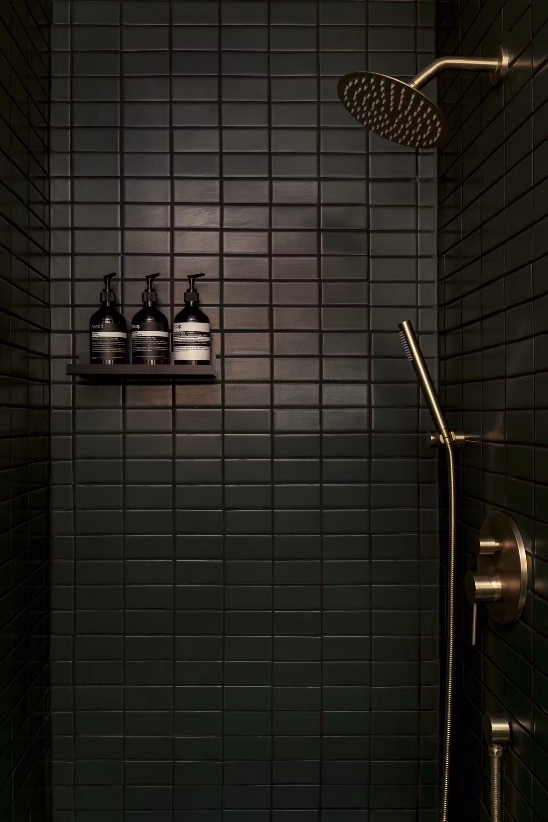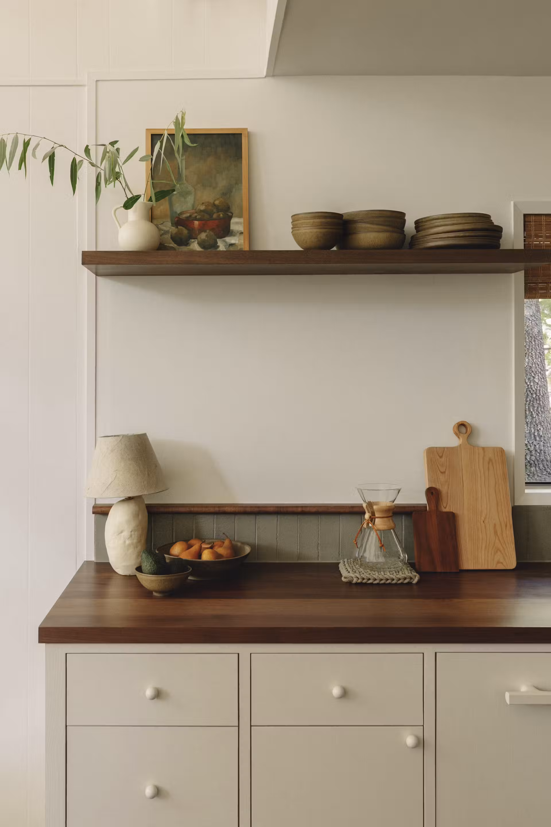 - Ciepły odcień Morning Ritual od Backdrop, który subtelnie kontrastuje z ciemną podłogą z sękatego drewna i blatami z orzecha,