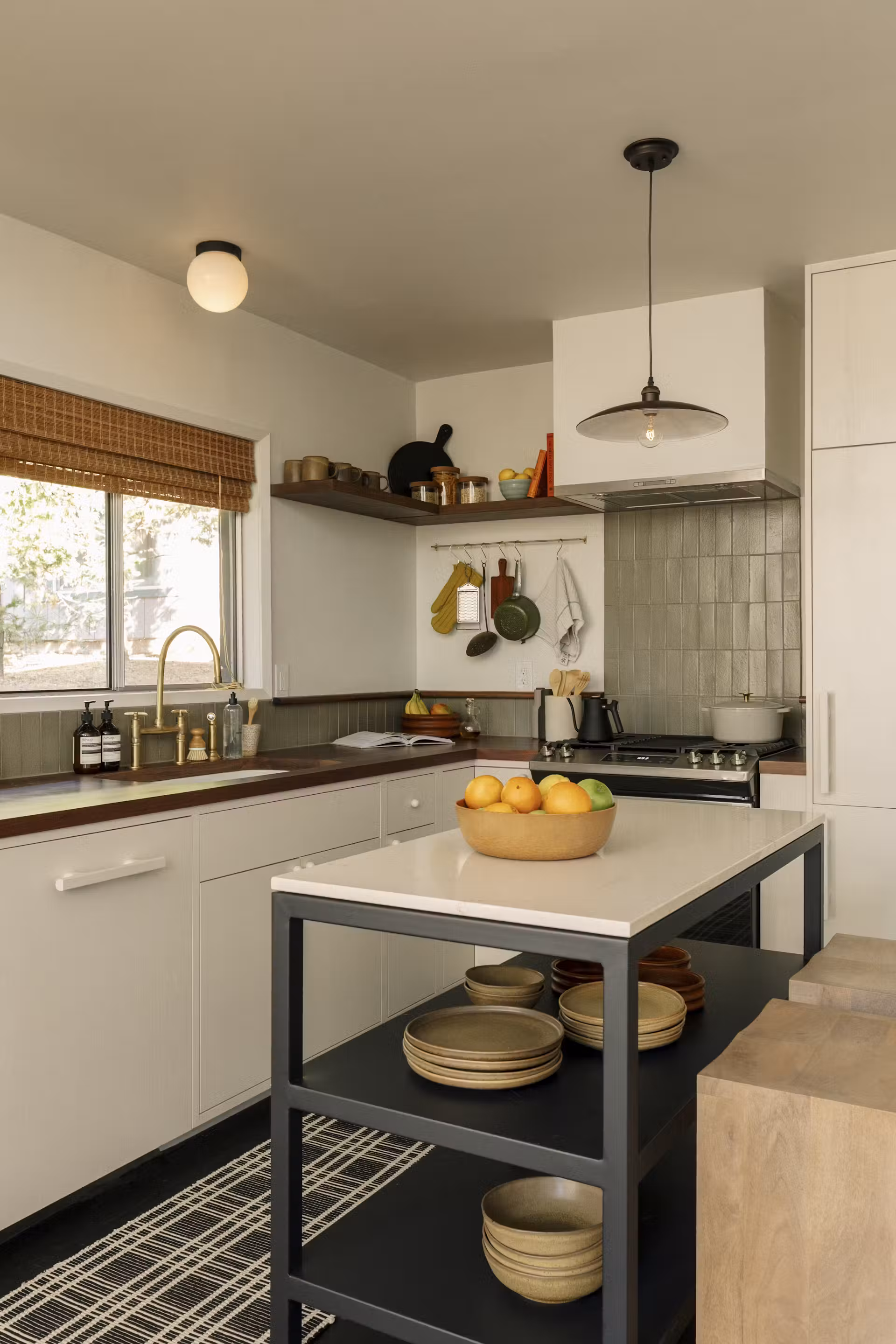 - Centralną wyspę z kwarcowym blatem, w której umieszczono porcelanowy zlew i ręcznie wykonaną mosiężną baterię z Etsy, nadającą wnętrzu unikalnego charakteru.